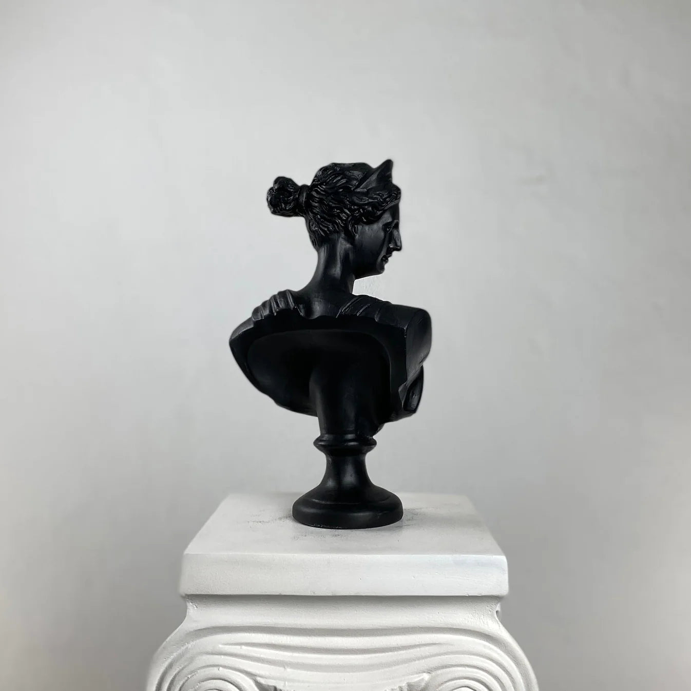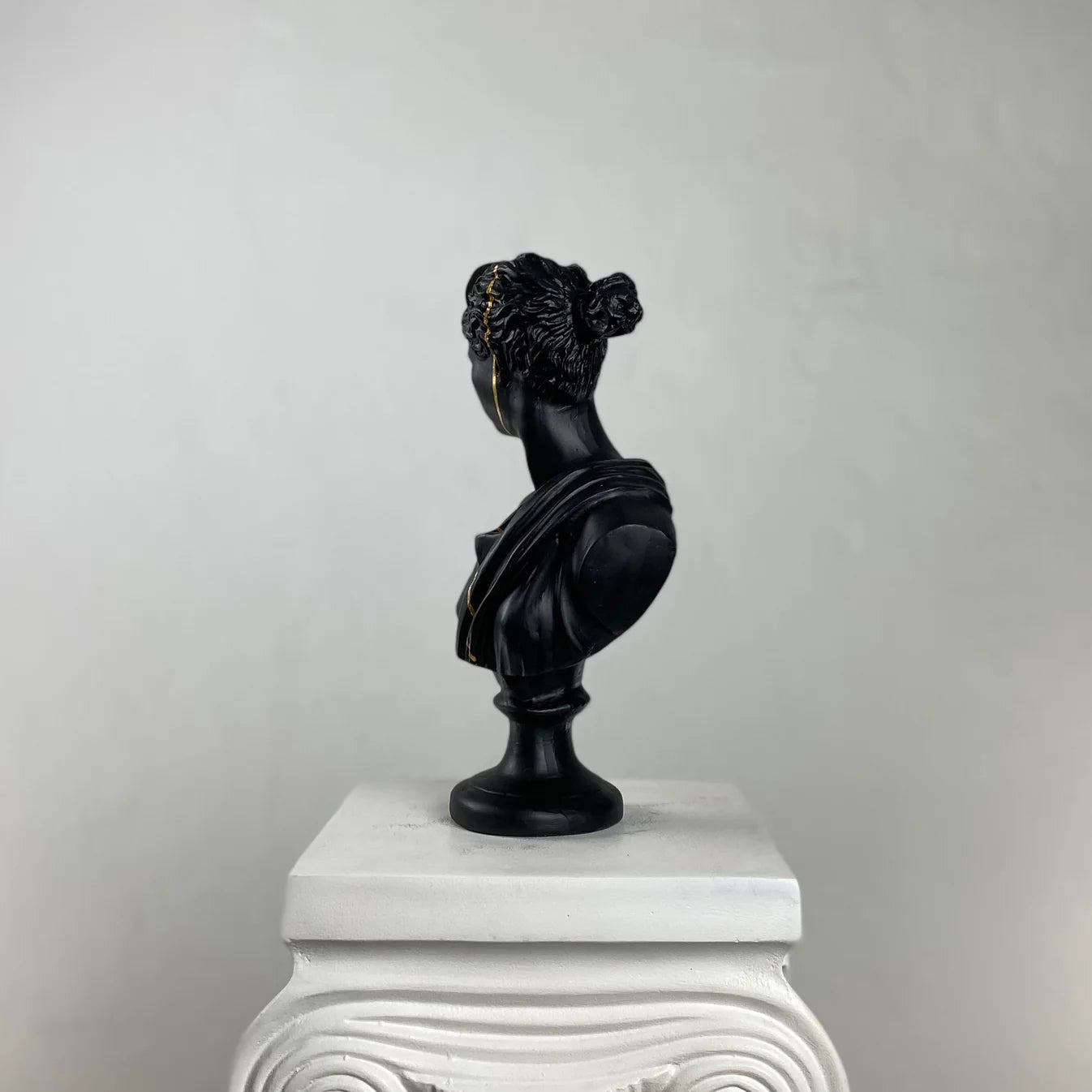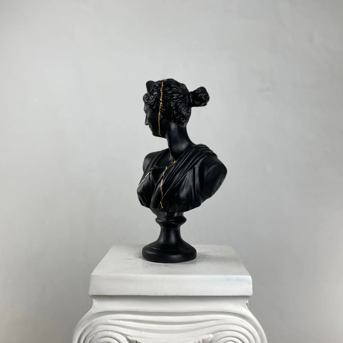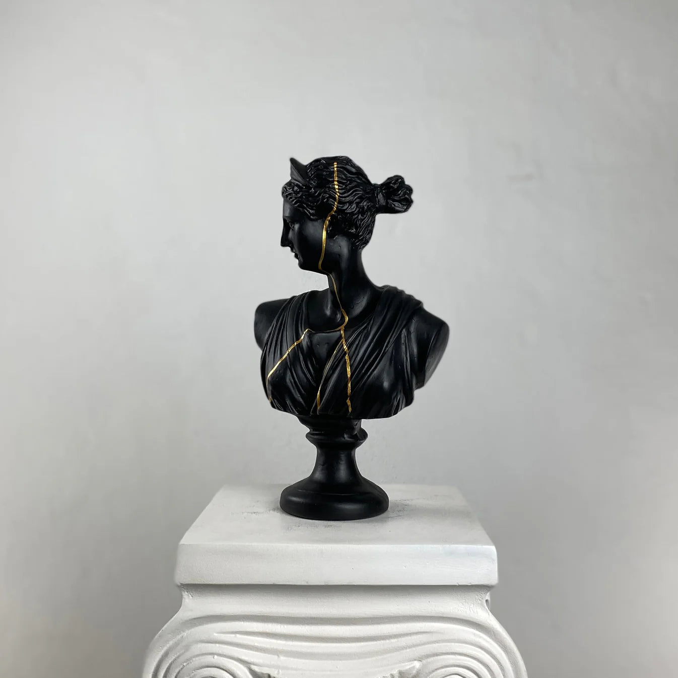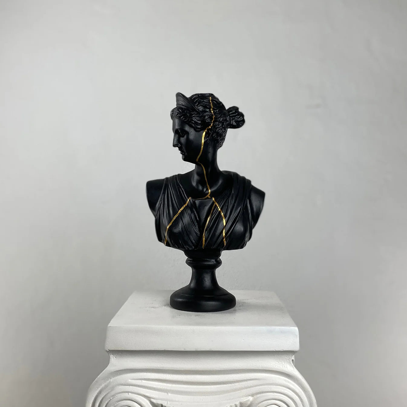Artemis "Gold Streak" Black Sculpture presents a captivating balance between darkness and light. Cast in deep matte black, this modern reinterpretation of classical grace is disrupted by a single flowing gold streak that runs from crown to chest — a symbol of imperfection turned to beauty. Subtle yet powerful, it evokes the timeless duality of strength and vulnerability, making it an evocative centerpiece for refined interiors.