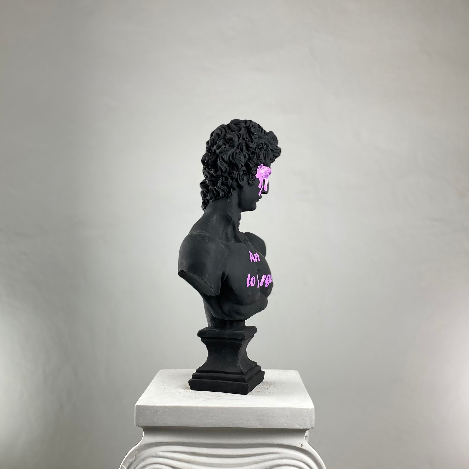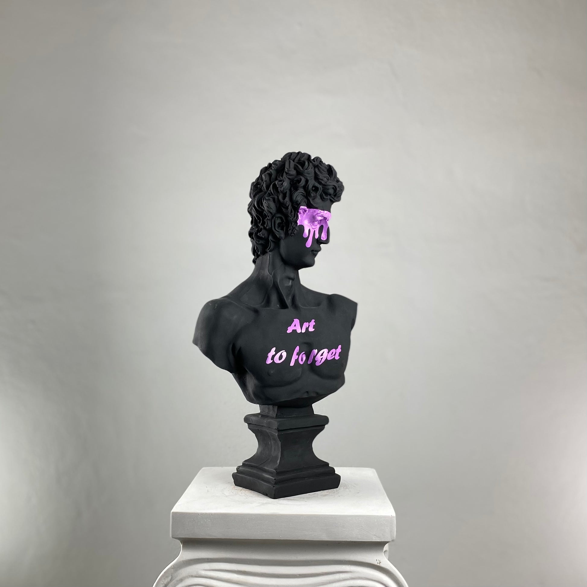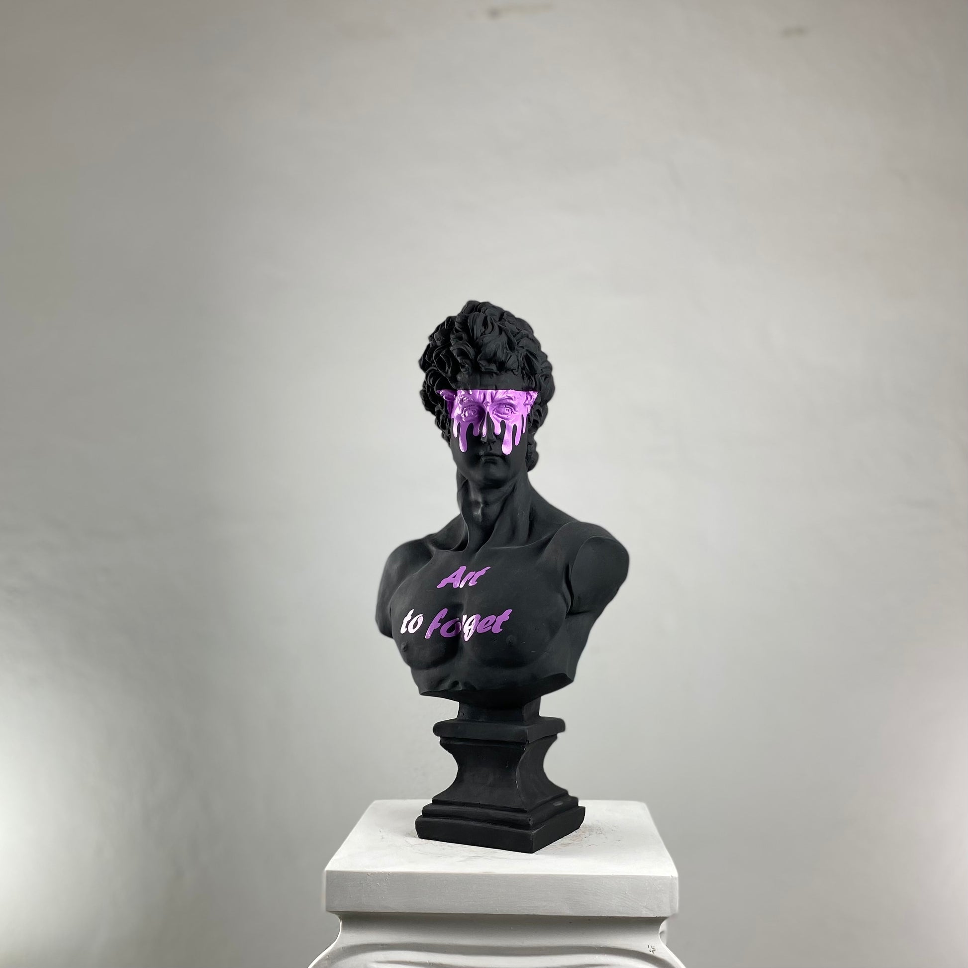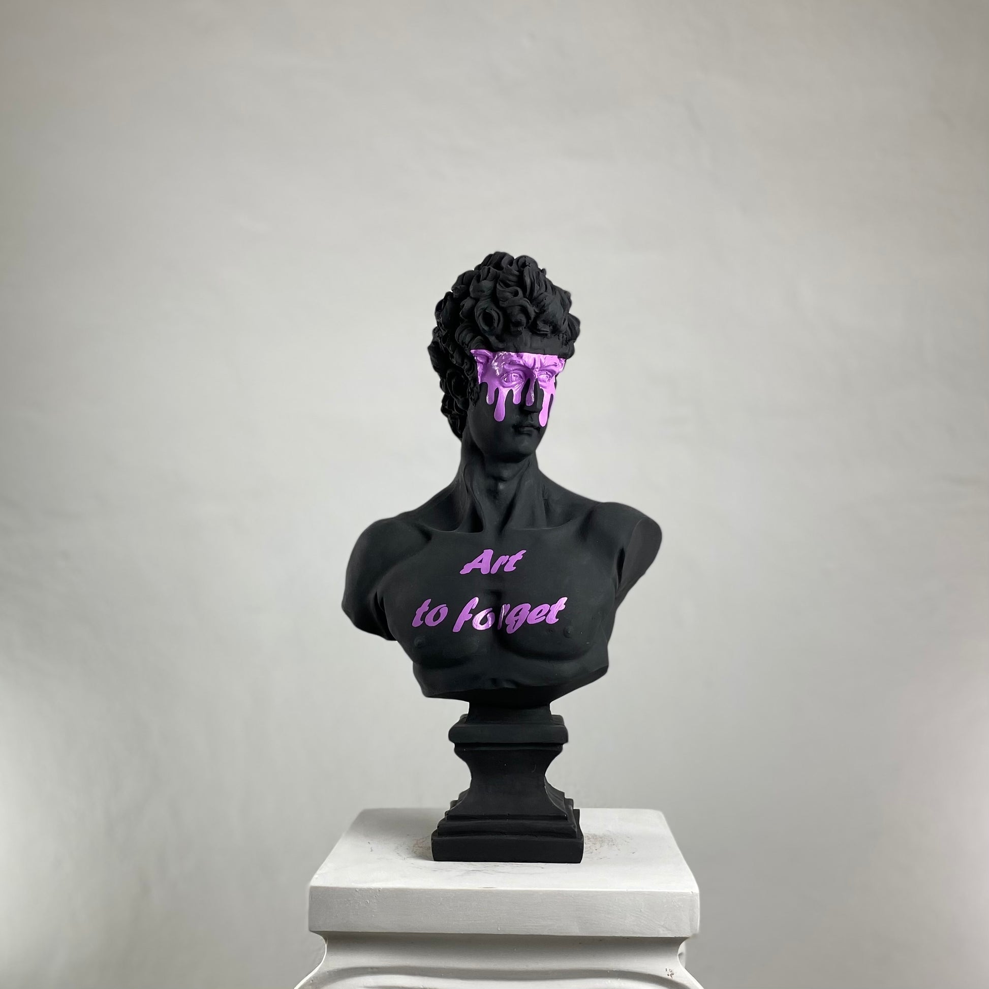 The David "Art To Forget" Sculpture gives a new look to the classic masterpiece. The sculpture is painted in deep matte black, with a melting purple mask effect around the eyes that flows softly down the face. The same purple color is used for the words "Art To Forget" across the chest, making the piece feel emotional and modern at the same time. Handcrafted and hand-painted, it represents the idea of fading memories and creative freedom.