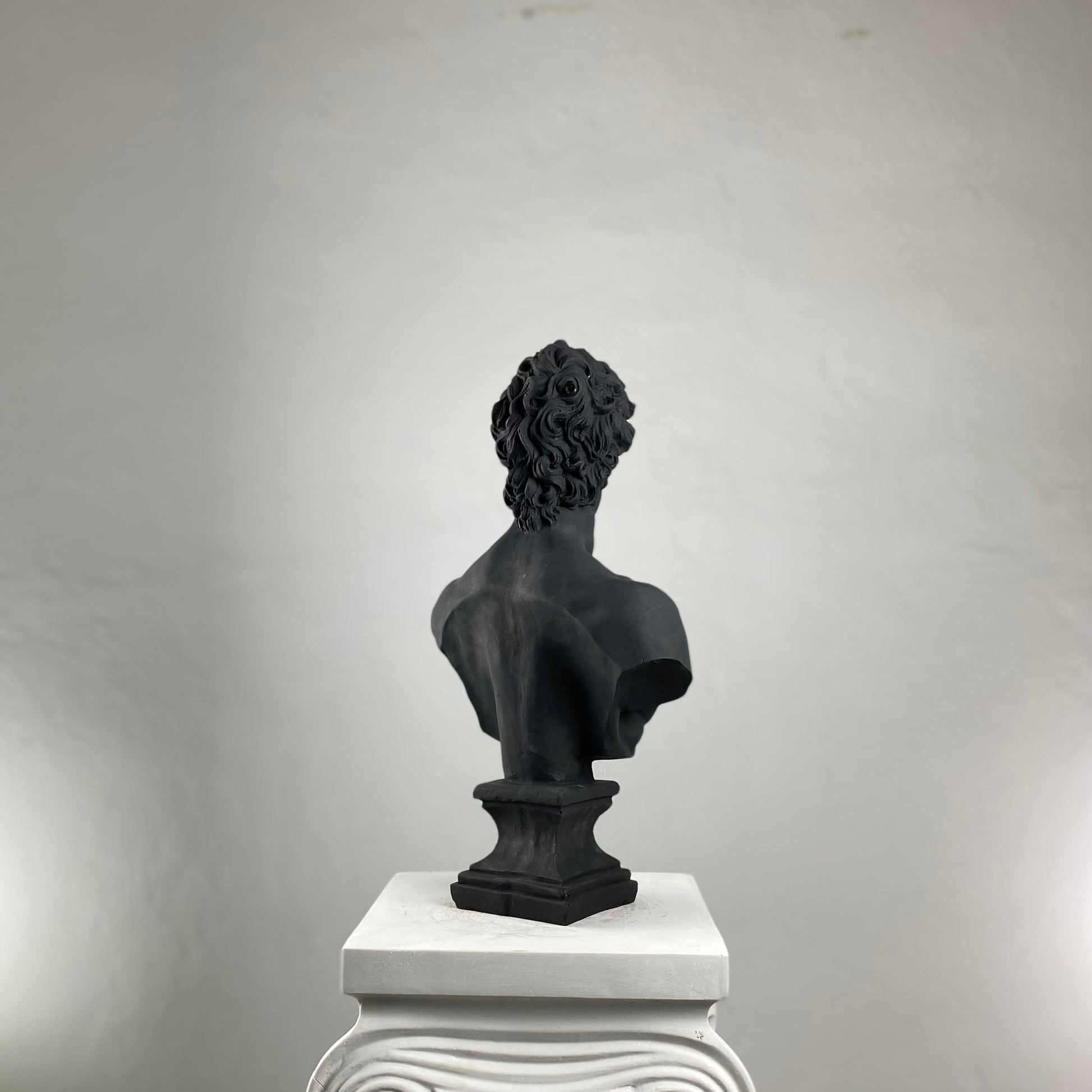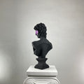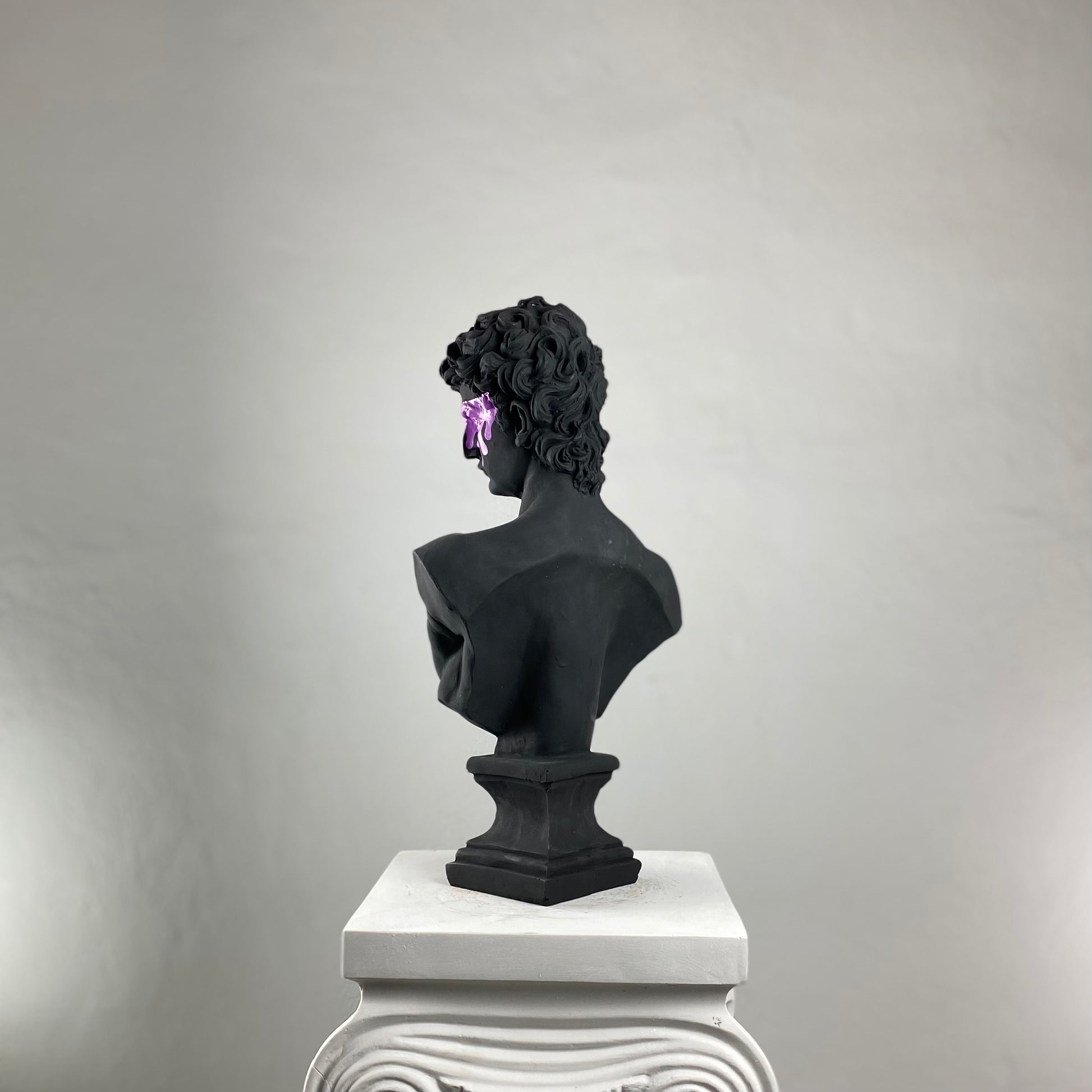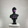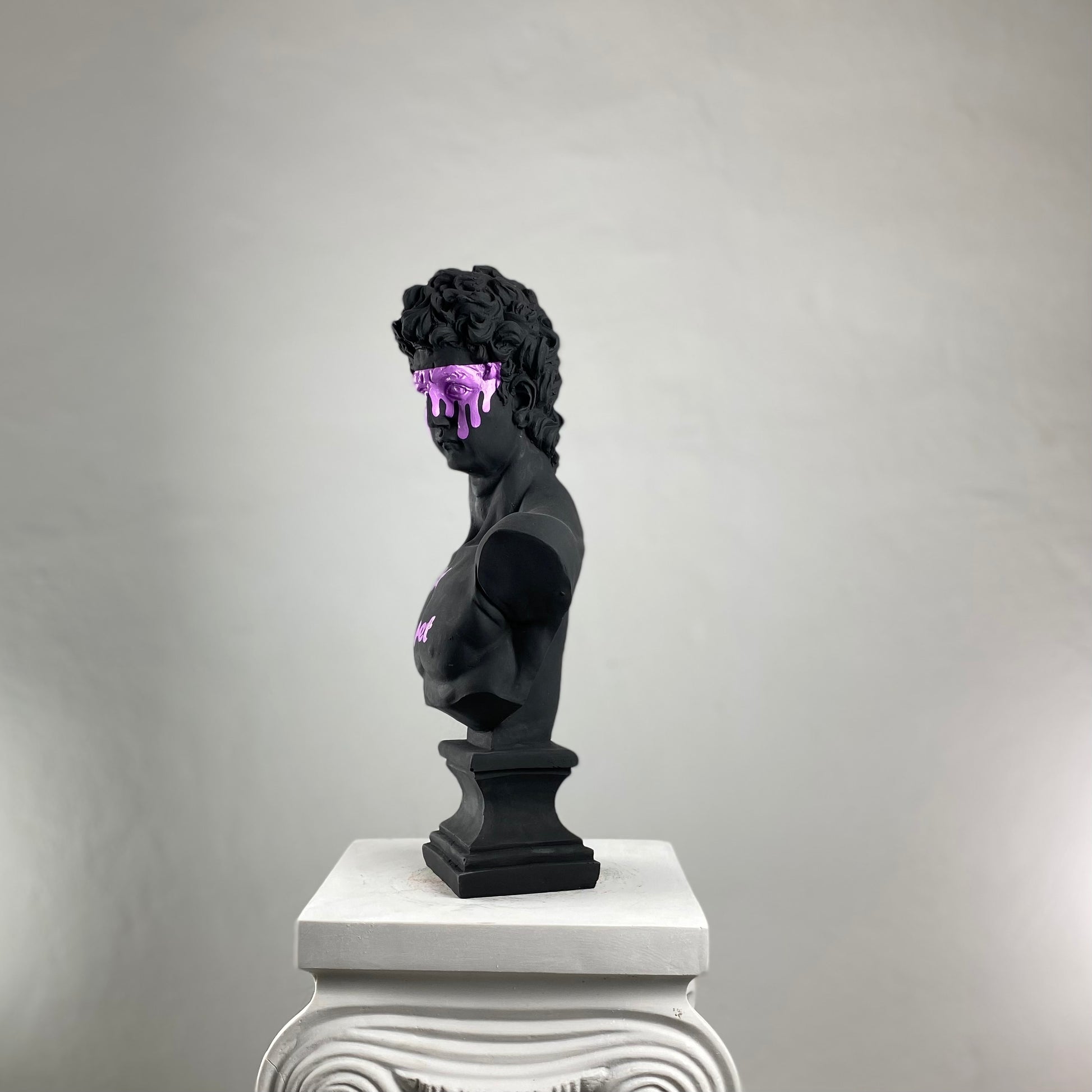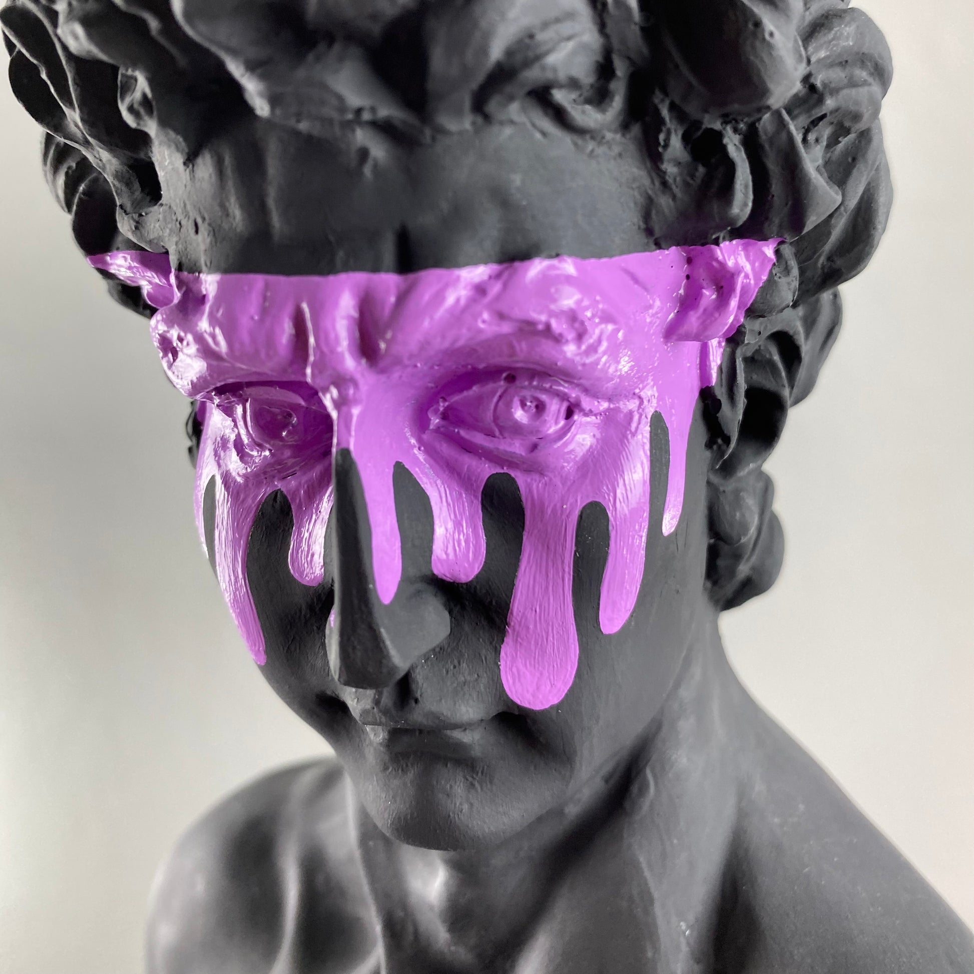 The David "Art To Forget" Sculpture gives a new look to the classic masterpiece. The sculpture is painted in deep matte black, with a melting purple mask effect around the eyes that flows softly down the face. The same purple color is used for the words "Art To Forget" across the chest, making the piece feel emotional and modern at the same time. Handcrafted and hand-painted, it represents the idea of fading memories and creative freedom.