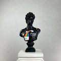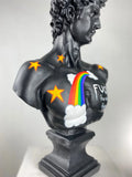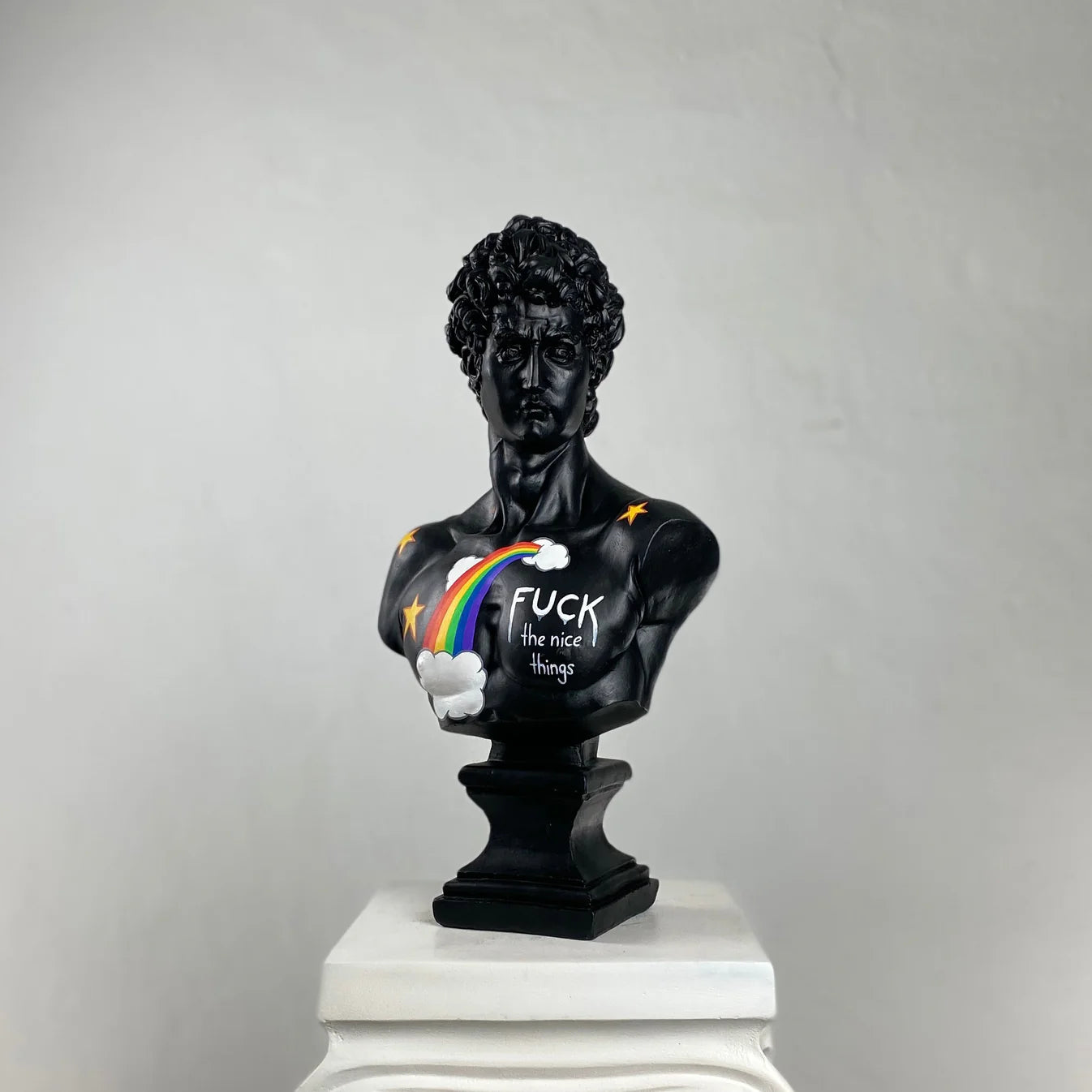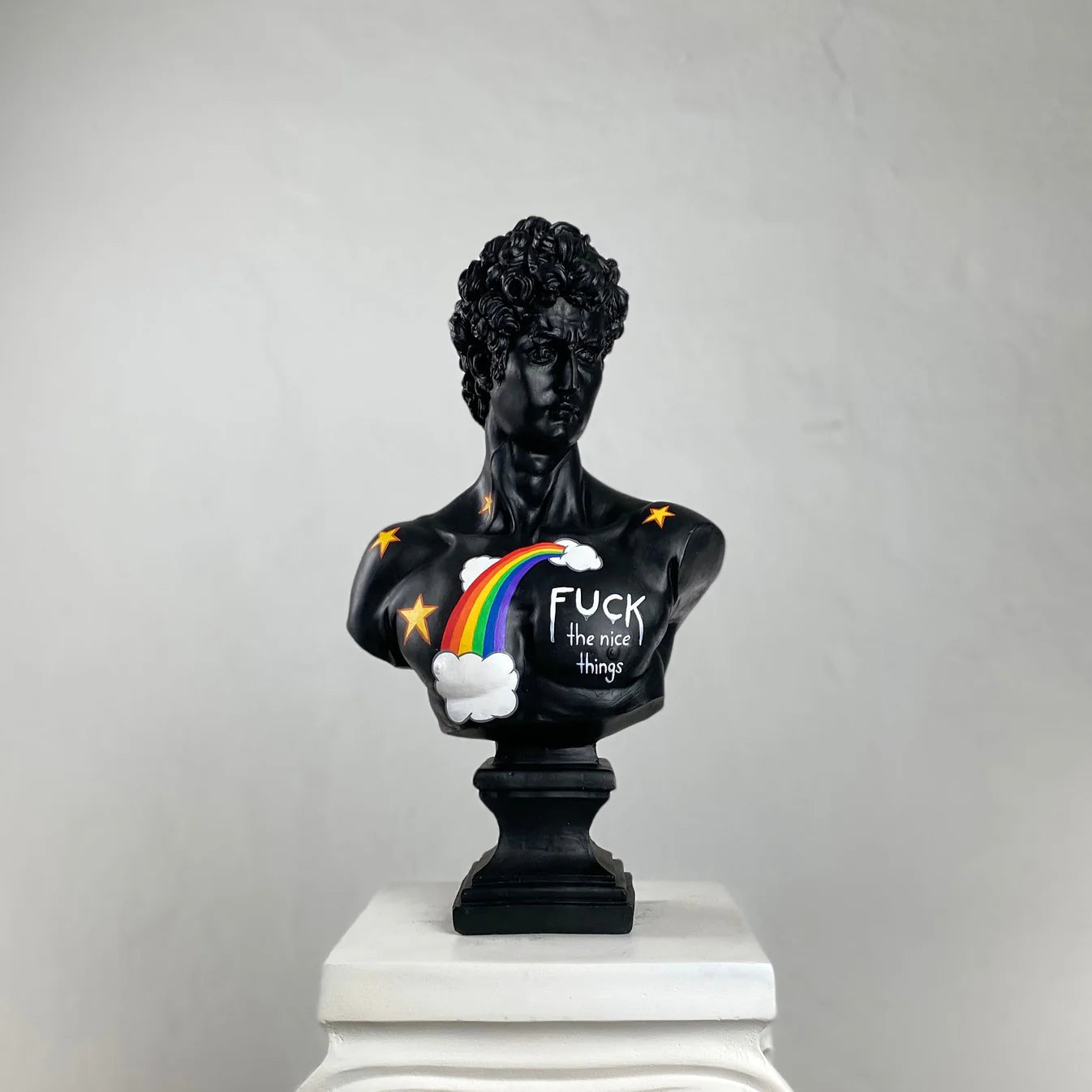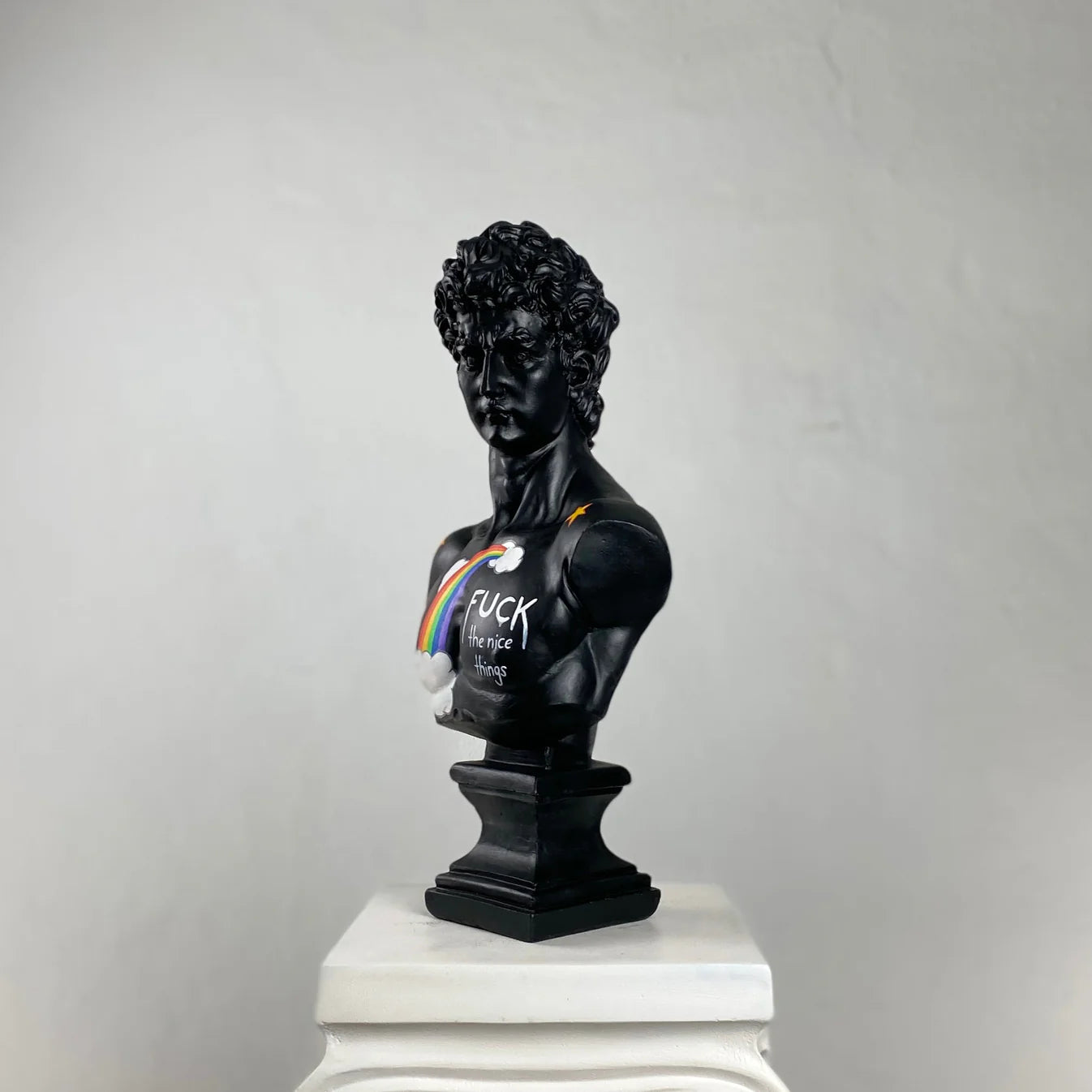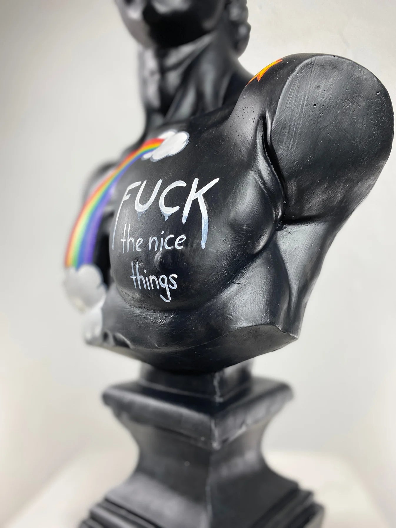 David "F The Nice Things" Sculpture redefines rebellion through humor and irony. The classical form of David meets playful defiance — a rainbow arcs across his chest, accompanied by unapologetic words that challenge convention. This striking contrast between dark elegance and colorful satire makes the piece both provocative and unexpectedly charming. It’s a statement on freedom, authenticity, and not taking life too seriously.