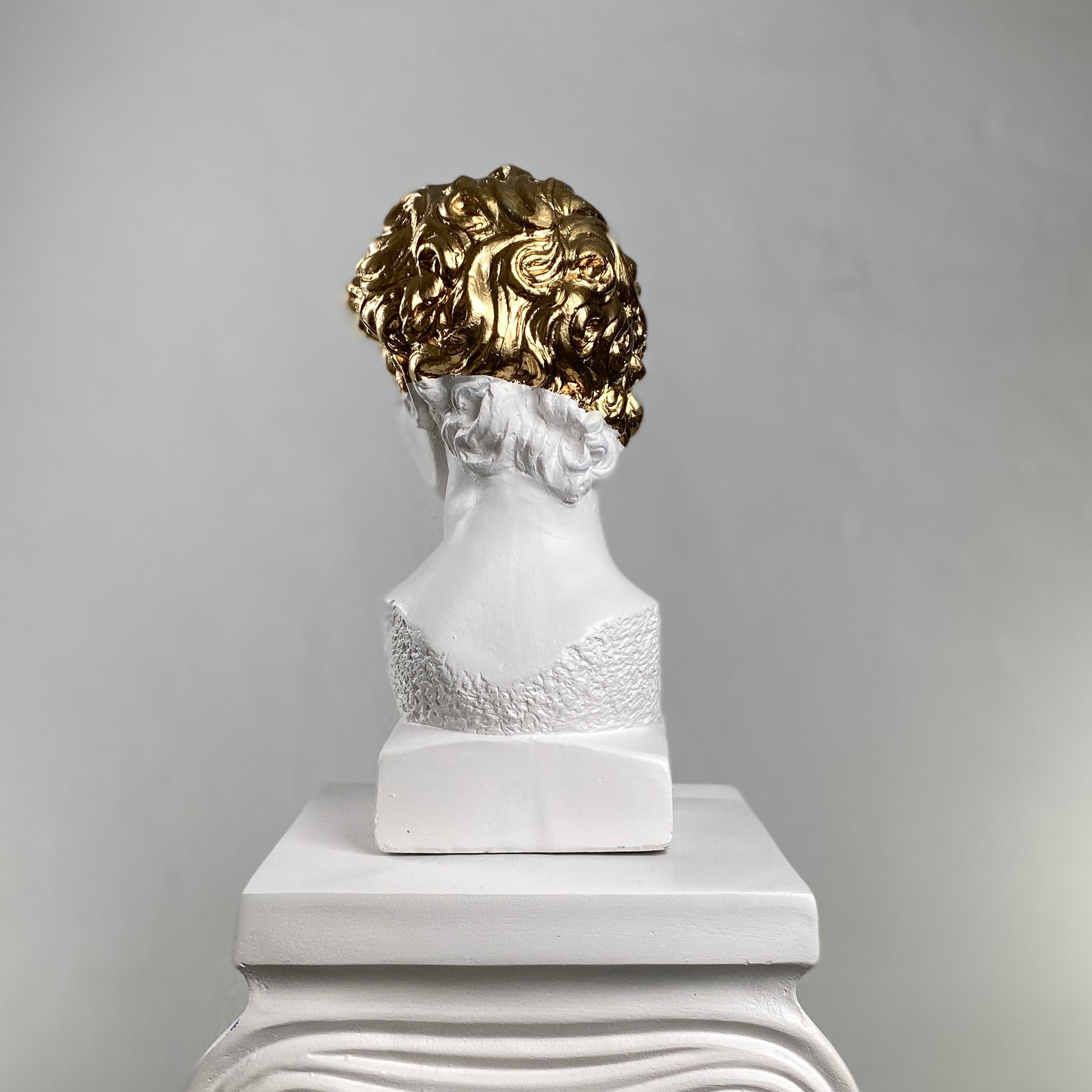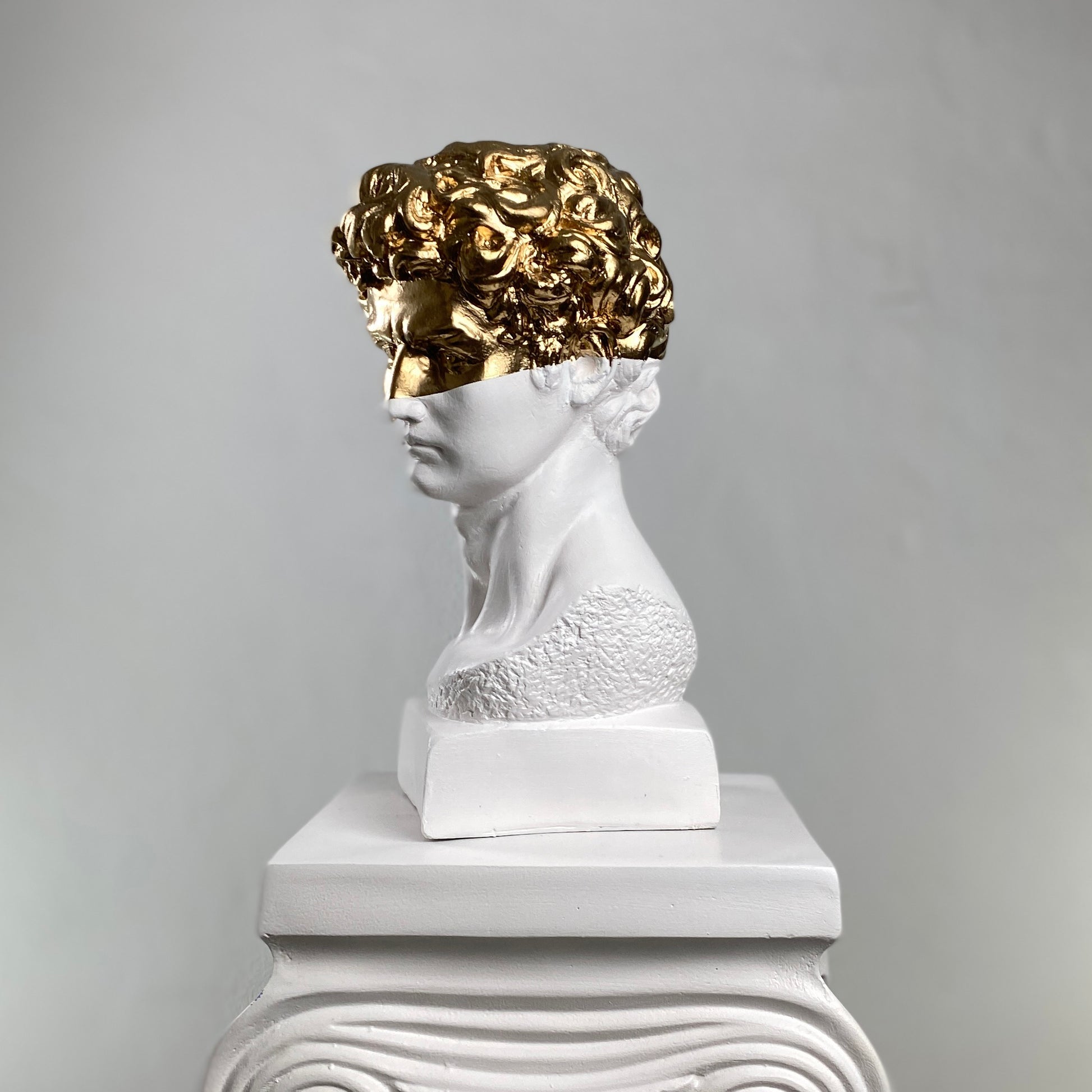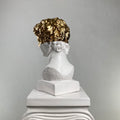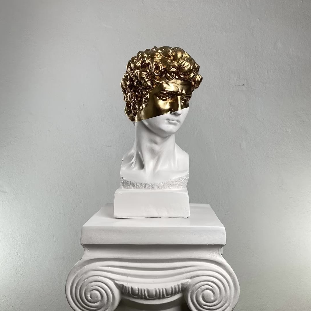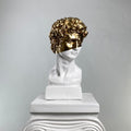 David Golden Hair Sculpture captures timeless elegance with a modern twist. Showcasing a classic white finish contrasting beautifully with golden accent on his hair, this handcrafted piece is a tribute to the legendary sculpture by Michelangelo. It's an ideal statement piece for those looking to infuse luxury into their space.