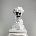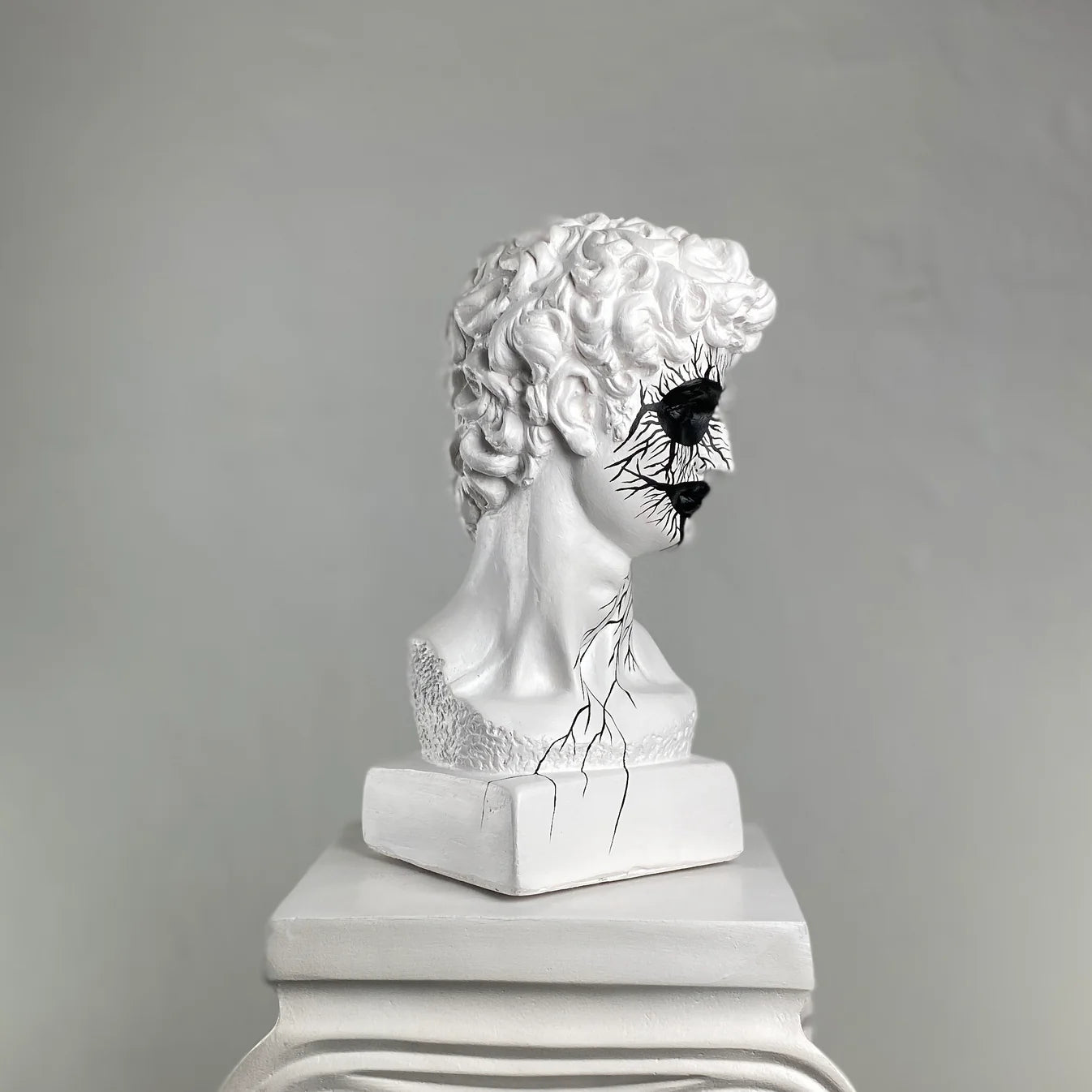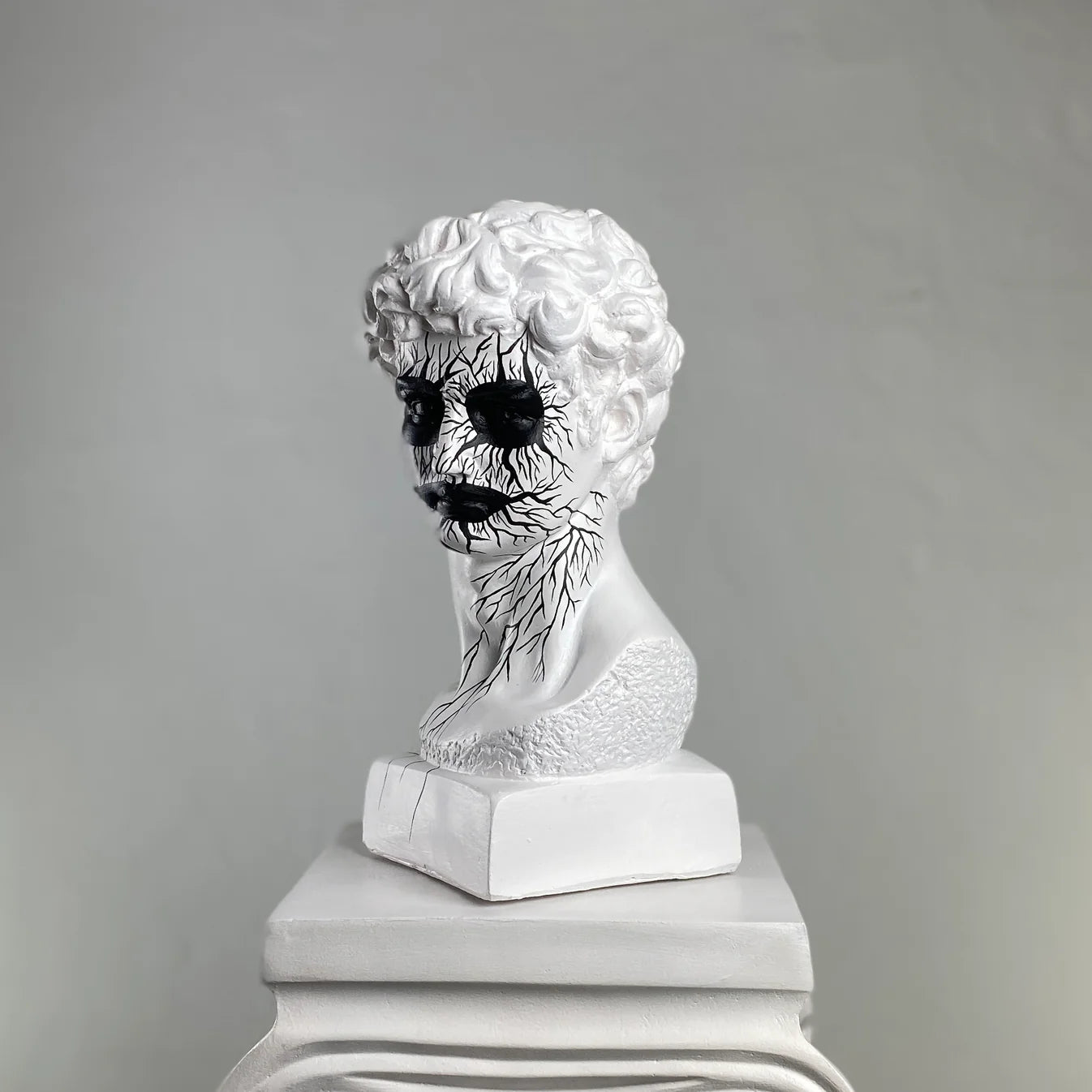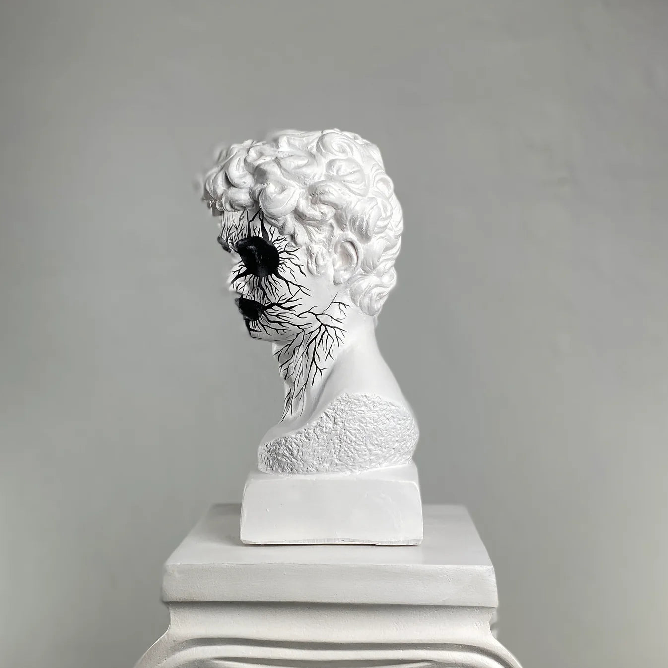 The David "Grim" Sculpture transforms classical beauty into a haunting vision of emotion. Painted in stark white with black, root-like strokes spreading from the eyes and lips, it merges serenity and chaos — a quiet reflection of modern unease. The piece captures the fragile line between timeless art and contemporary rebellion.