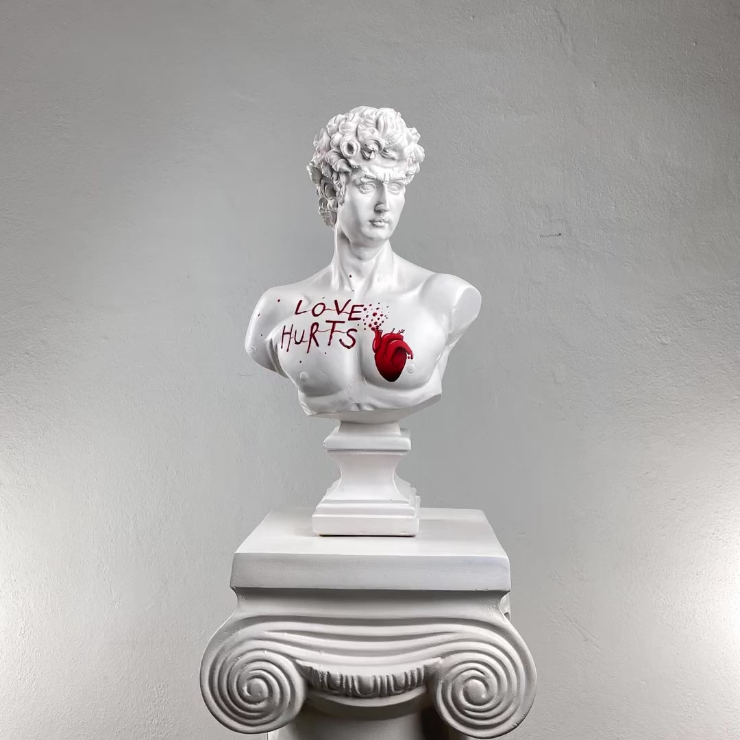 The David “Love Hurts” Sculpture reimagines Michelangelo’s iconic masterpiece with a modern twist of raw emotion. Featuring a classic white-marble finish punctuated by a striking red heart detail, this handcrafted piece blends timeless Renaissance artistry with contemporary symbolism. A bold statement for interiors that celebrate both beauty and vulnerability.