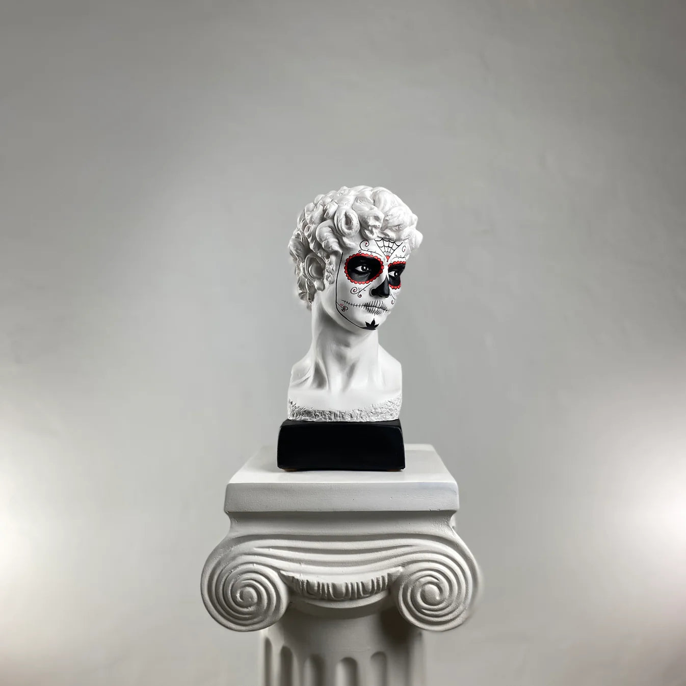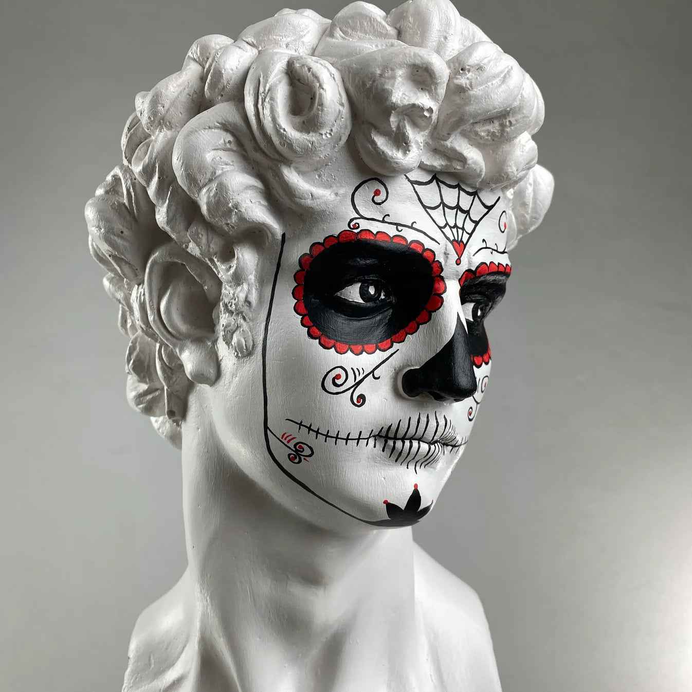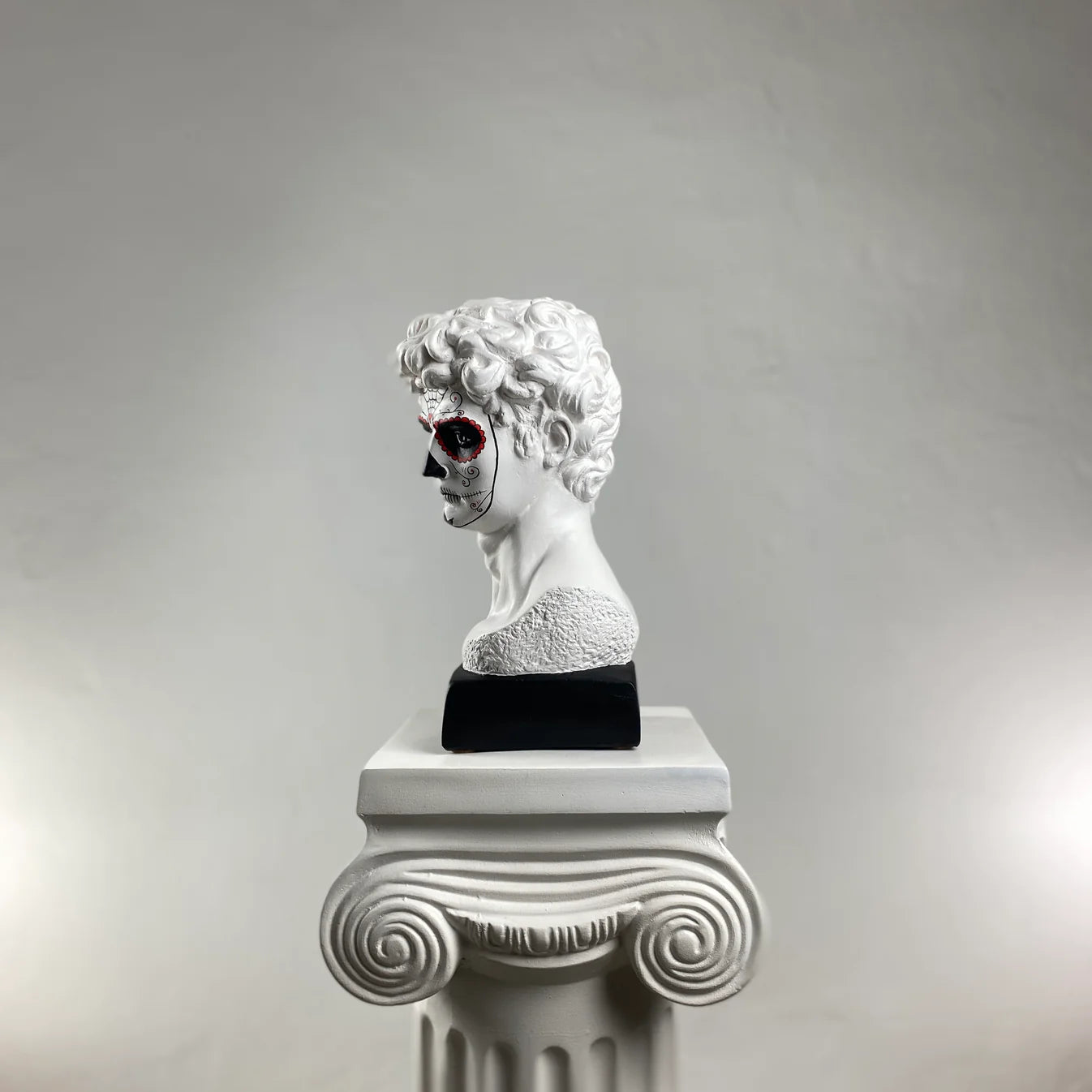 David "Calavera" Sculpture transforms Michelangelo’s timeless icon into a vibrant tribute to life, death, and art. Painted with a Day of the Dead–inspired motif, its white surface becomes a canvas for crimson and black flourishes, fusing baroque grace with festive defiance. A striking piece that celebrates both remembrance and reinvention.