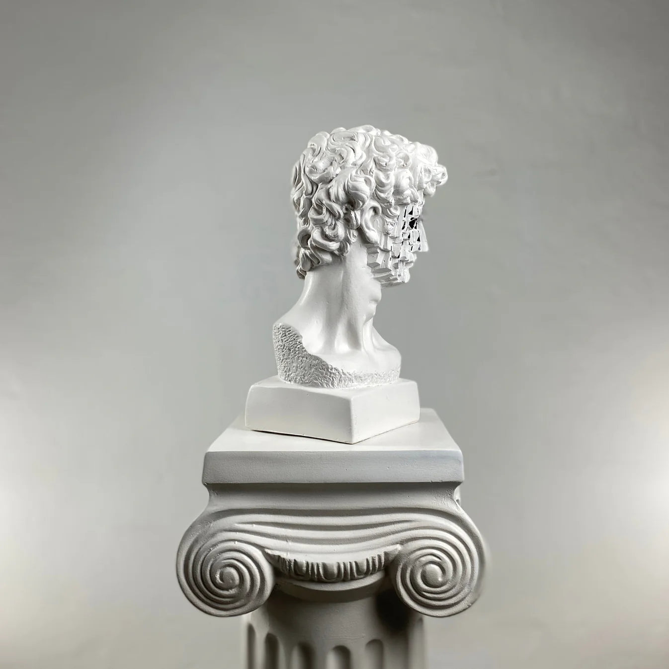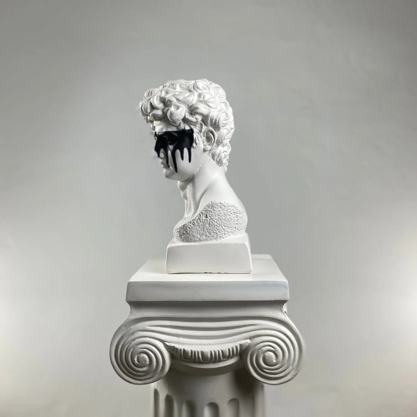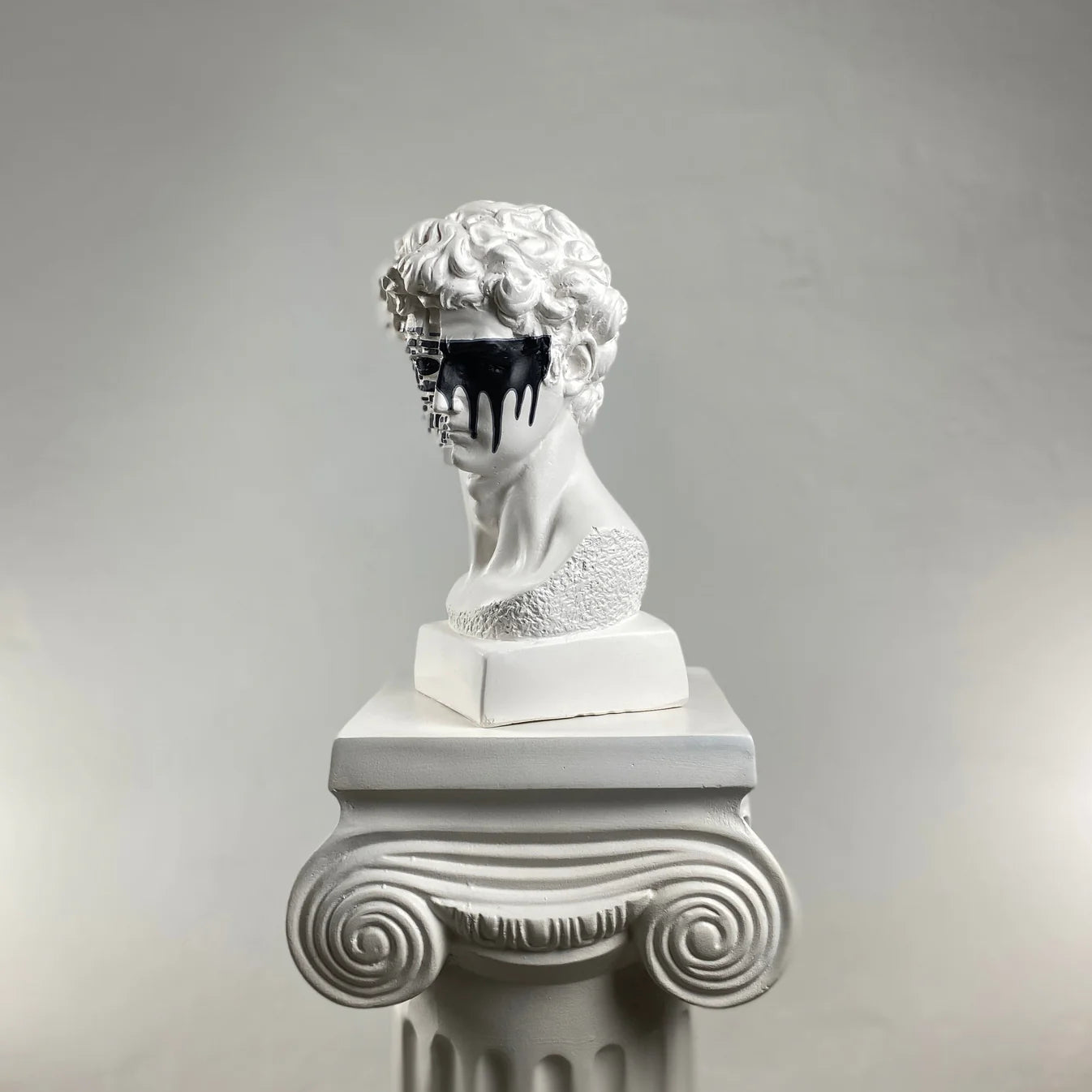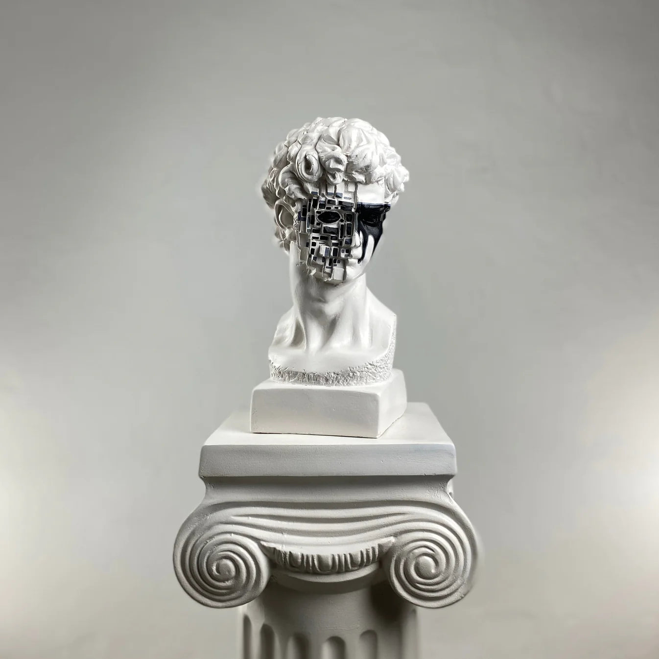 The David "The Main Villian" Sculpture delivers a bold, dramatic reinterpretation of the classical icon. Crafted in matte white, the bust features a striking fragmented mask design in black and metallic tones, giving the sculpture an intense, cinematic presence. The geometric distortion creates the impression of a hidden identity — powerful, mysterious, and unmistakably commanding. Handcrafted from polyresin with marble crushes and painted by our artists using water-based acrylics, this piece stands as a true modern statement.