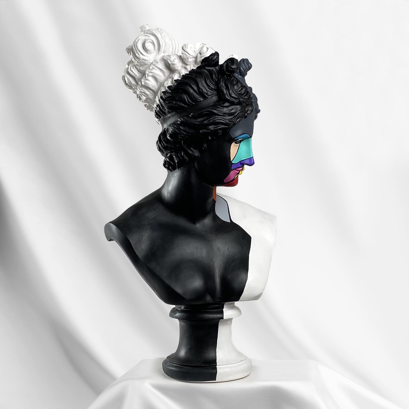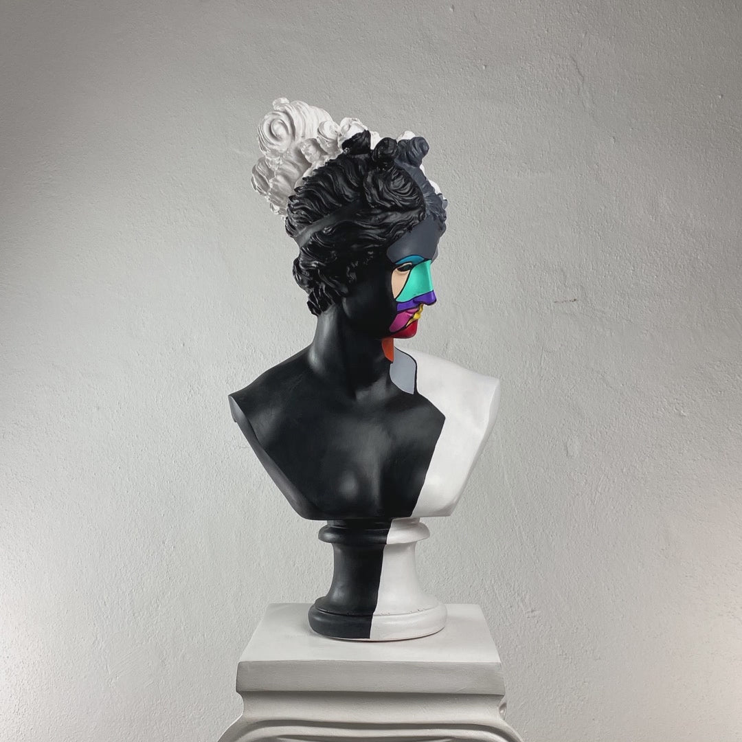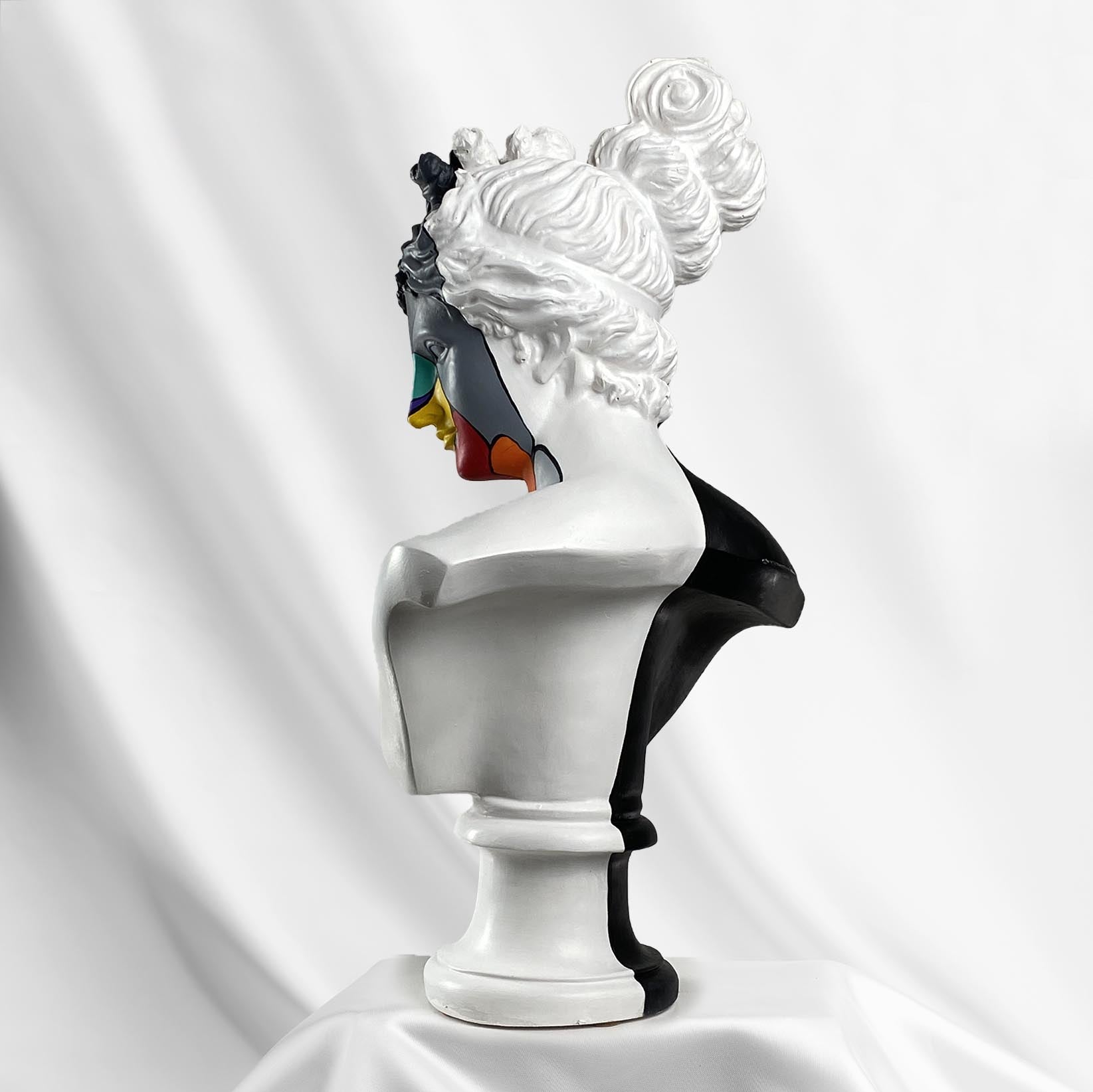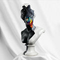 Diana Color Slice Sculpture is a stunning representation of modern art, executed in striking black and white colors with a vibrant geometric pattern on her face. This piece captivates and enhances any space with its dynamic design and bold use of color.