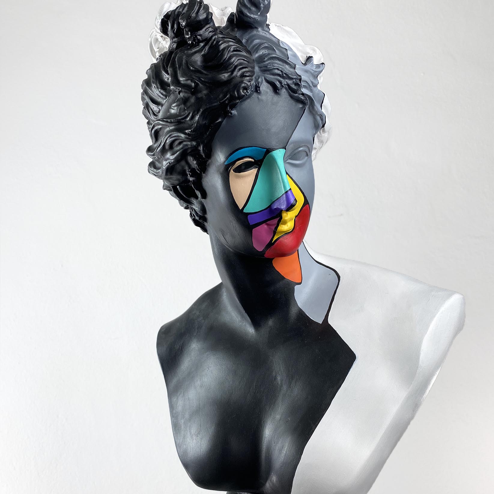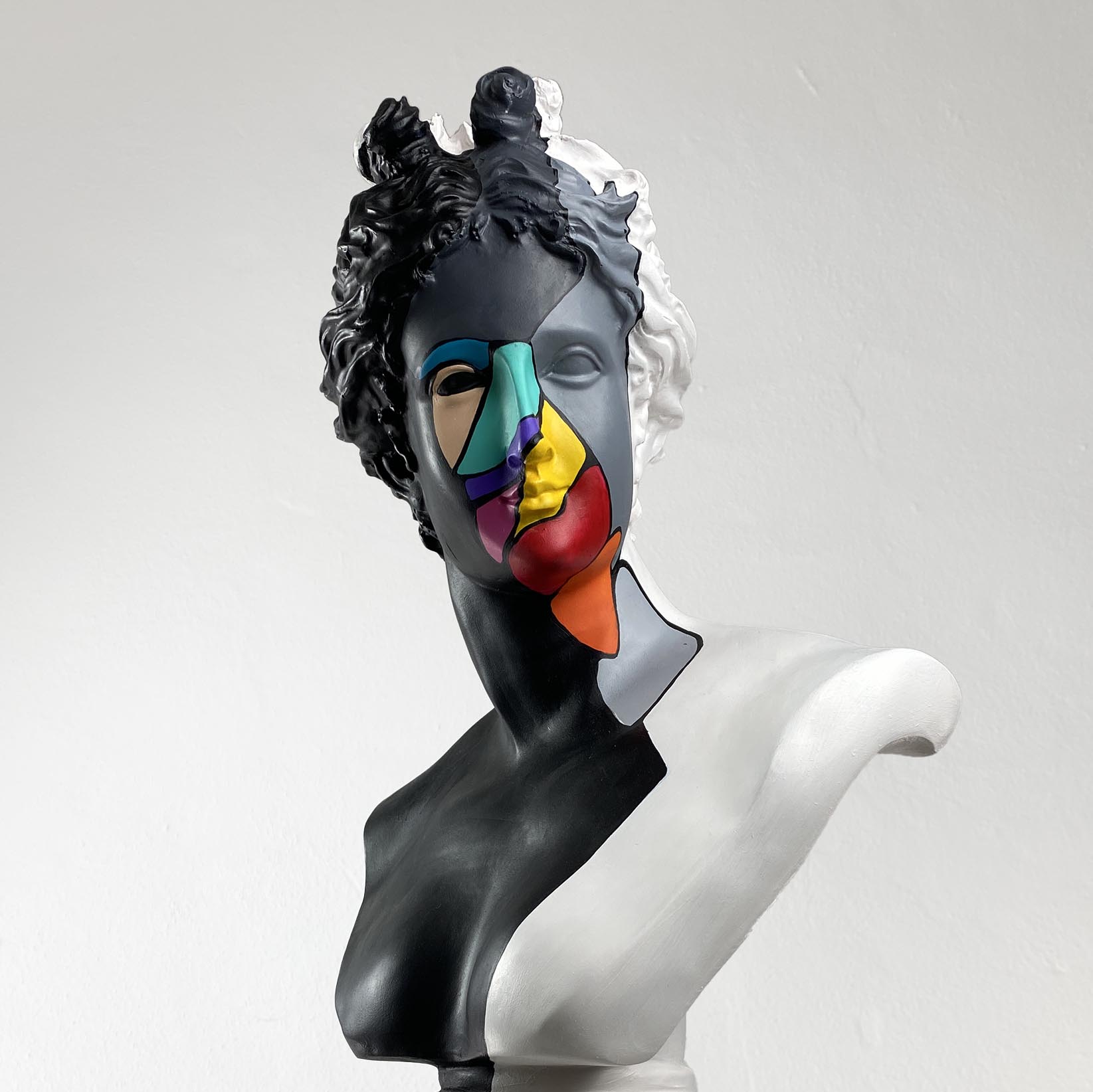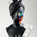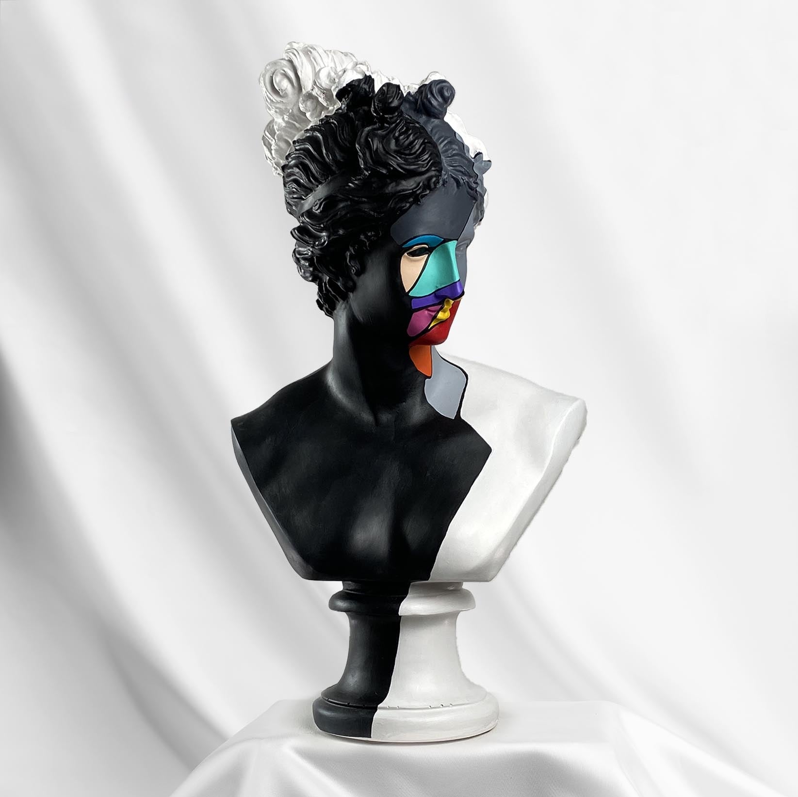 Diana Color Slice Sculpture is a stunning representation of modern art, executed in striking black and white colors with a vibrant geometric pattern on her face. This piece captivates and enhances any space with its dynamic design and bold use of color.
