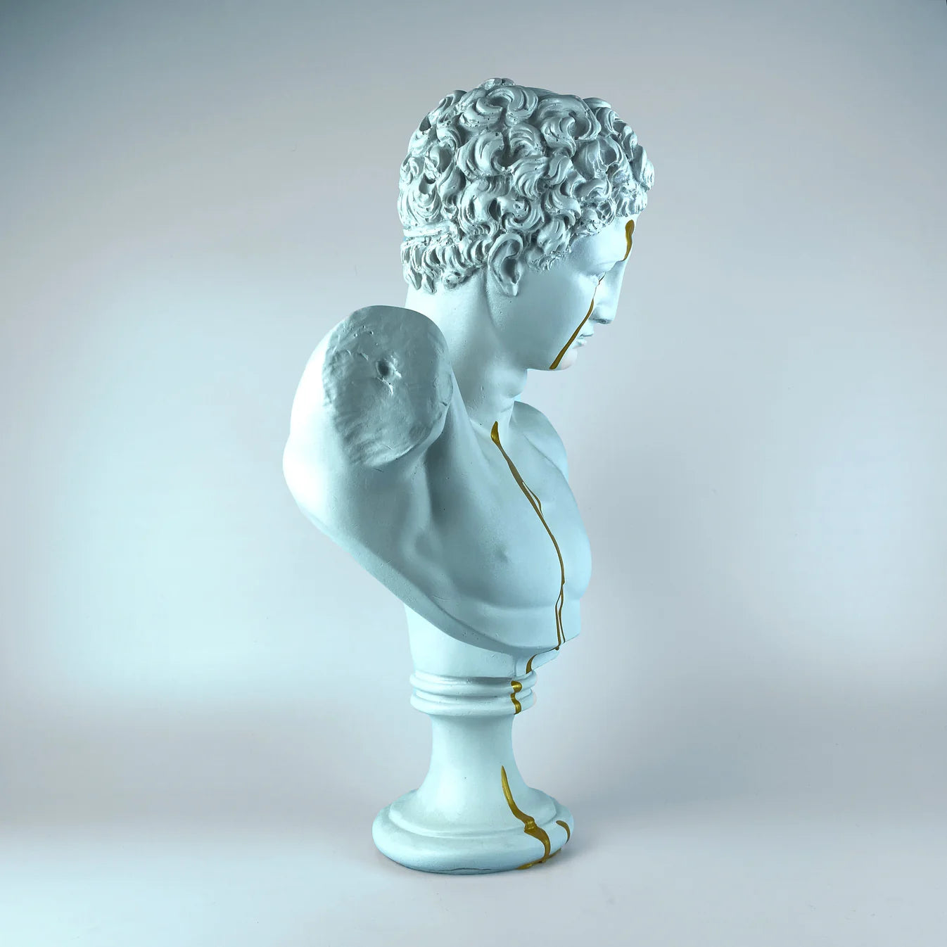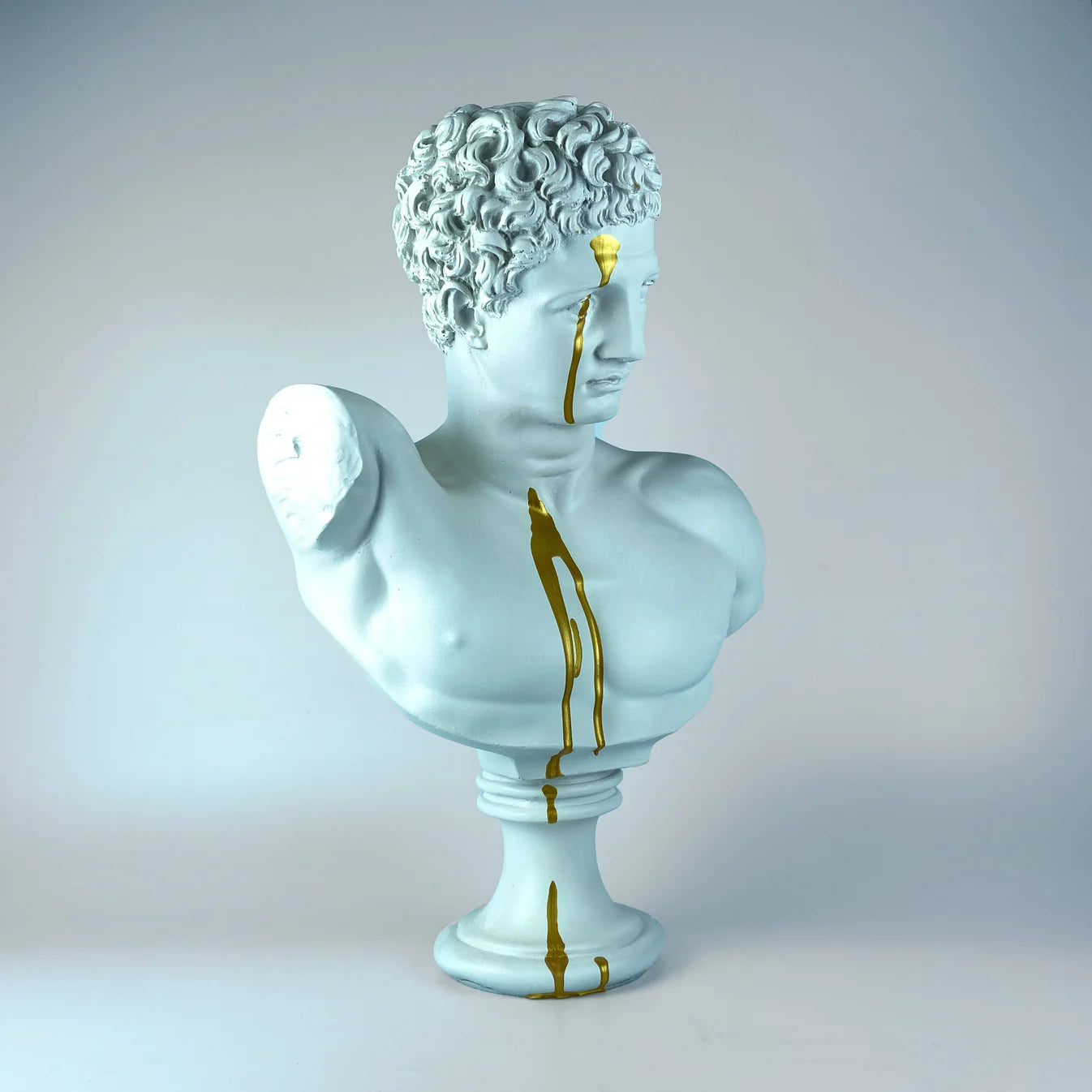 Hermes "Golden Wound" Sculpture captures a fragile calm within the divine. Gold flows gently from the god’s eye and chest, turning pain into reflection, and reflection into quiet beauty. The design transforms classical form into a meditation on emotion — pure, timeless, and human.