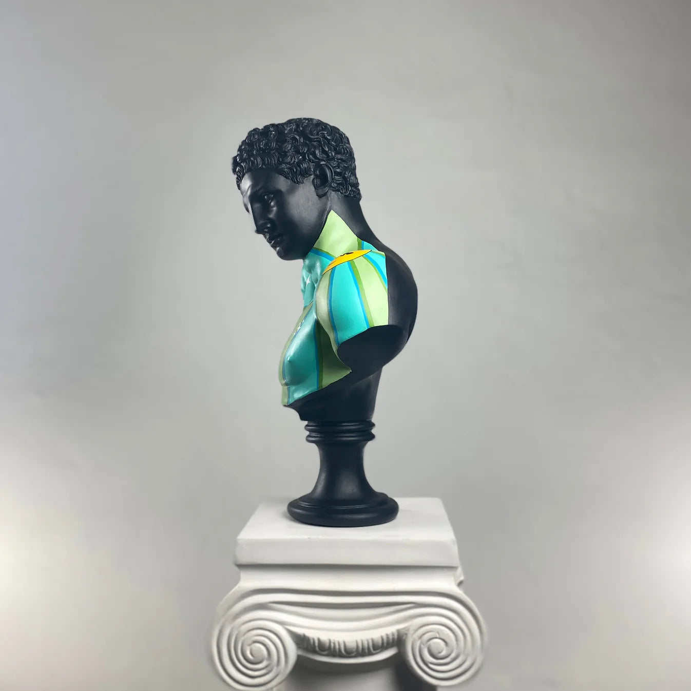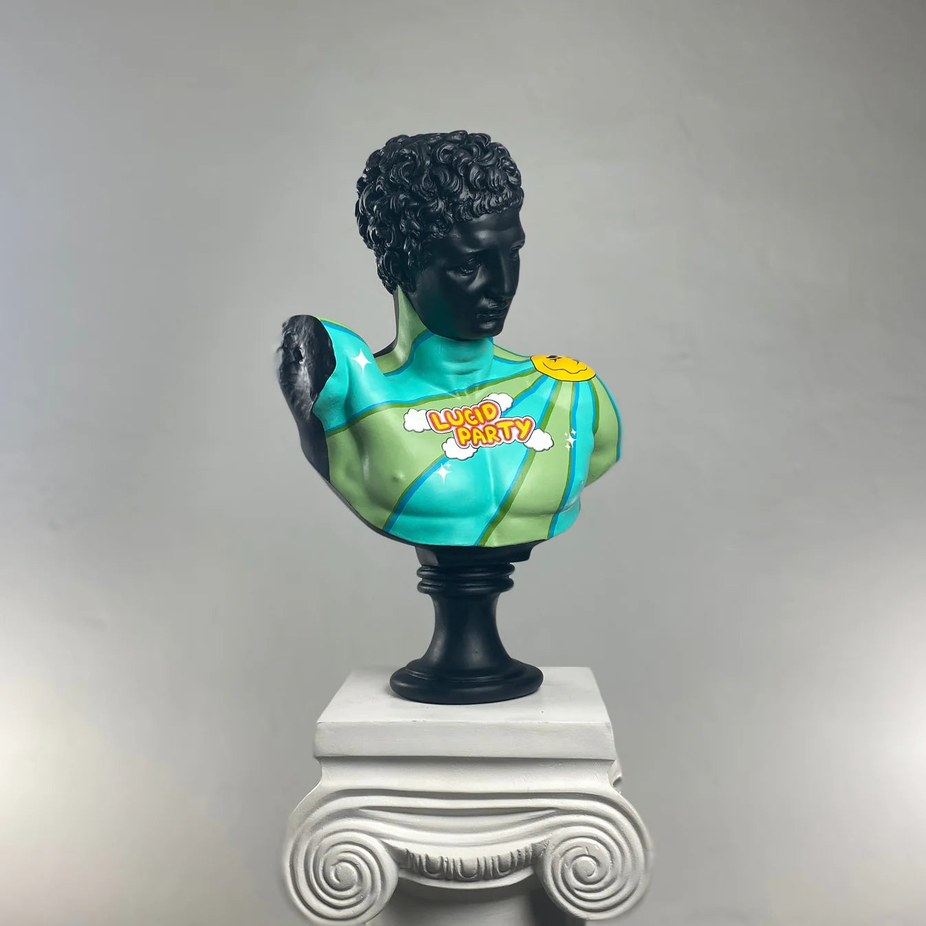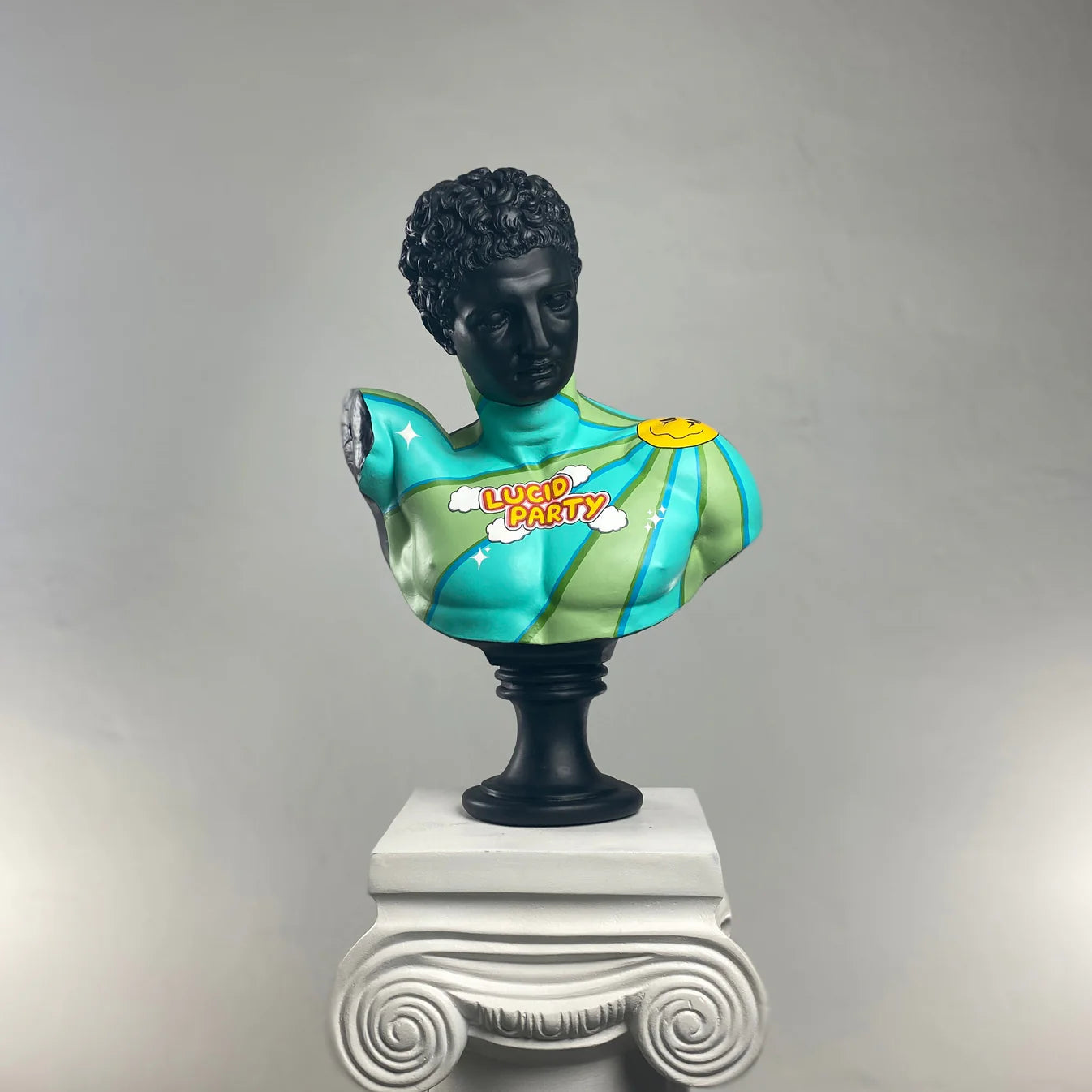 The Hermes "Lucid Party" Sculpture transforms classical mythology into a burst of modern, upbeat energy. This striking bust features a deep matte-black finish that sets the stage for a vibrant, cartoon-inspired chest design. Shades of turquoise, lime, and teal radiate outward in bold waves, while playful graphic elements — including a cheerful yellow smiley and the "Lucid Party" emblem — bring a lively, retro-pop aesthetic to the statue.