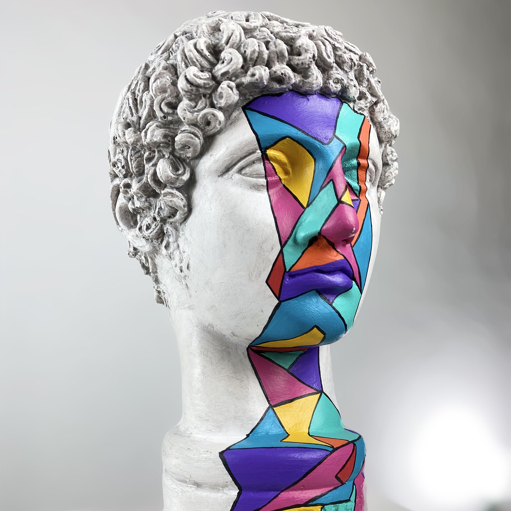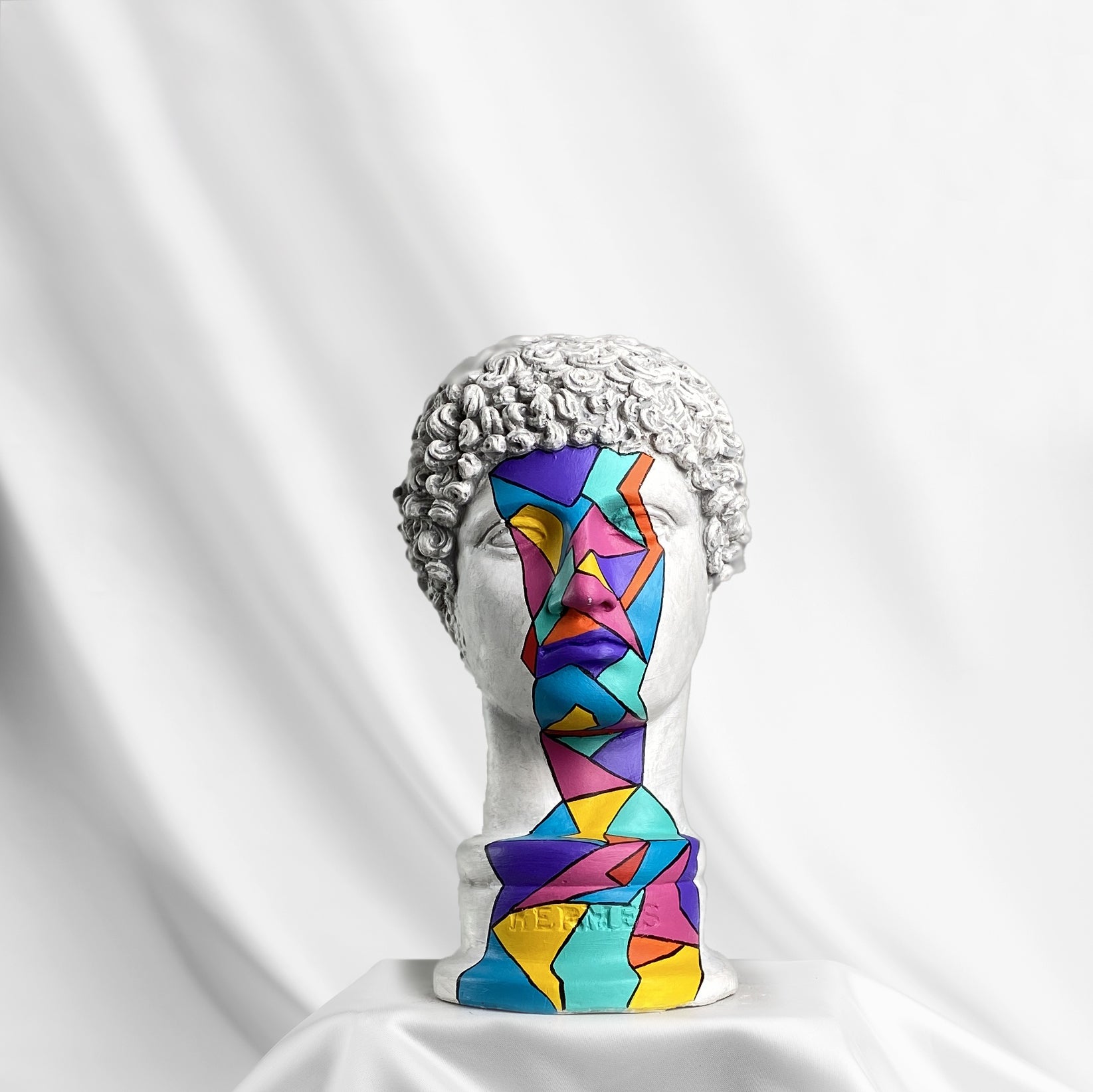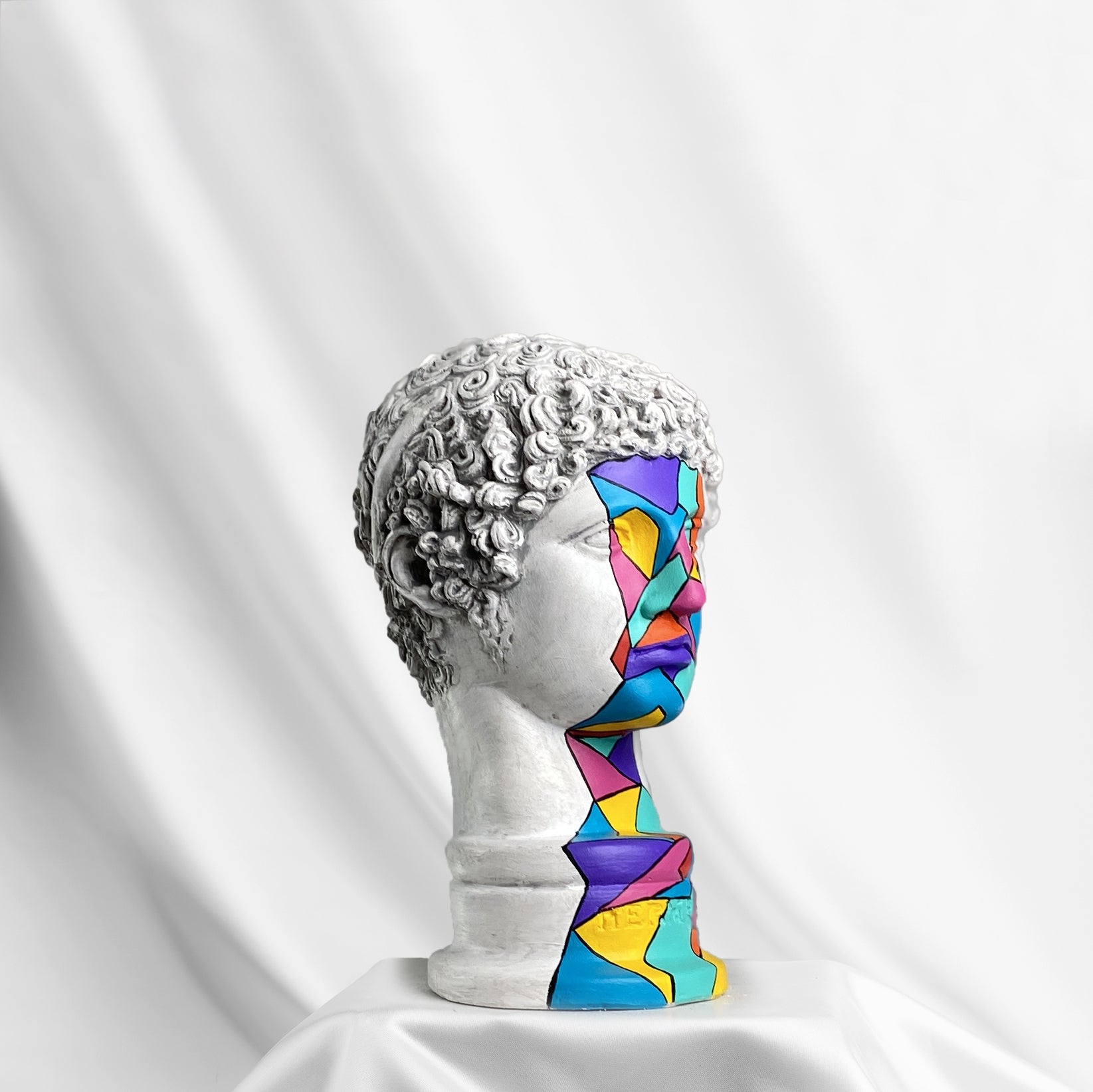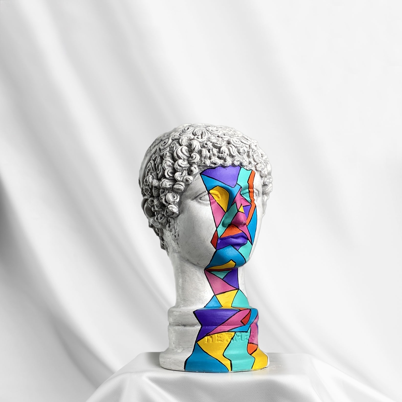 The Hermes "Refraction" Sculpture channels the spirit of motion, wit, and transformation through a prism of color. Vivid geometric shards in hues of turquoise, violet, and amber race across the classical bust, echoing the messenger god’s fluid energy and timeless charisma.