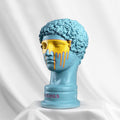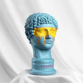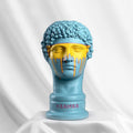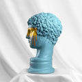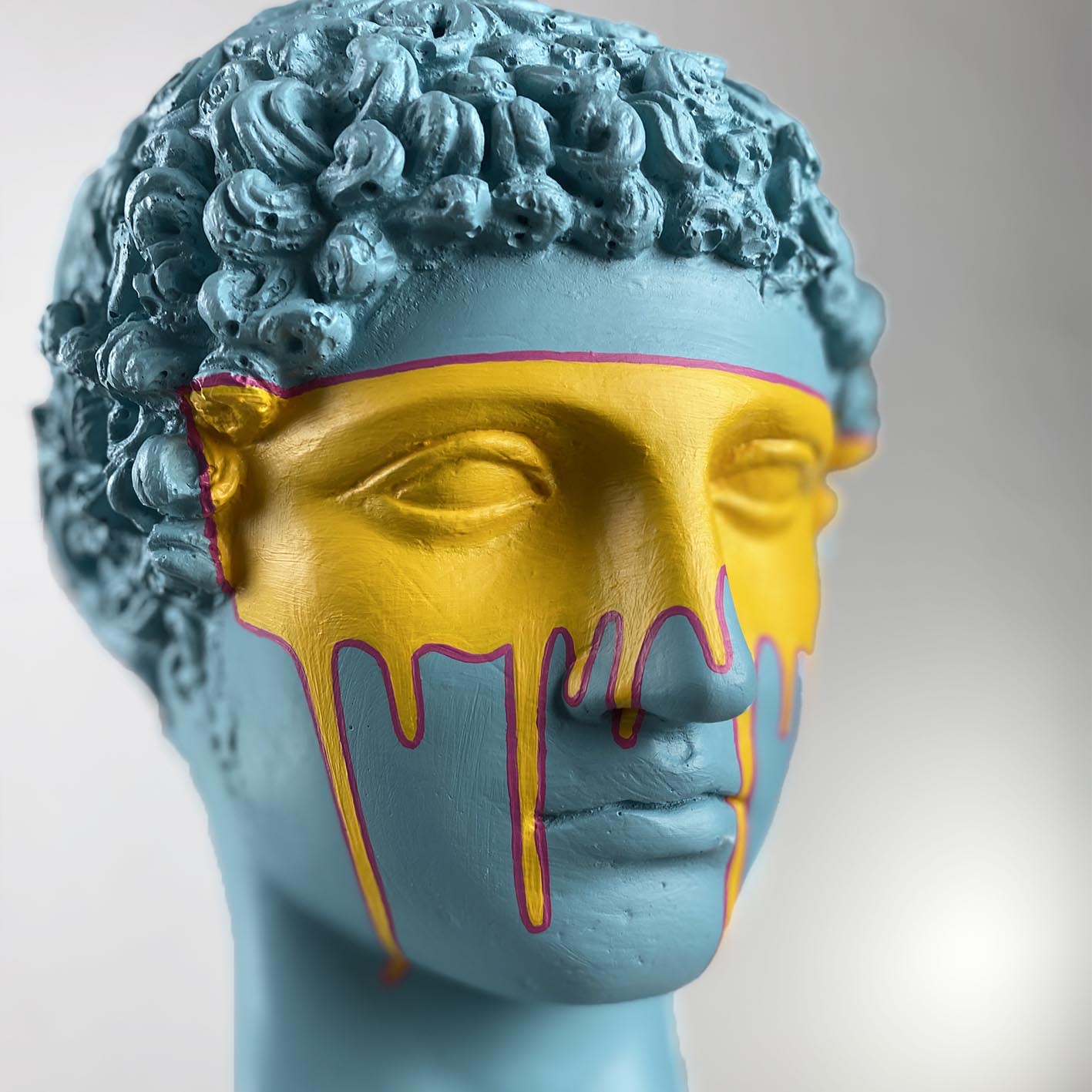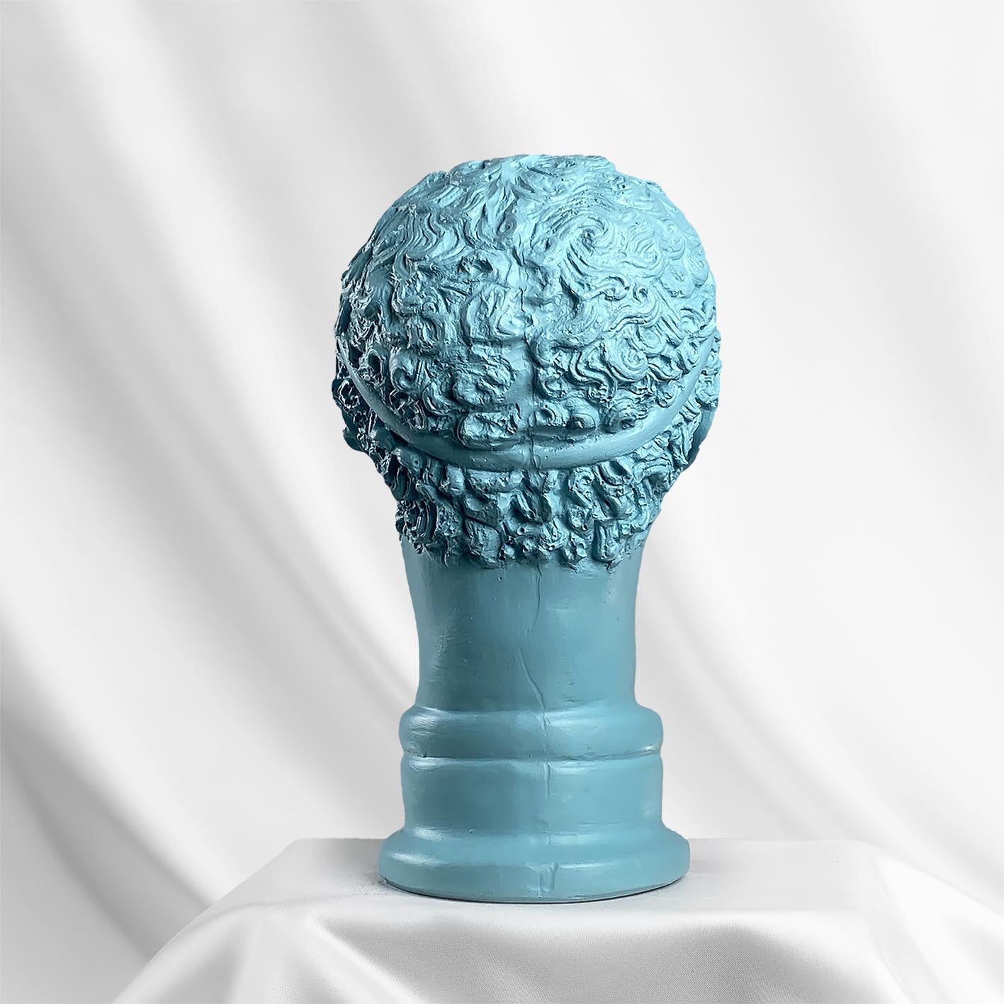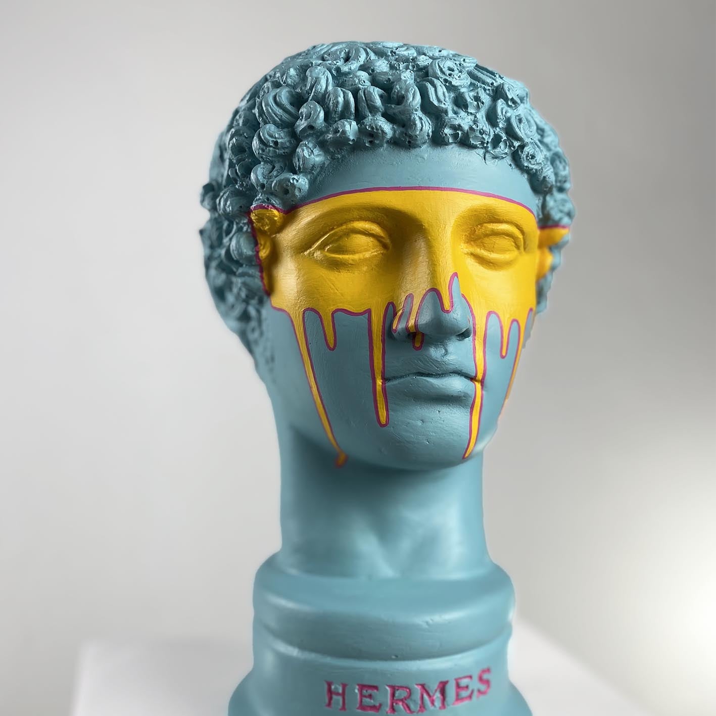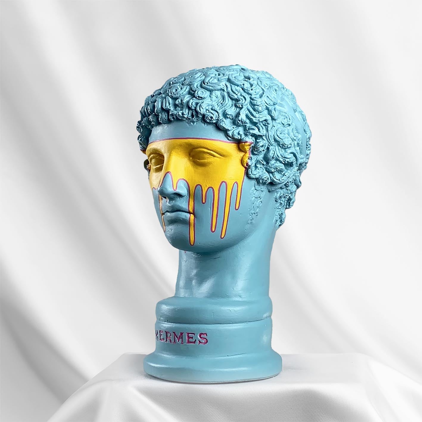 Hermes "Yellow Mask" Sculpture is a stunning piece that showcases a unique blend of colors and artistry. This sculpture is executed in a vibrant Tiffany Blue, complemented by striking yellow paint on its eyes, creating a visually dynamic effect.