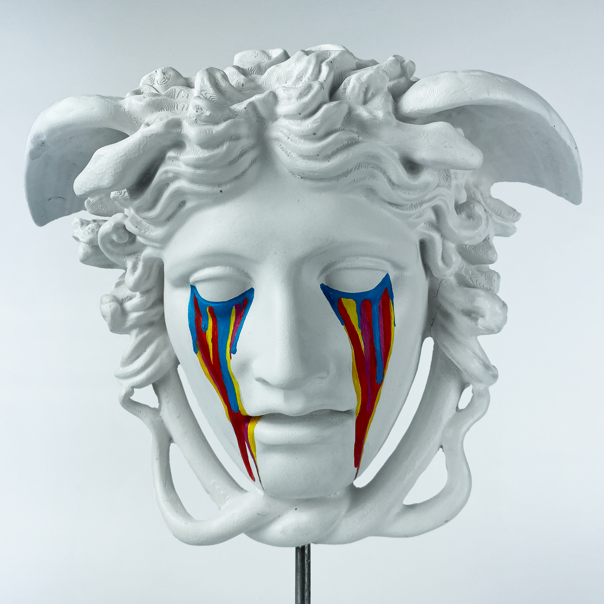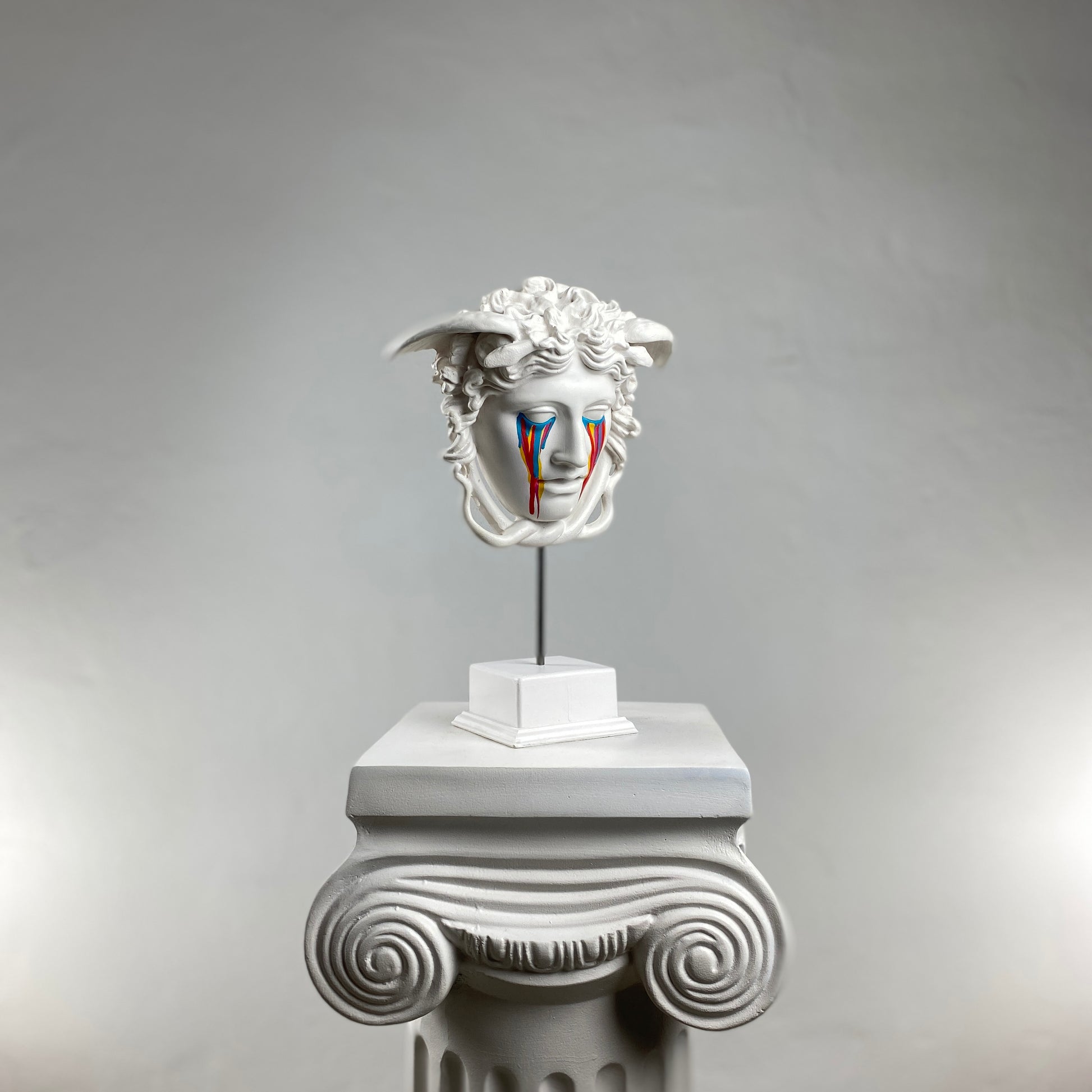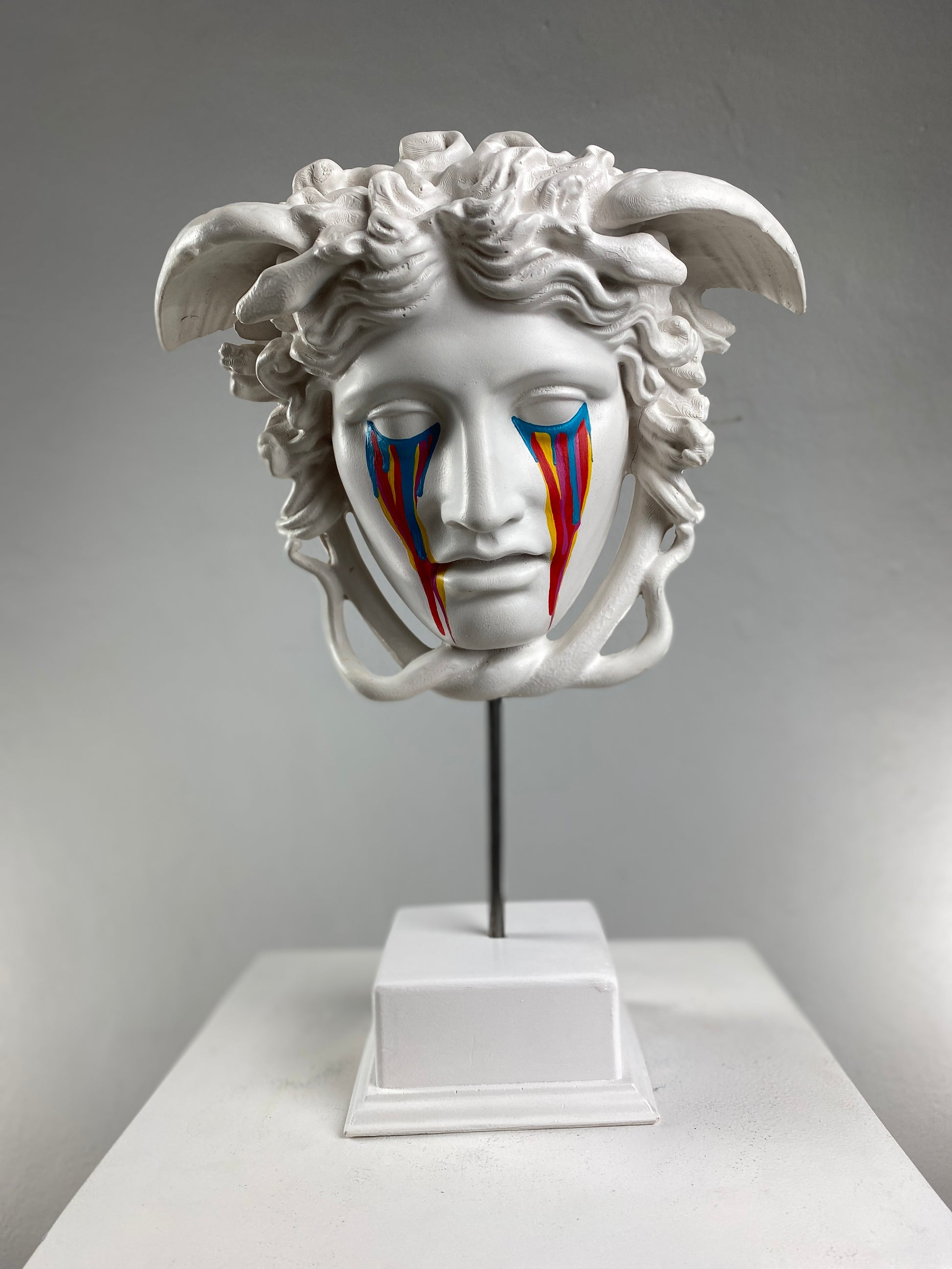 The Medusa "Nightmare" sculpture reimagines the iconic Gorgon with a hauntingly beautiful twist. Handcrafted in classic white, Medusa’s serene yet unsettling expression is contrasted by vibrant, colorful tears streaming down her face. These bold, vivid accents symbolize the chaos and beauty of her mythological curse. This piece captures both the mystery and drama of the Medusa myth while offering a contemporary and artistic touch to any space. A striking addition to any modern or eclectic interior, it invites conversation and admiration.