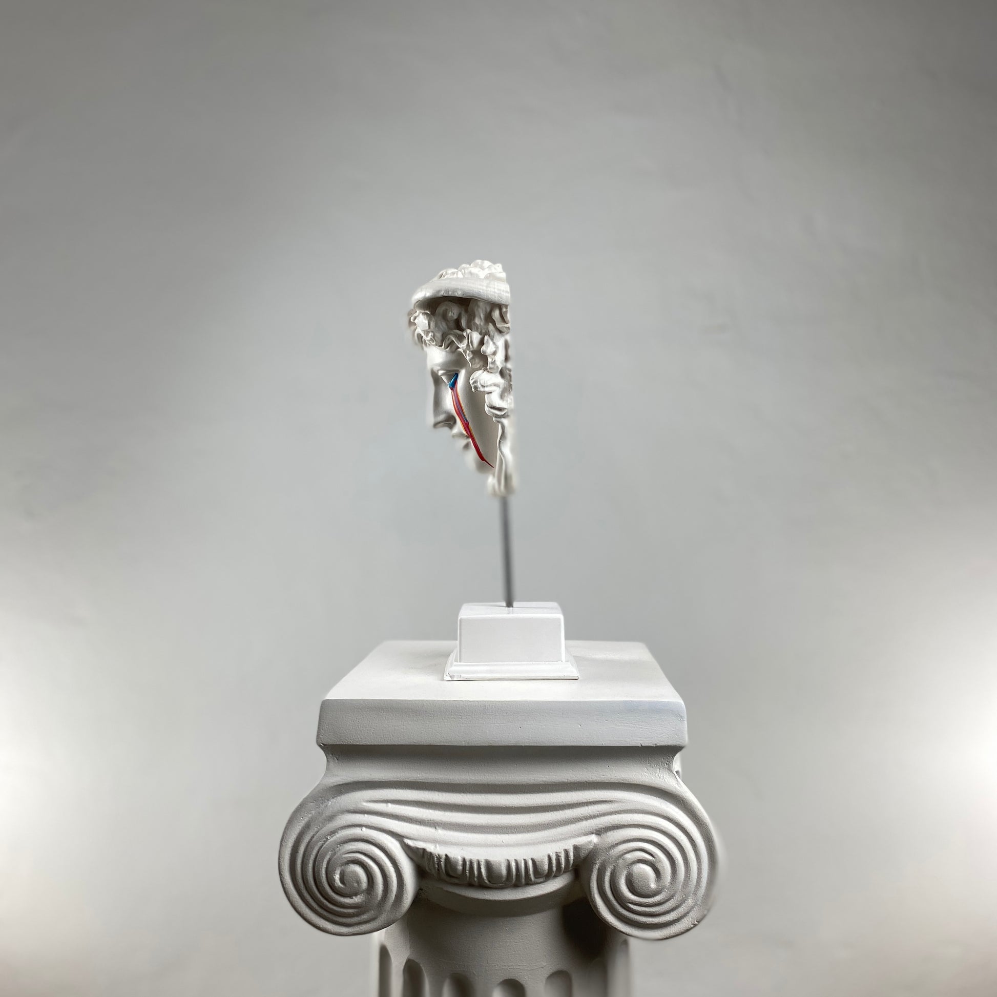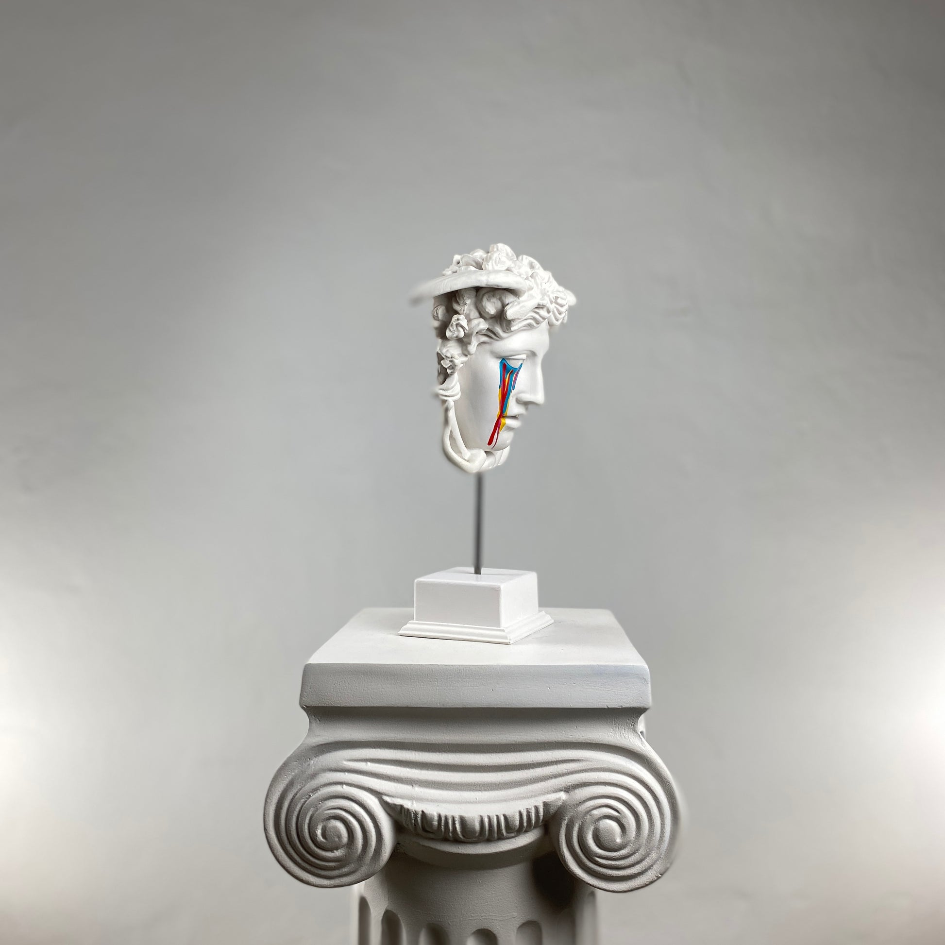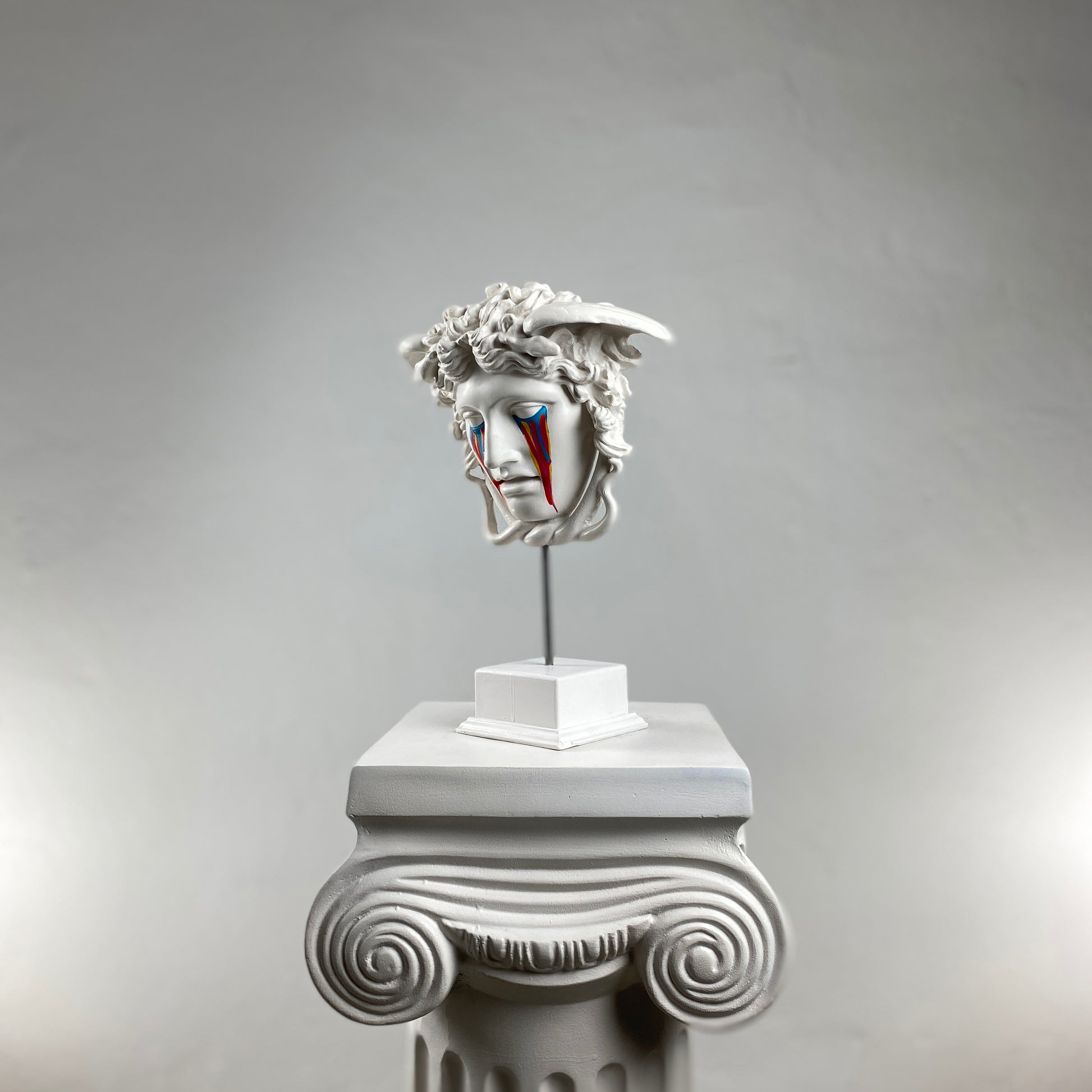 The Medusa "Nightmare" sculpture reimagines the iconic Gorgon with a hauntingly beautiful twist. Handcrafted in classic white, Medusa’s serene yet unsettling expression is contrasted by vibrant, colorful tears streaming down her face. These bold, vivid accents symbolize the chaos and beauty of her mythological curse. This piece captures both the mystery and drama of the Medusa myth while offering a contemporary and artistic touch to any space. A striking addition to any modern or eclectic interior, it invites conversation and admiration.