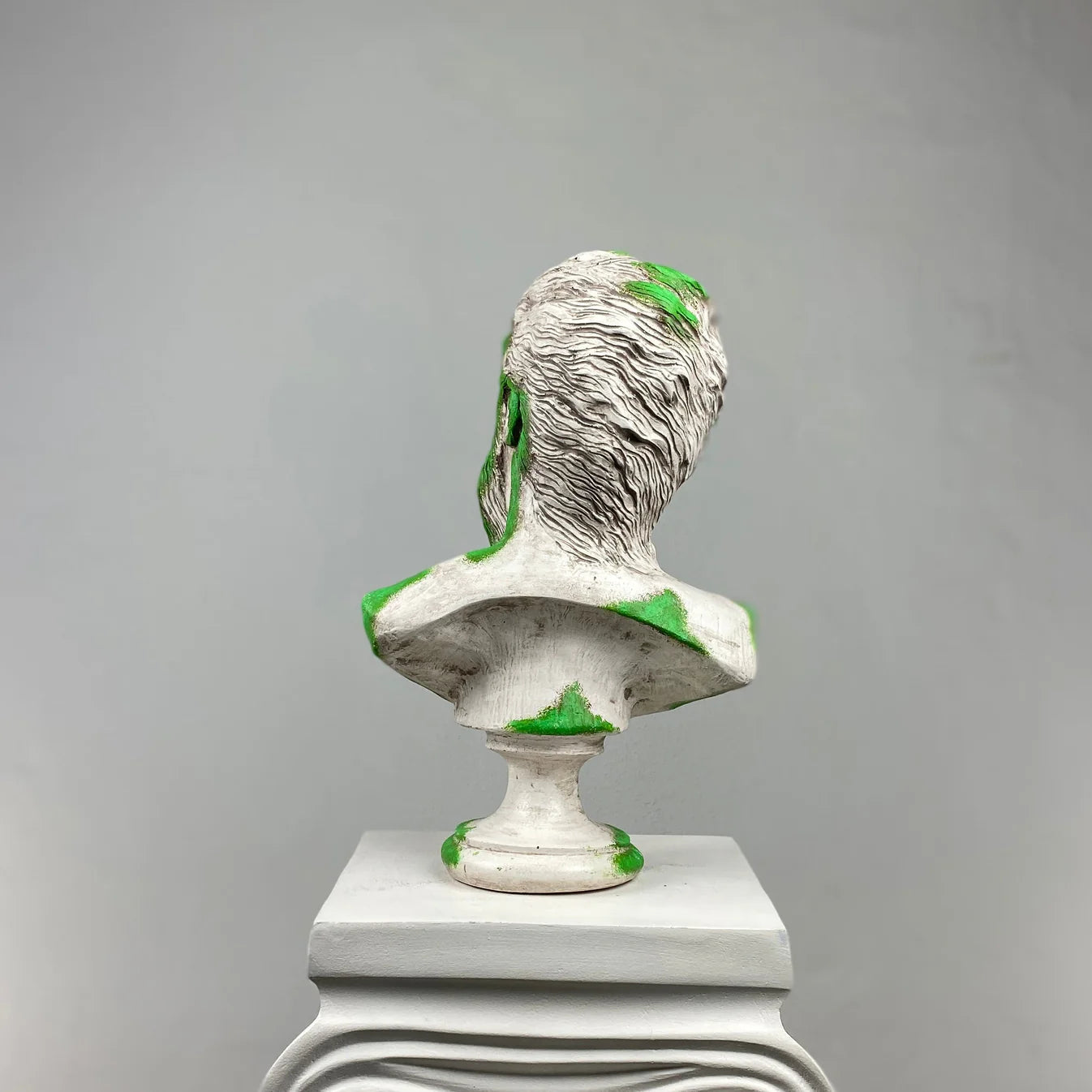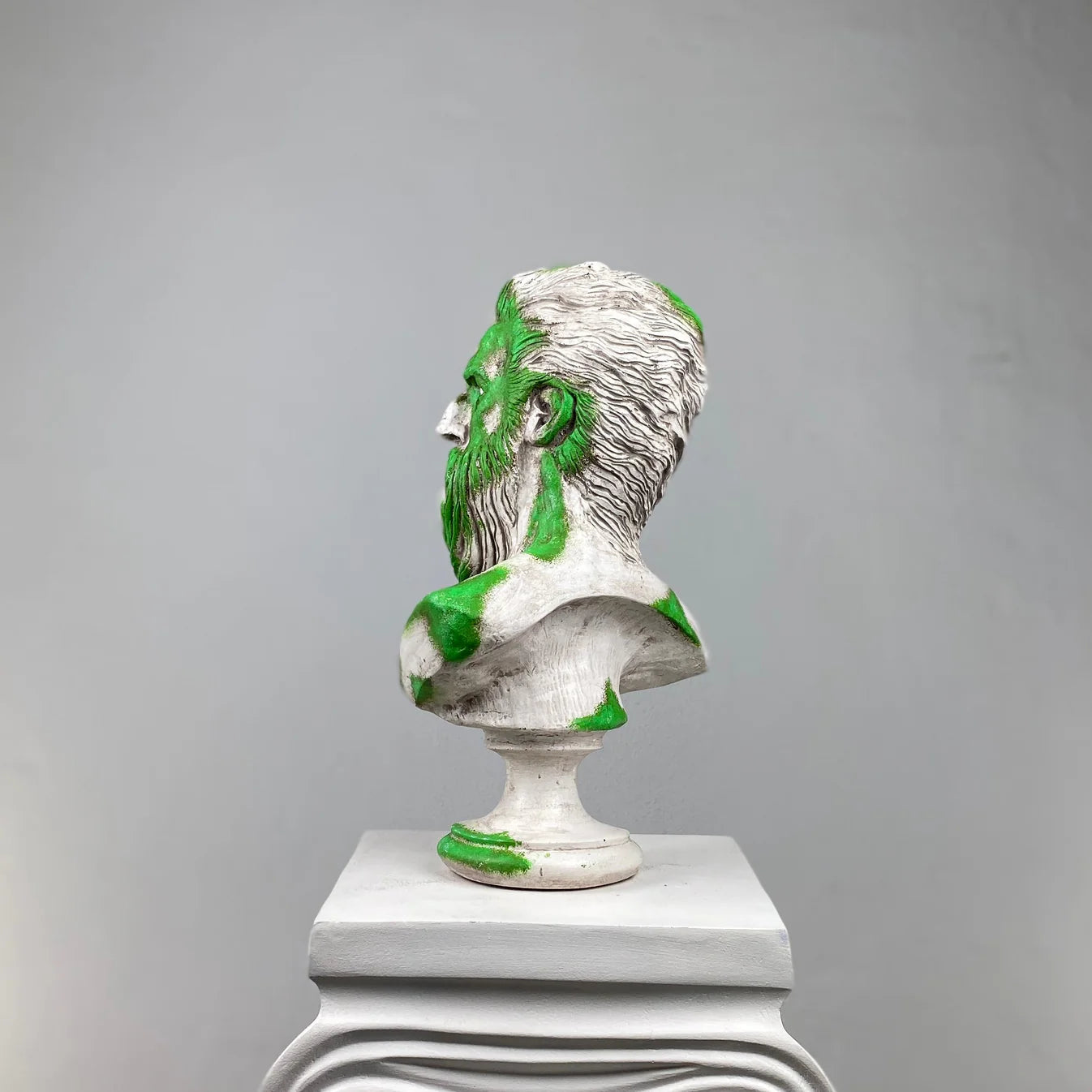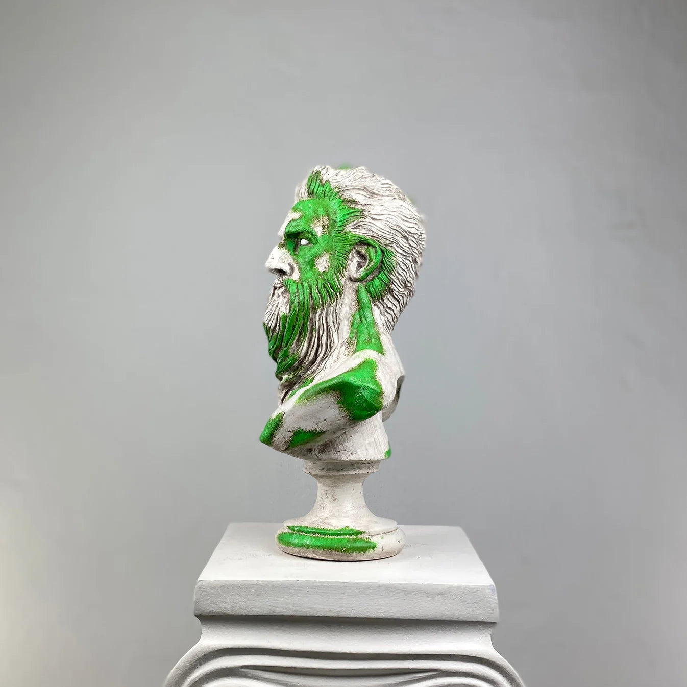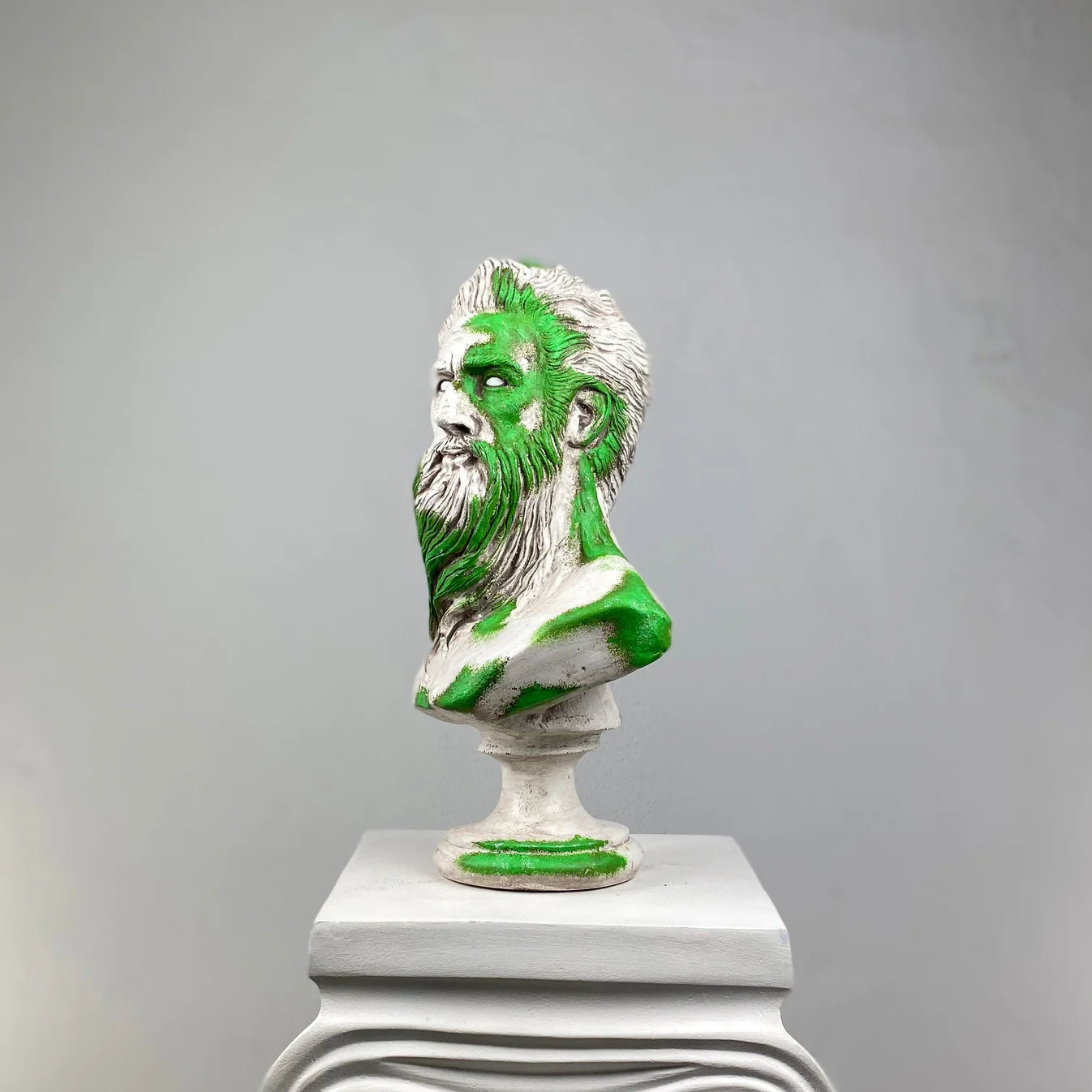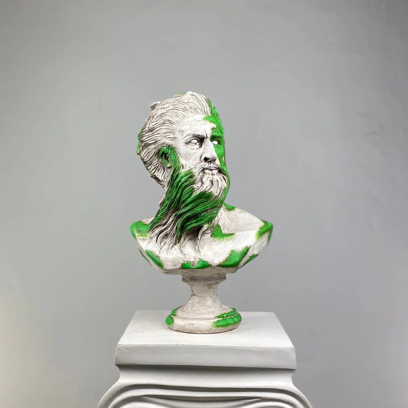 The Poseidon “Mossy” Sculpture captures the essence of the sea god through a bold interplay of natural tones. Its hand-painted green accents evoke the look of sea moss and ocean waves embracing aged marble — a tribute to the timeless power of the sea. Each sculpture is handcrafted, merging mythic strength with organic beauty to create a commanding statement piece for modern interiors.