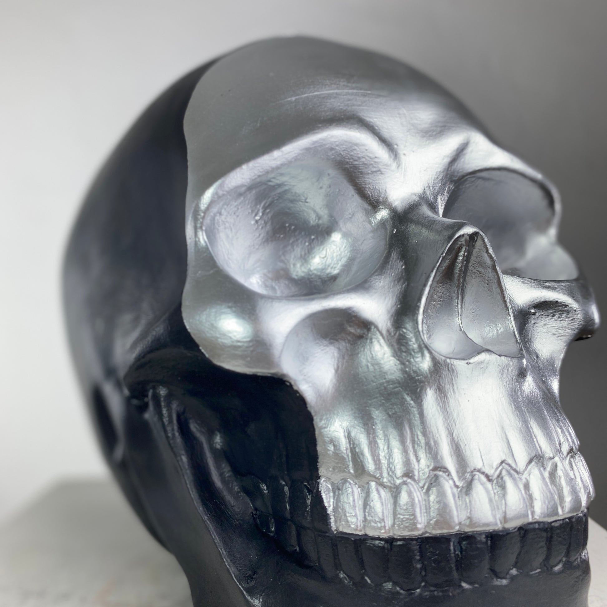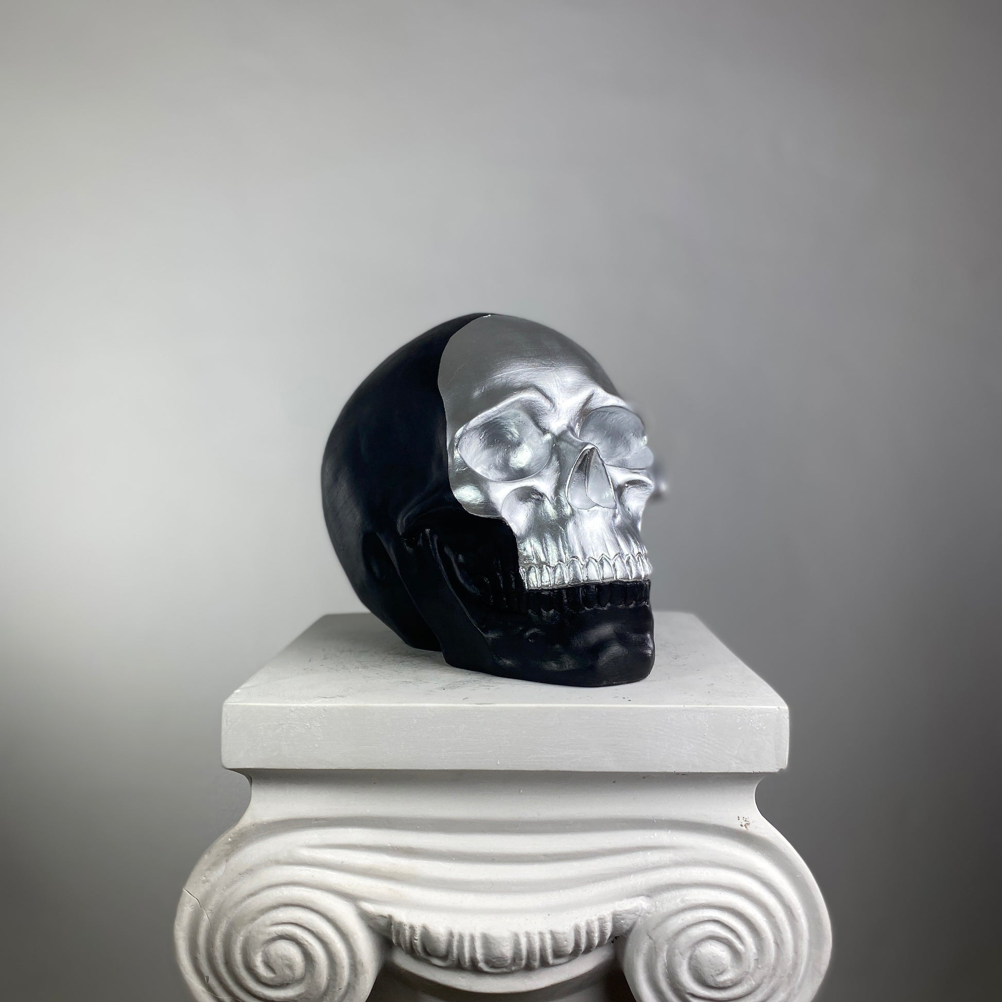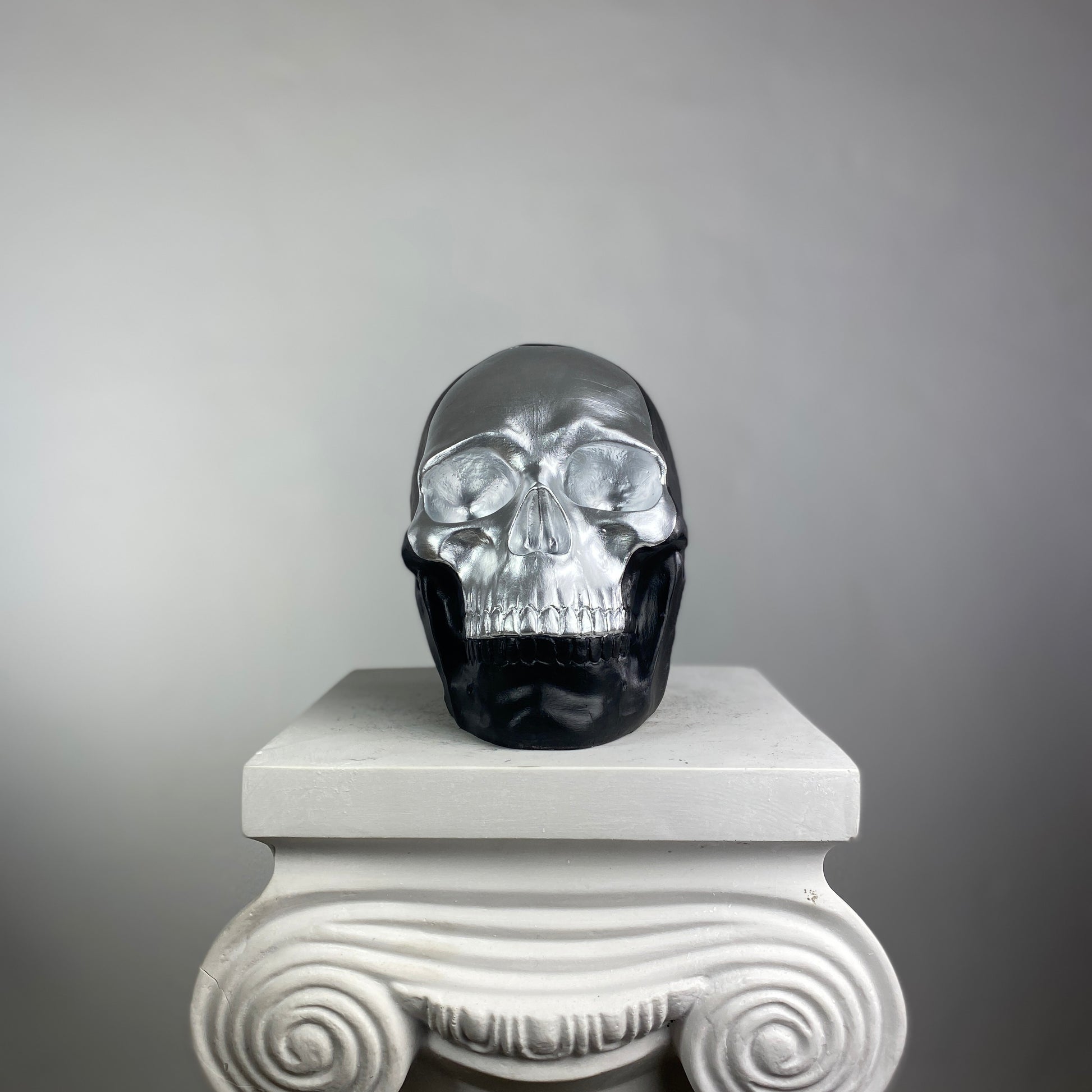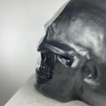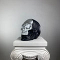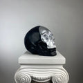 A striking contrast of darkness and light, the Skull "Silver Face" Sculpture redefines modern macabre elegance. This bold piece features a high-gloss silver face that gleams against a matte black cranium, creating a dramatic, almost futuristic duality. The reflective silver surface mimics liquid metal, while the shadowy black backdrop adds depth and mystery—perfect for those who appreciate minimalist edge with a touch of the surreal.