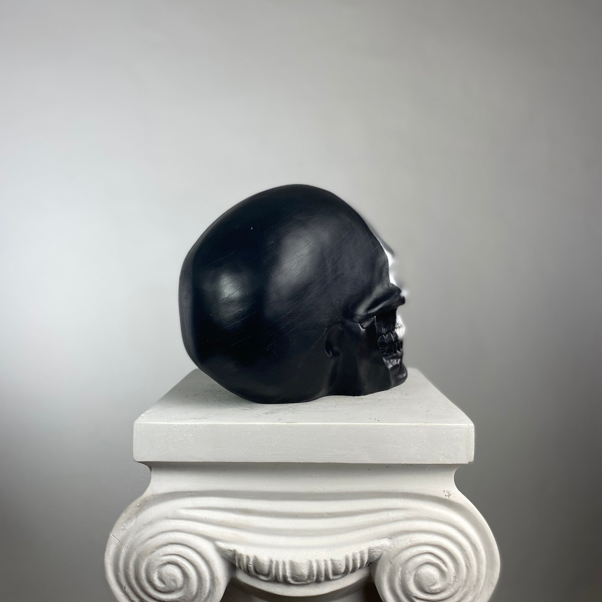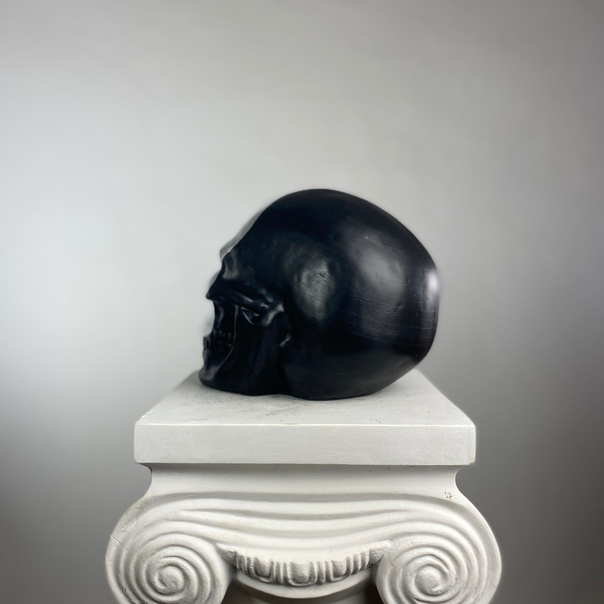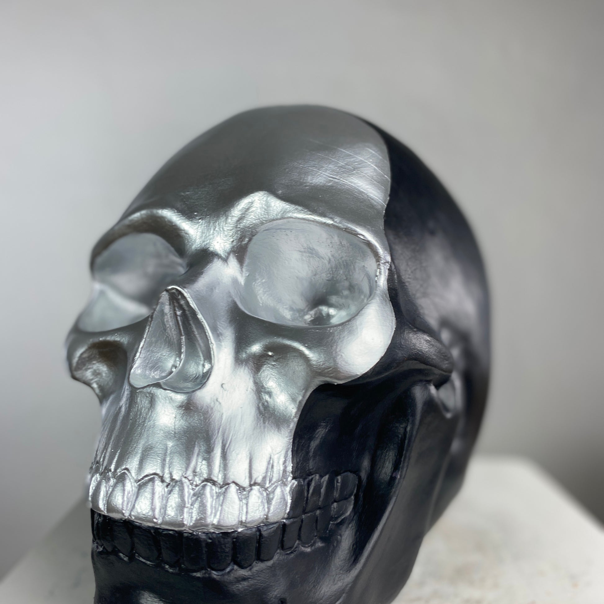 A striking contrast of darkness and light, the Skull "Silver Face" Sculpture redefines modern macabre elegance. This bold piece features a high-gloss silver face that gleams against a matte black cranium, creating a dramatic, almost futuristic duality. The reflective silver surface mimics liquid metal, while the shadowy black backdrop adds depth and mystery—perfect for those who appreciate minimalist edge with a touch of the surreal.
