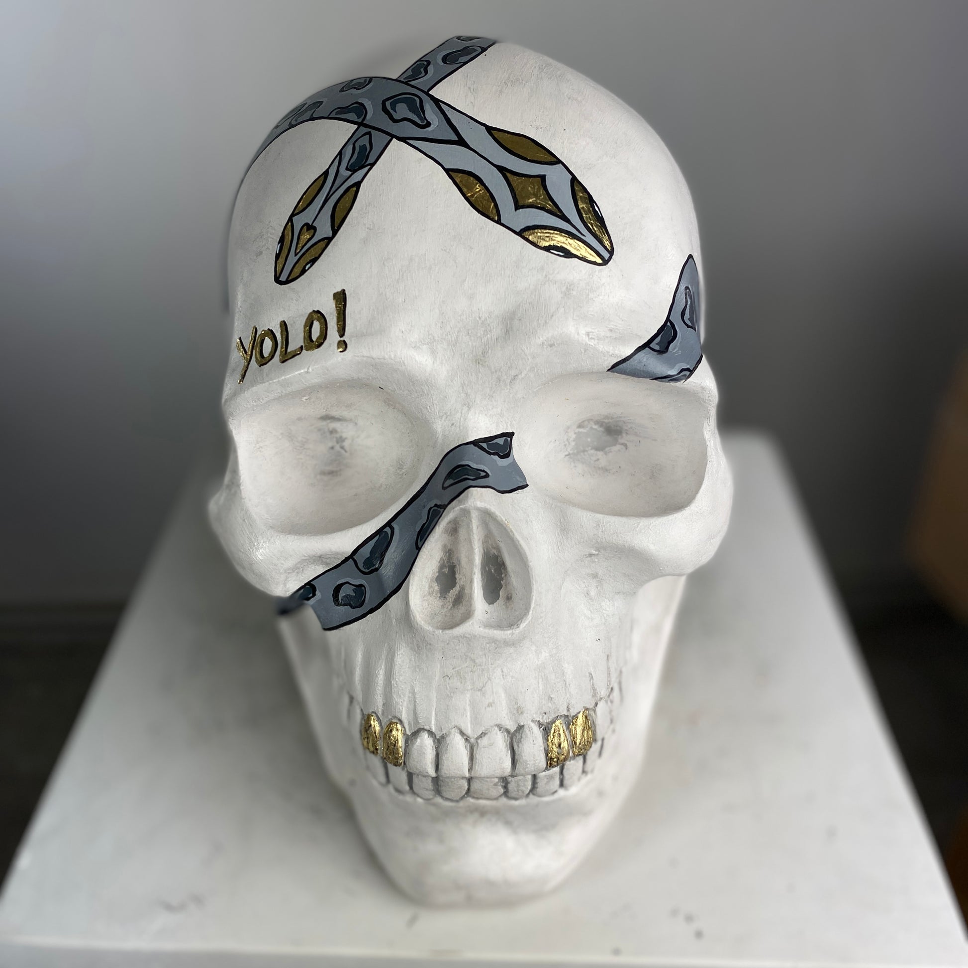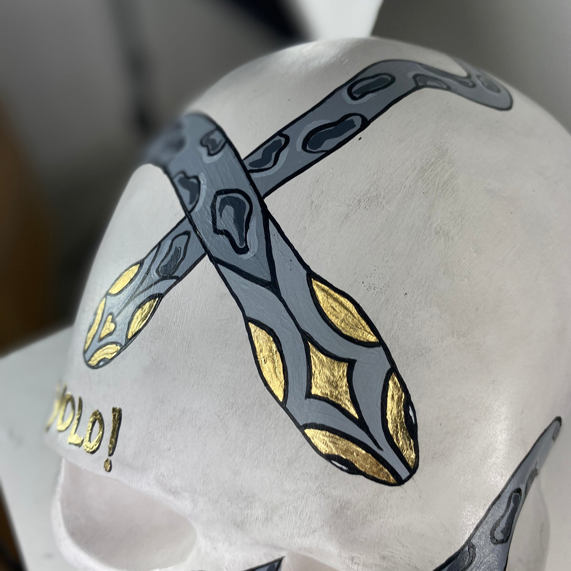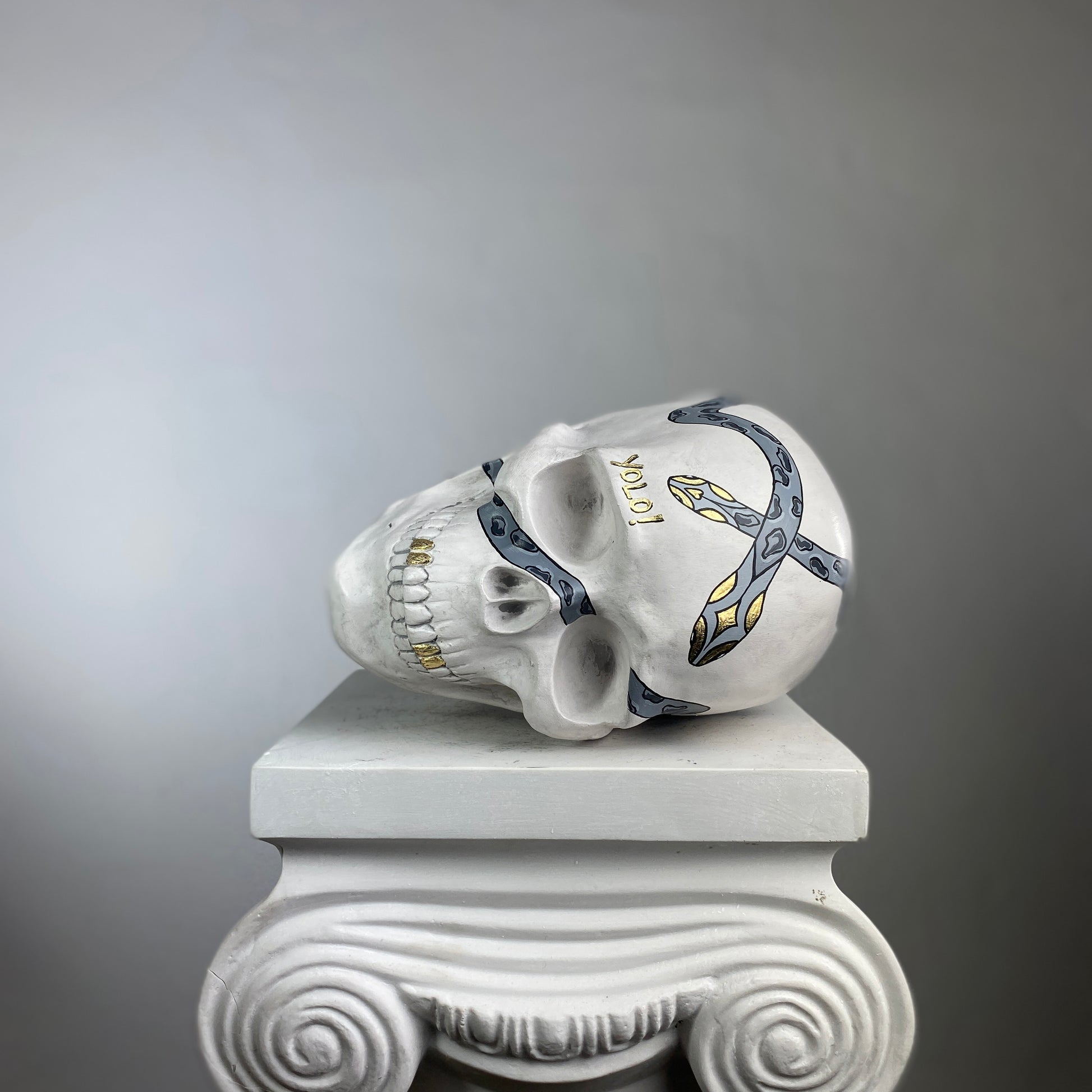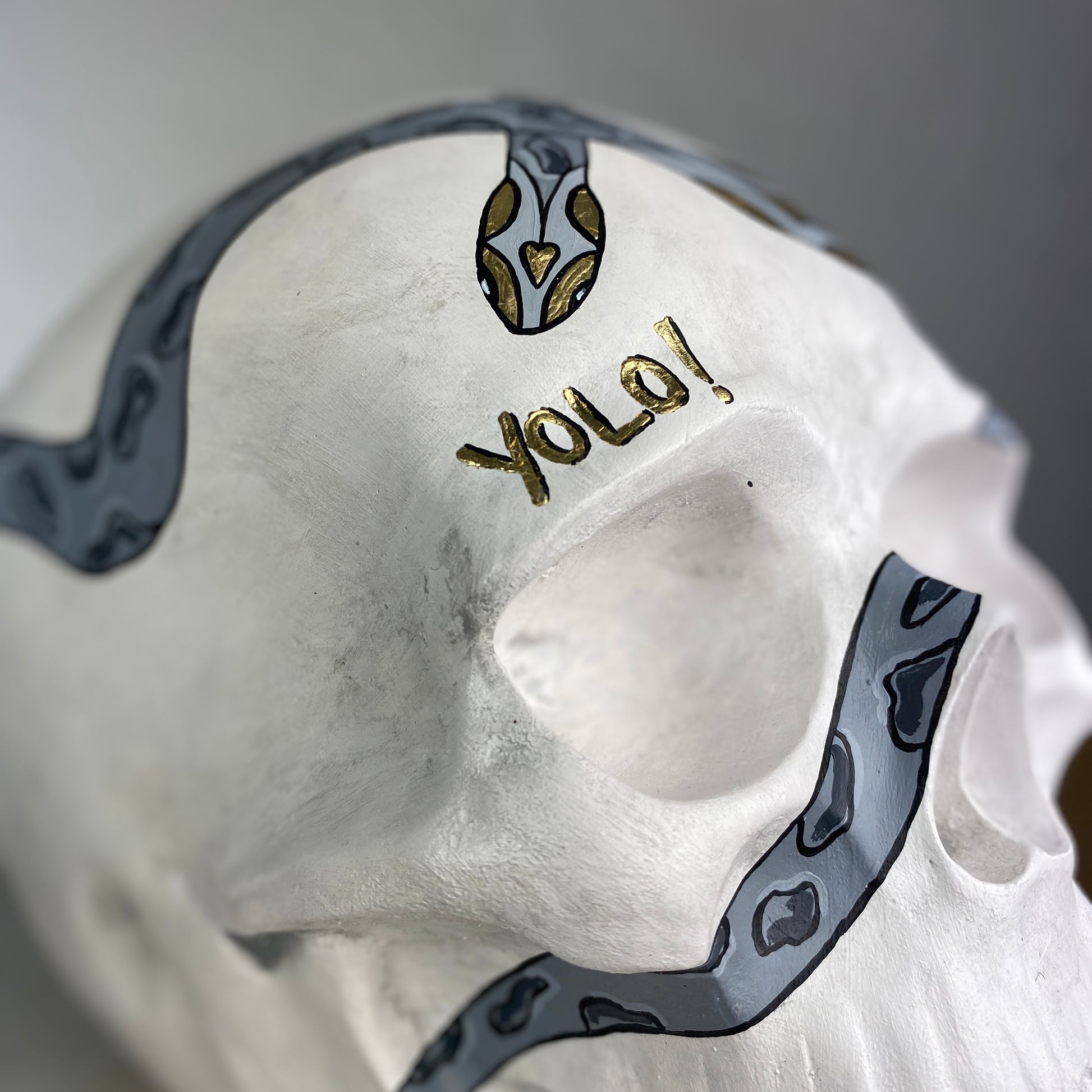 "You Only Live Once" takes on a bold new meaning with the Skull "YOLO" Sculpture—a striking fusion of mortality and rebellious energy. This intricately designed piece features two sinuous snakes coiled dramatically around the skull, chair green-grey scales shimmering with gold accents for a touch of luxury. Above the left eye, the word "YOU" is painted in a sharp, modern font, adding an edgy, contemporary twist to this symbolic masterpiece.