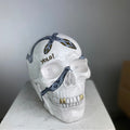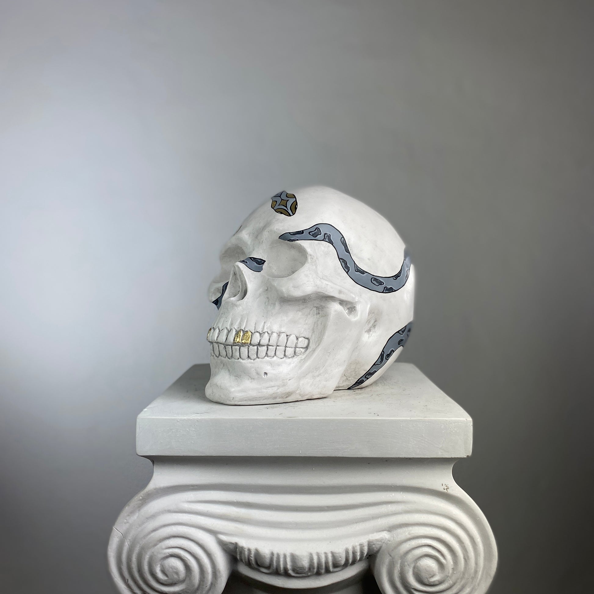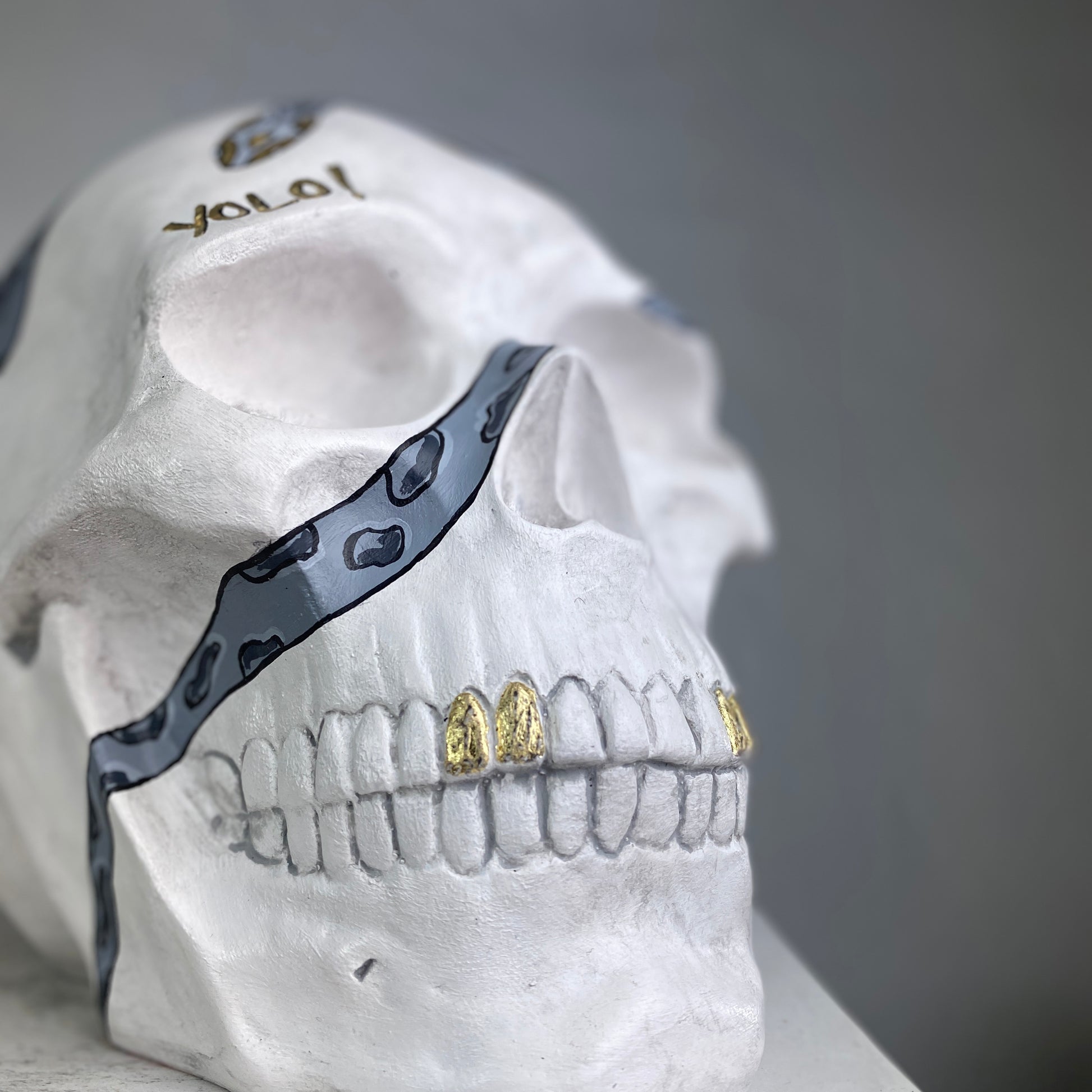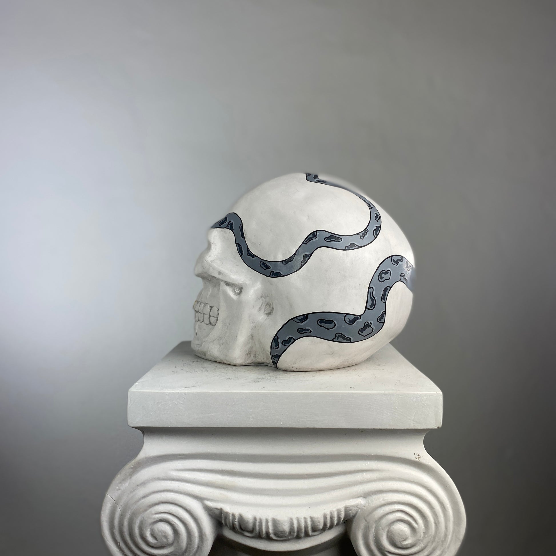 "You Only Live Once" takes on a bold new meaning with the Skull "YOLO" Sculpture—a striking fusion of mortality and rebellious energy. This intricately designed piece features two sinuous snakes coiled dramatically around the skull, chair green-grey scales shimmering with gold accents for a touch of luxury. Above the left eye, the word "YOU" is painted in a sharp, modern font, adding an edgy, contemporary twist to this symbolic masterpiece.