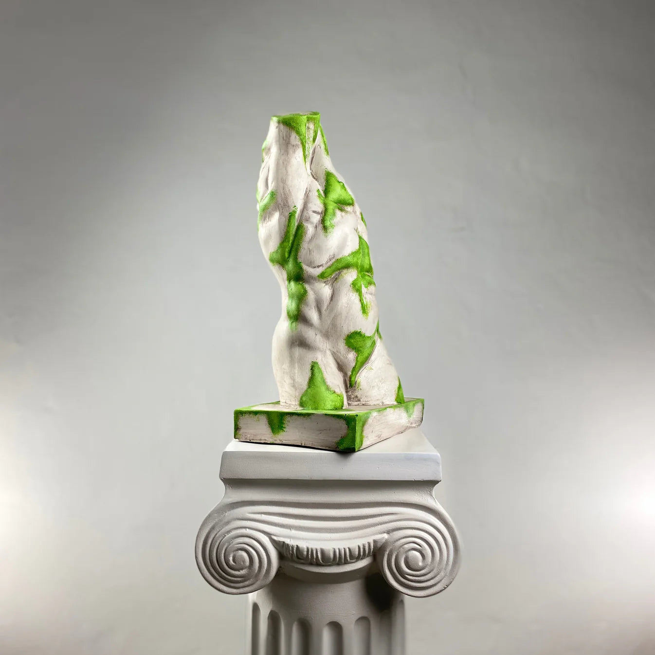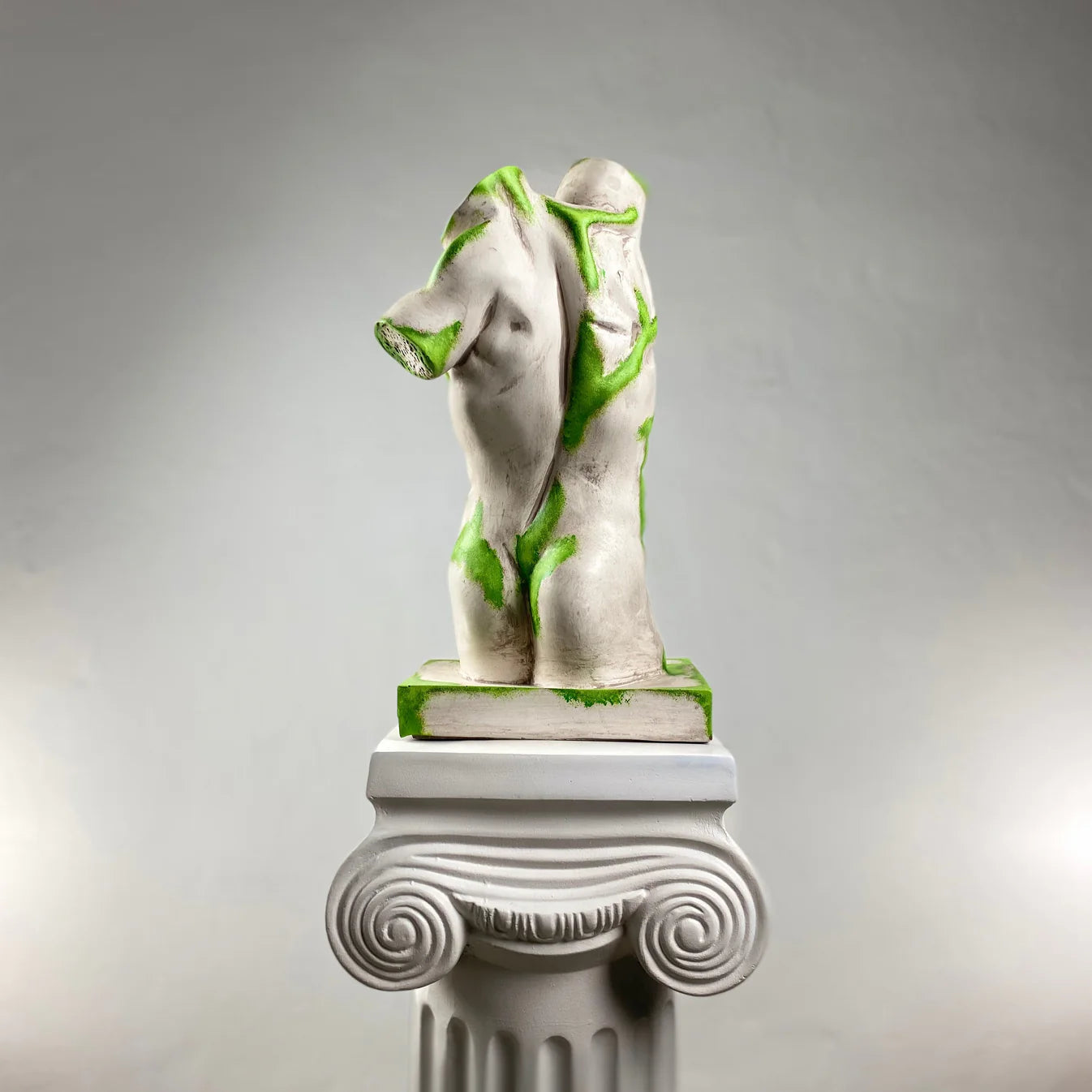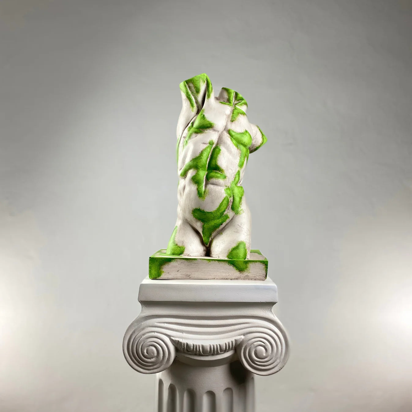 The Torso "Nature Flow" Sculpture brings timeless classical form to life with a fresh, modern twist. Featuring a matte white finish enhanced by vivid green accents, this handcrafted piece embodies the fusion of purity and vitality. The organic color flow creates the illusion of life emerging through stone — a perfect blend of elegance, strength, and renewal. Each sculpture is made from polyresin with marble crushes and hand-painted with water-based acrylics by our artists.