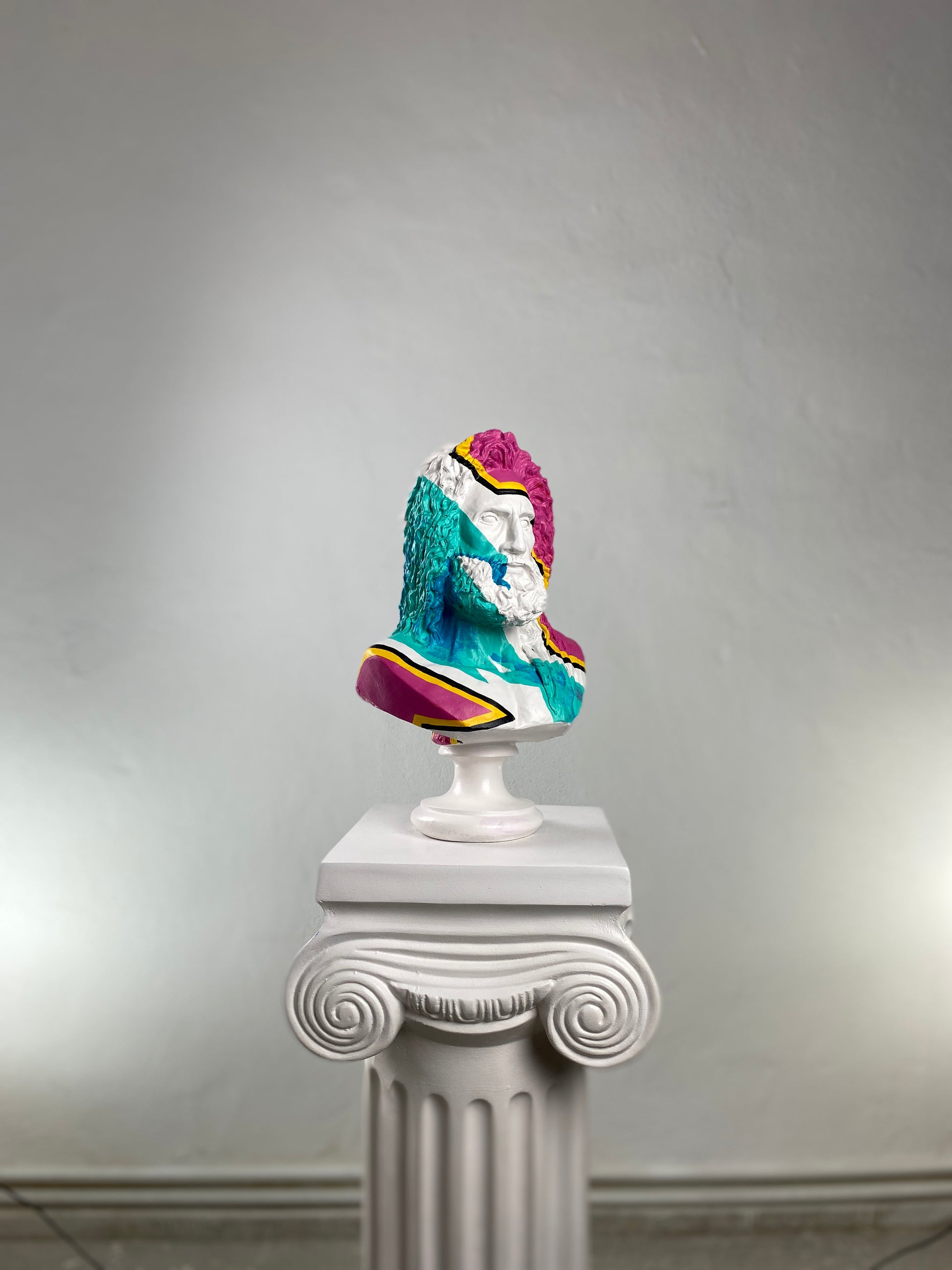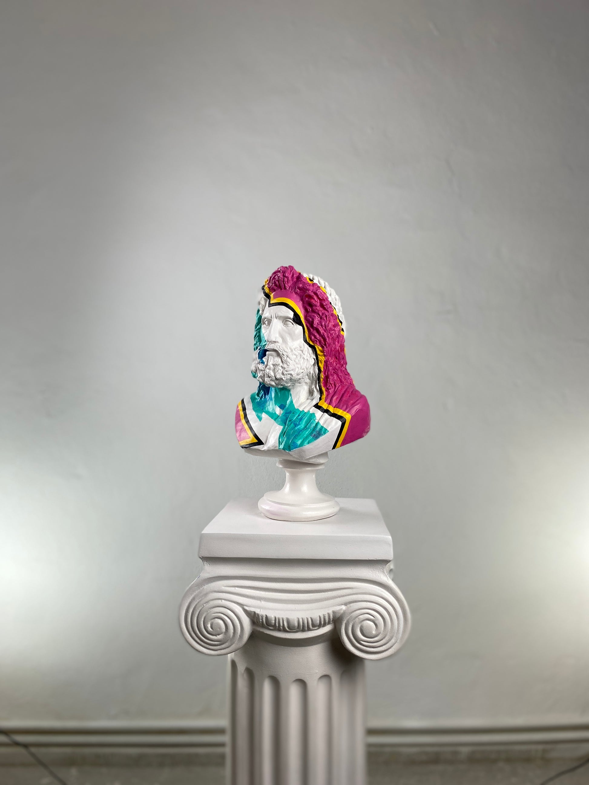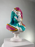 The Zeus "Color Stripes" sculpture brings the power of the Greek god into the contemporary art world with bold, expressive flair. Sculpted in classic white and hand-painted with energetic strokes of green, pink, and other vibrant hues, this modern interpretation transforms the King of the Gods into a striking art object. Each piece is individually painted, giving it a one-of-a-kind personality. Perfect for interiors that blend tradition with creativity, this sculpture adds divine drama and color to any space.