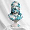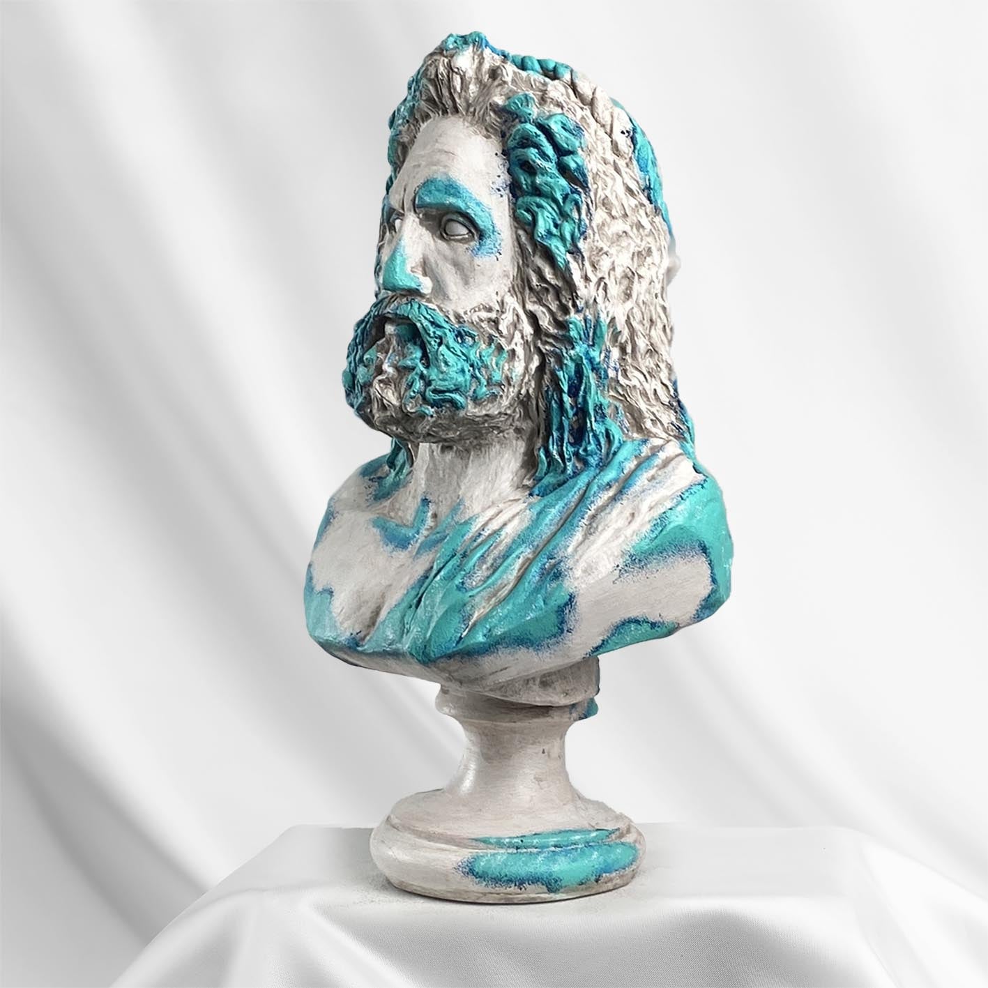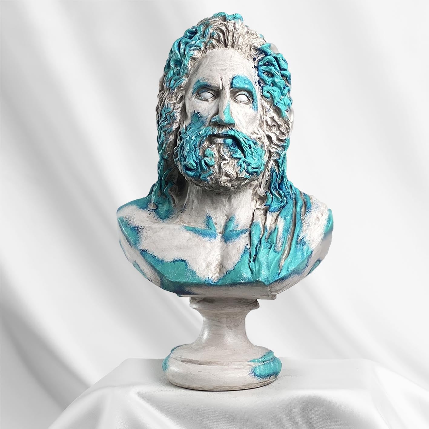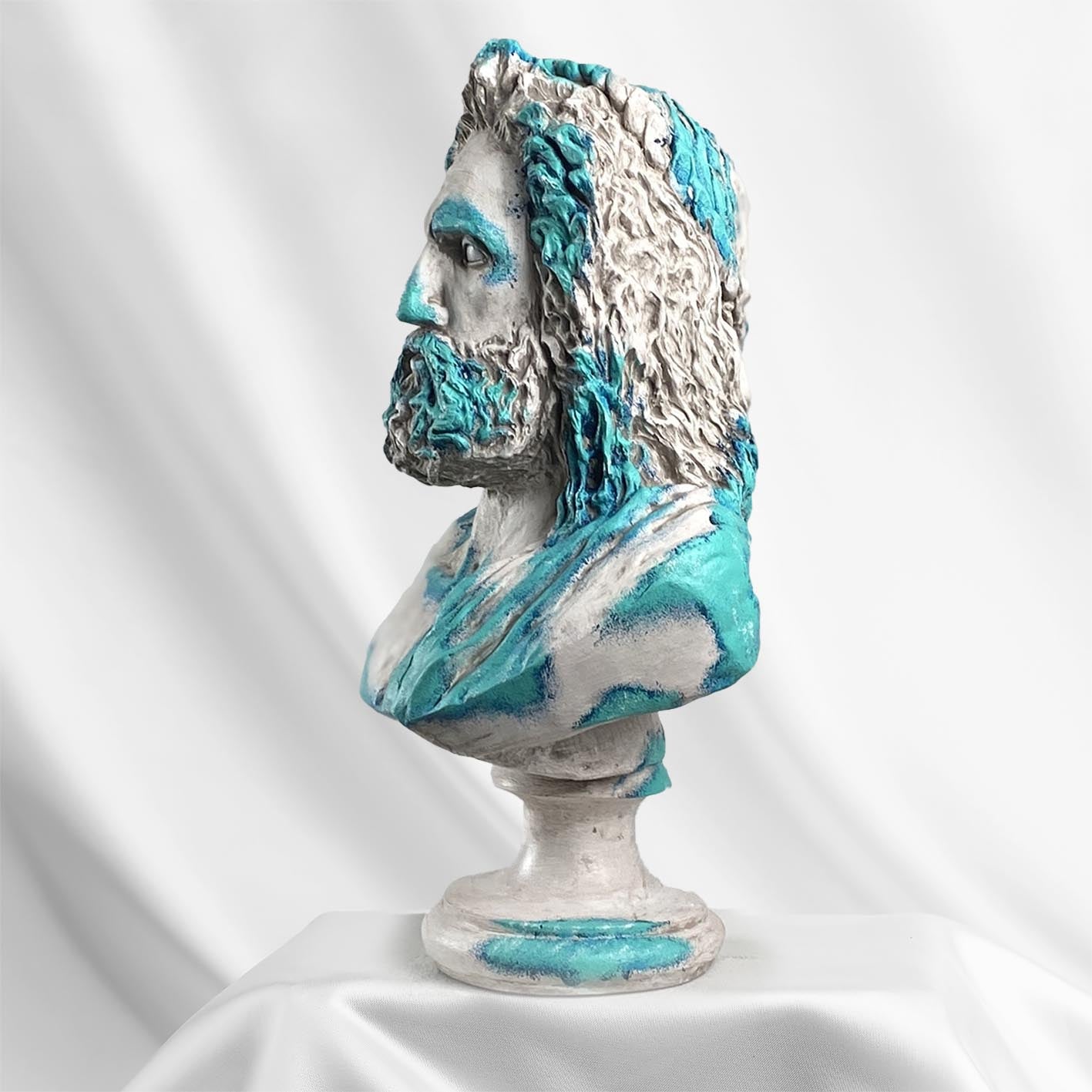 Zeus Coral Blue Sculpture showcases a timeless design in classic white, beautifully accented with coral blue highlights. This elegant piece embodies strength and sophistication, making it a remarkable addition to any art collection or home decor.