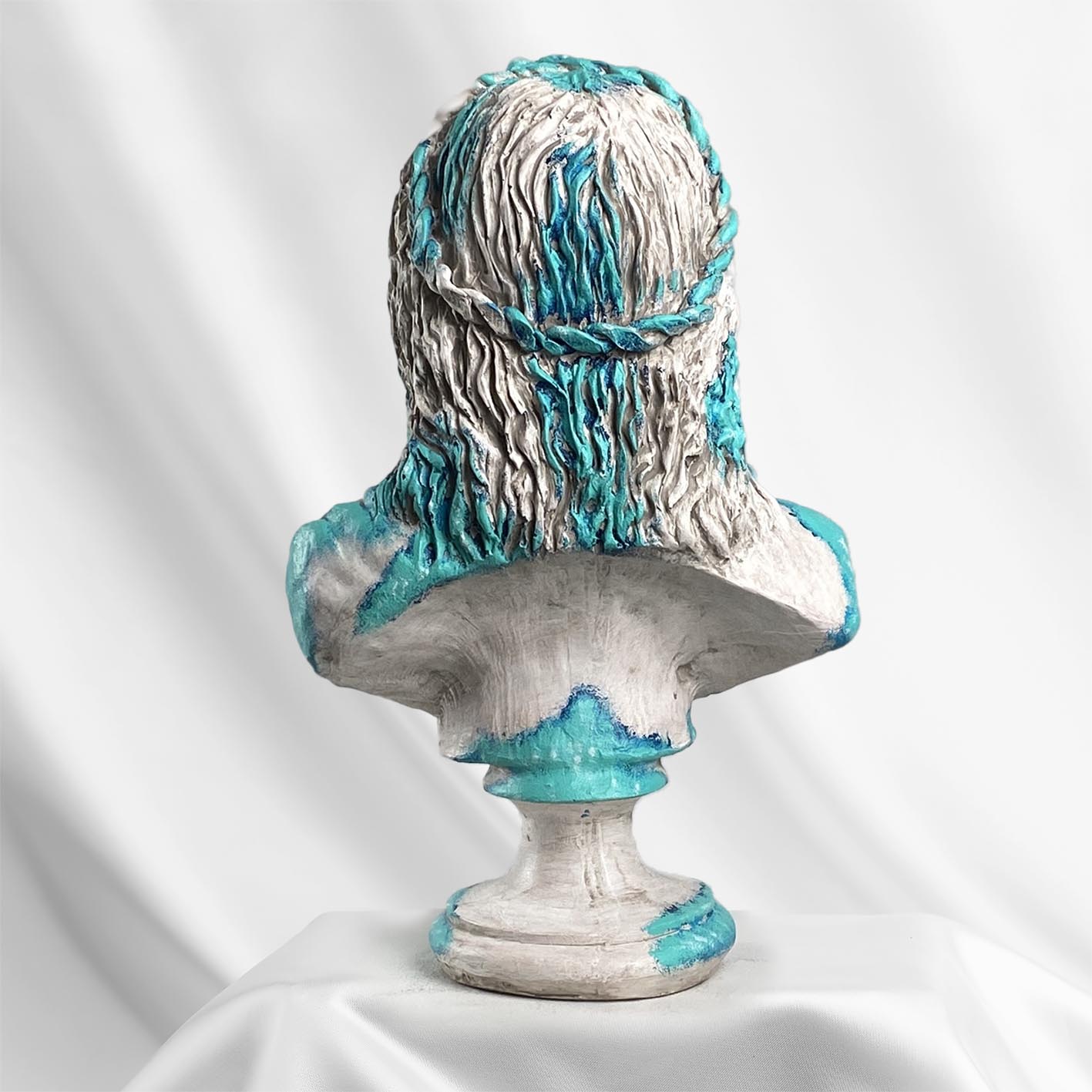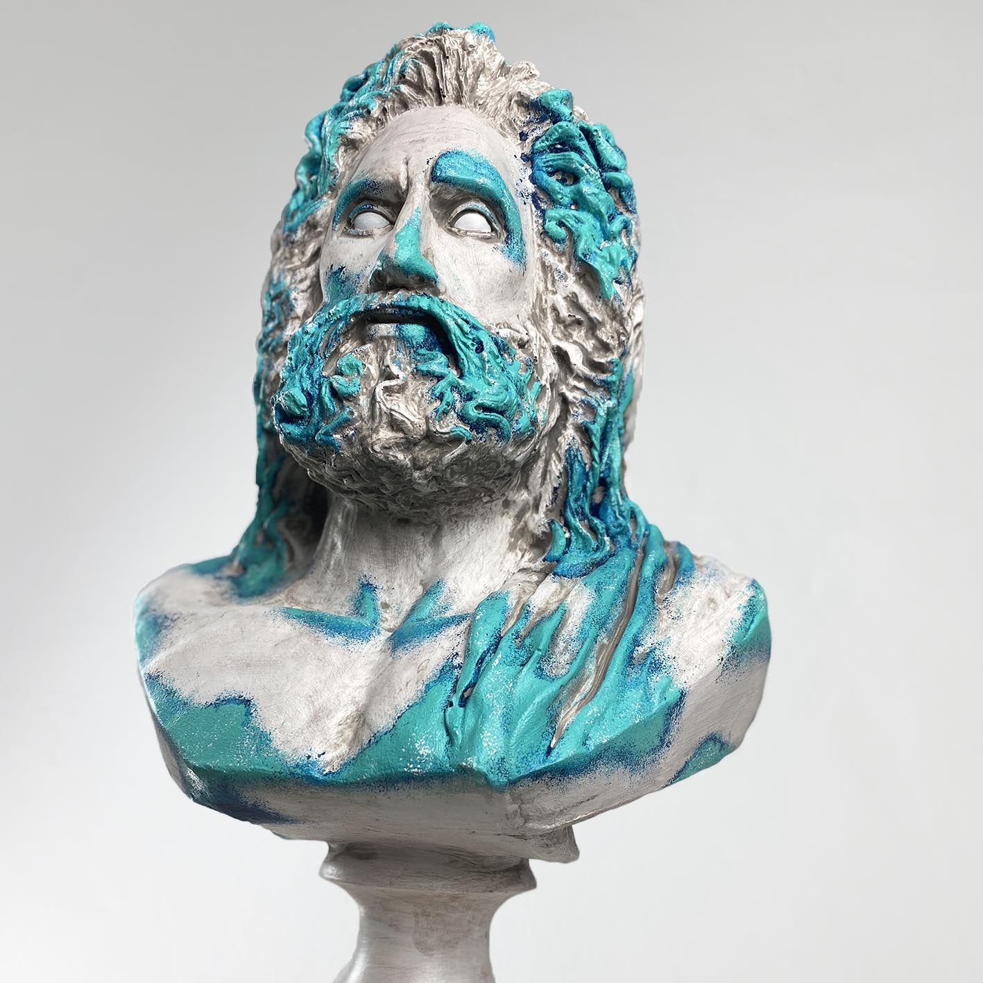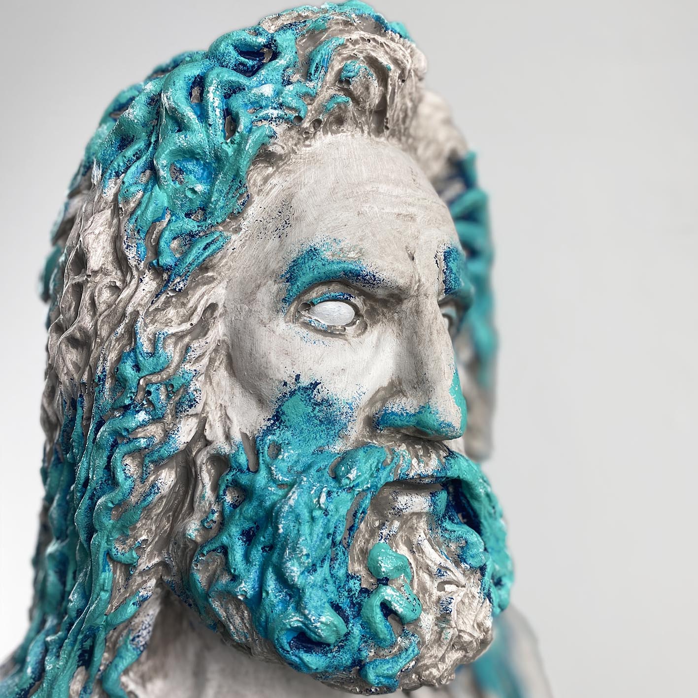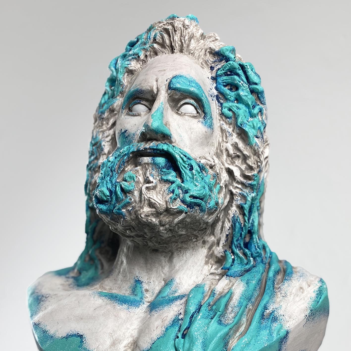 Zeus Coral Blue Sculpture showcases a timeless design in classic white, beautifully accented with coral blue highlights. This elegant piece embodies strength and sophistication, making it a remarkable addition to any art collection or home decor.