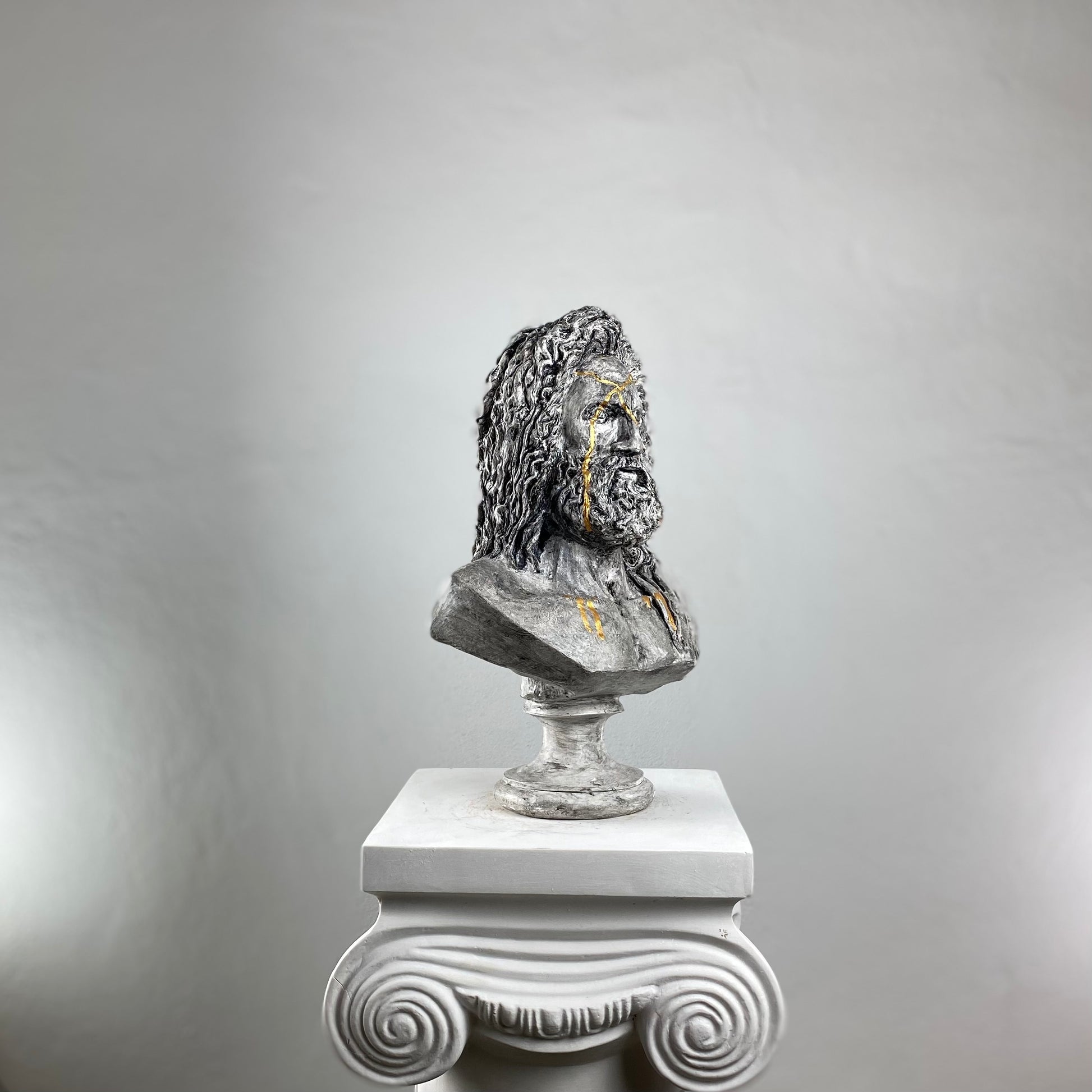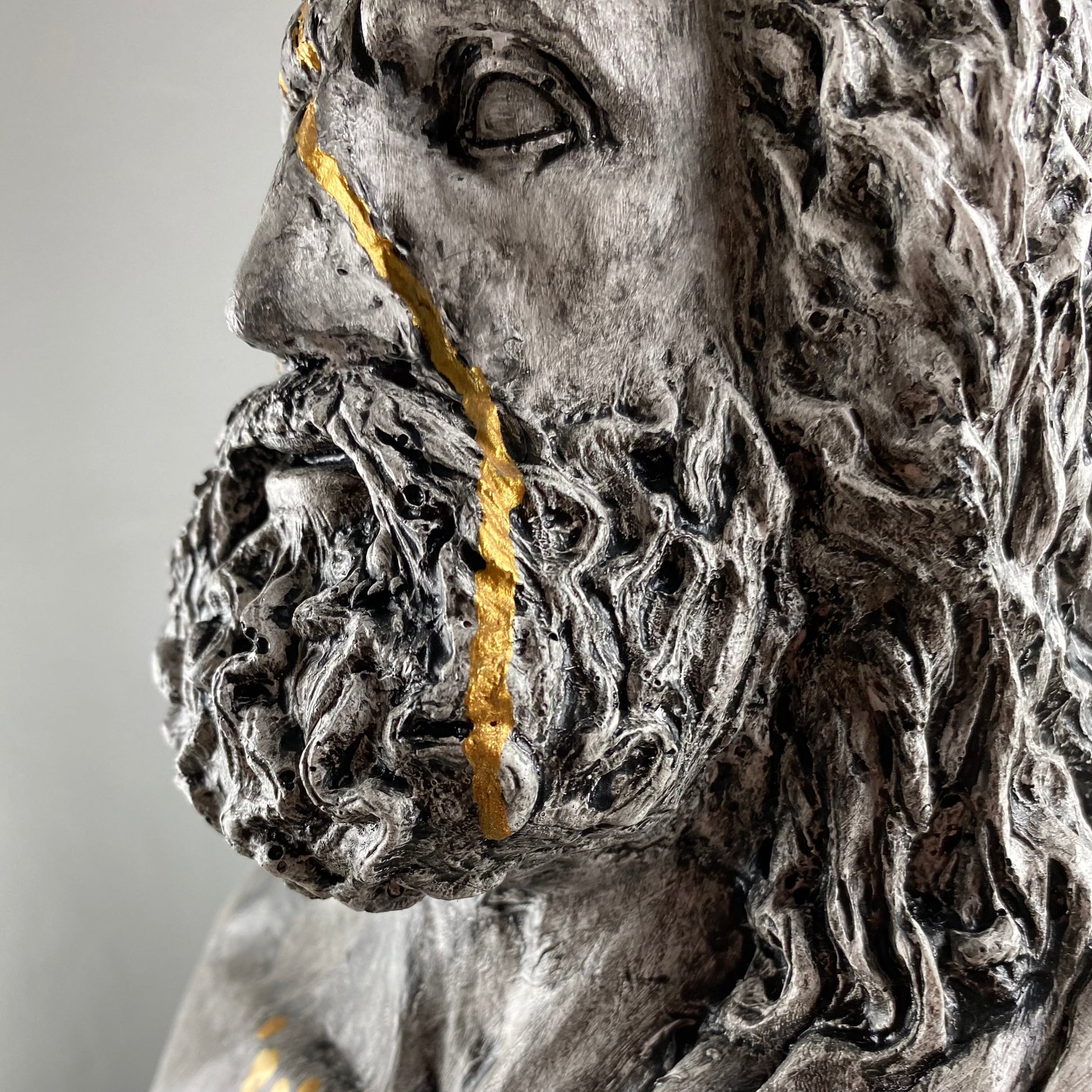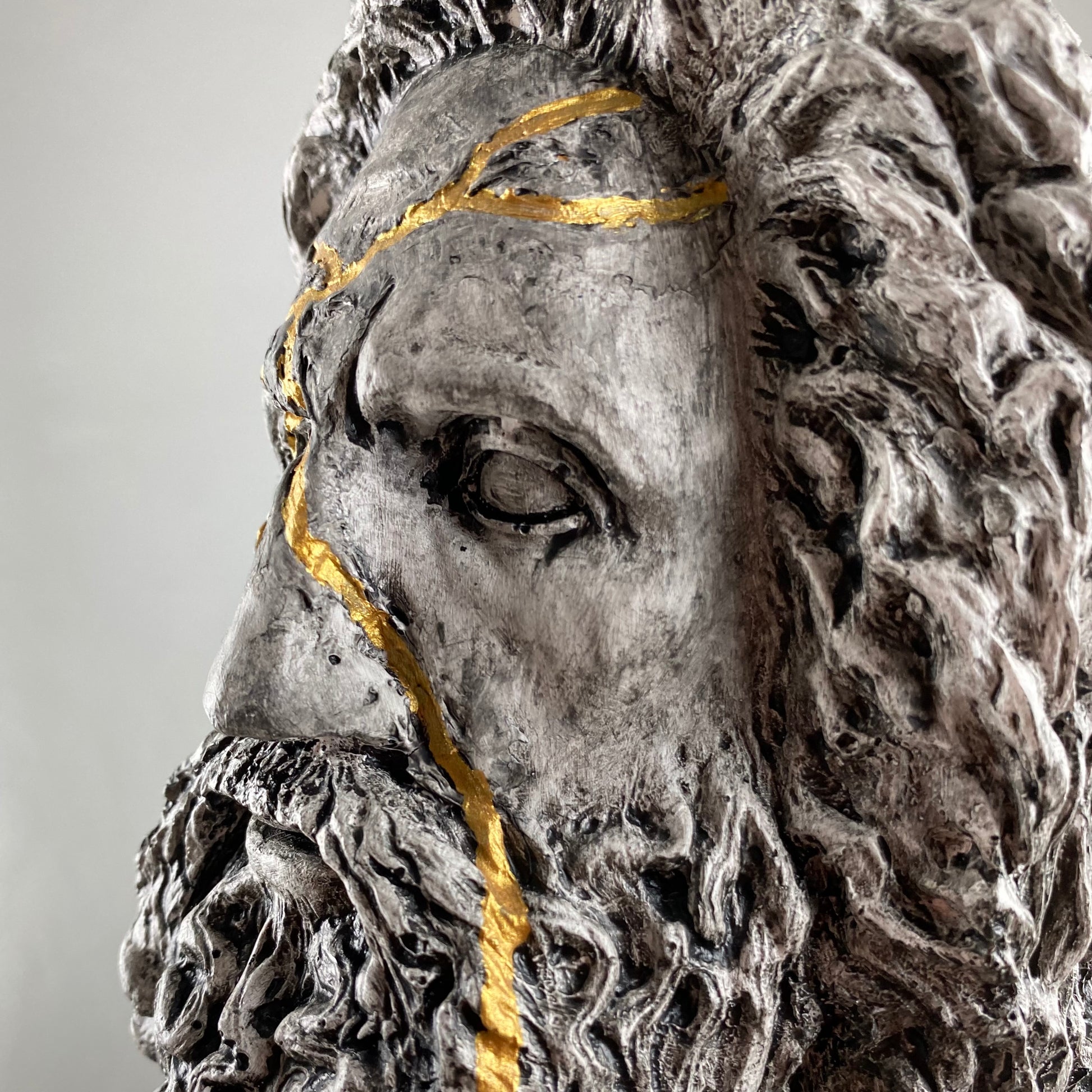 The Zeus "Golden Mark" Sculpture radiates power and divinity through a masterful balance of darkness and light. Its deep stone-gray finish is streaked with flowing lines of gold that cascade from head to beard, culminating in a symbolic golden cross upon the forehead. This handcrafted piece captures the eternal strength and wisdom of Zeus while introducing a contemporary touch of sacred artistry — ideal for interiors that celebrate sophistication and meaning.