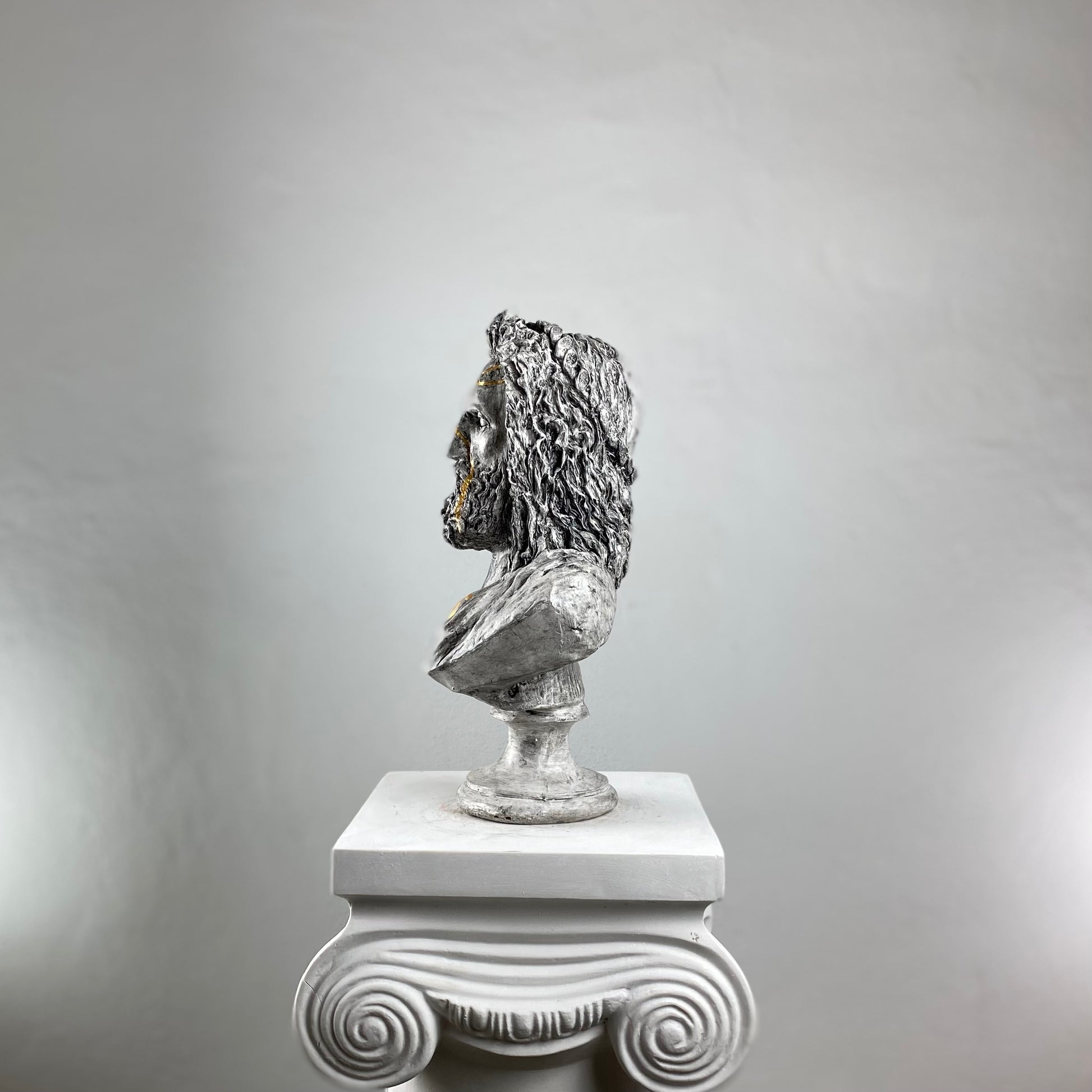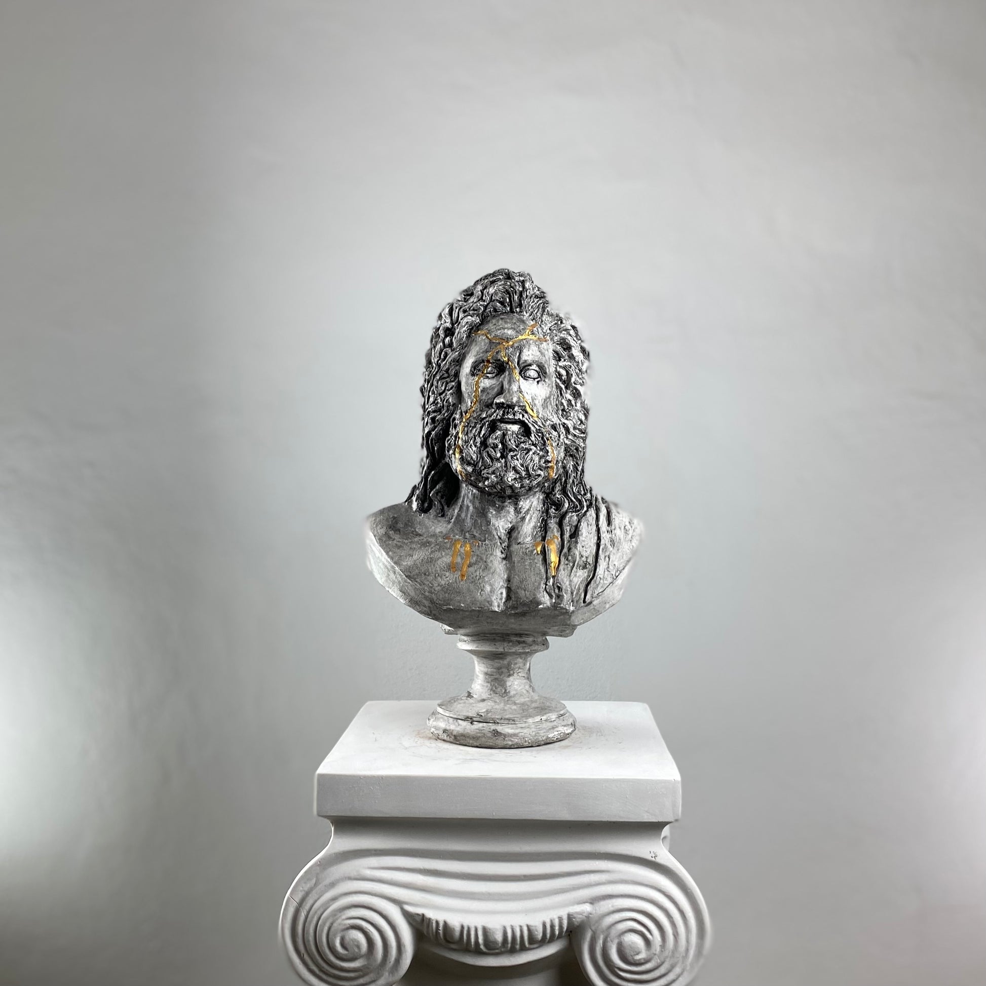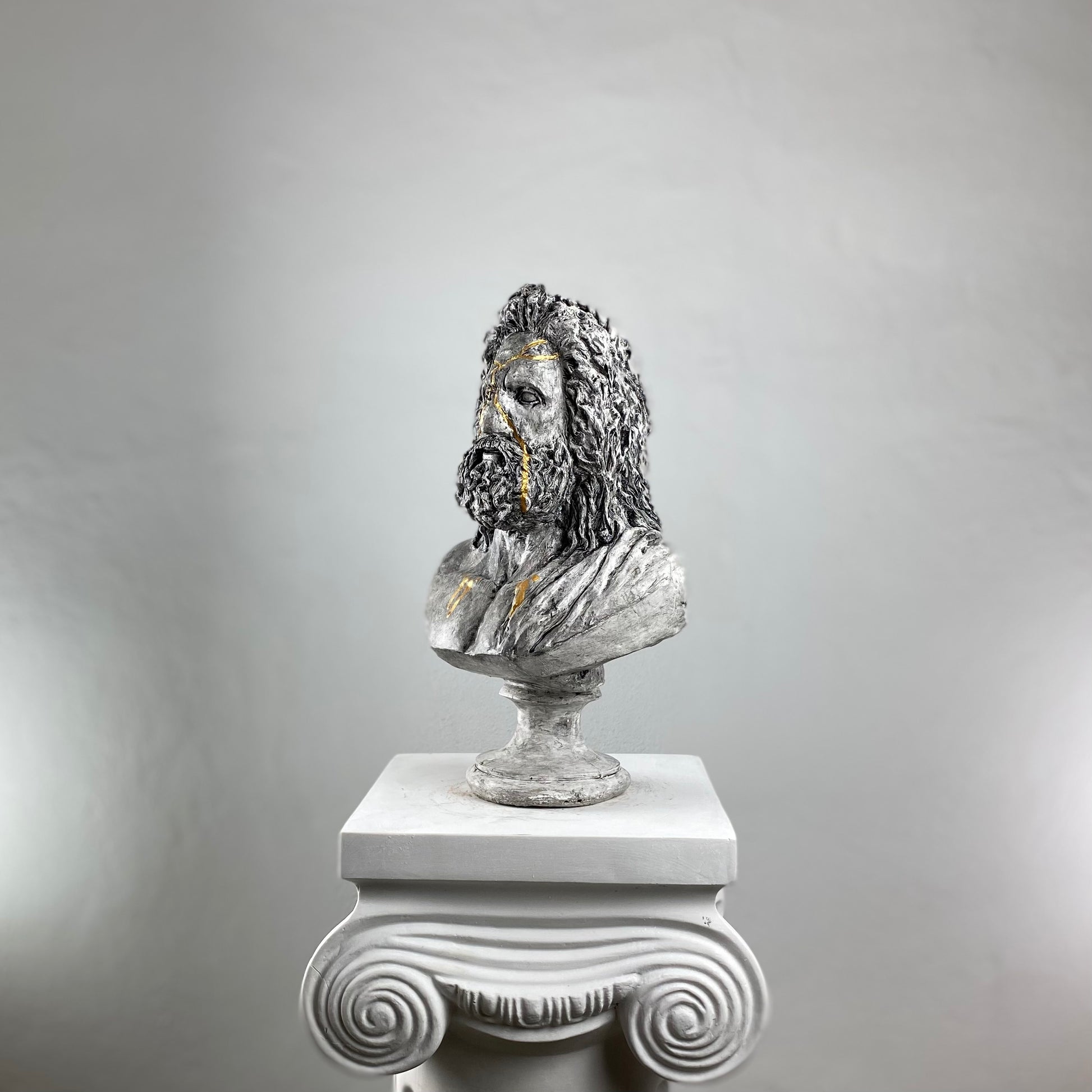 The Zeus "Golden Mark" Sculpture radiates power and divinity through a masterful balance of darkness and light. Its deep stone-gray finish is streaked with flowing lines of gold that cascade from head to beard, culminating in a symbolic golden cross upon the forehead. This handcrafted piece captures the eternal strength and wisdom of Zeus while introducing a contemporary touch of sacred artistry — ideal for interiors that celebrate sophistication and meaning.